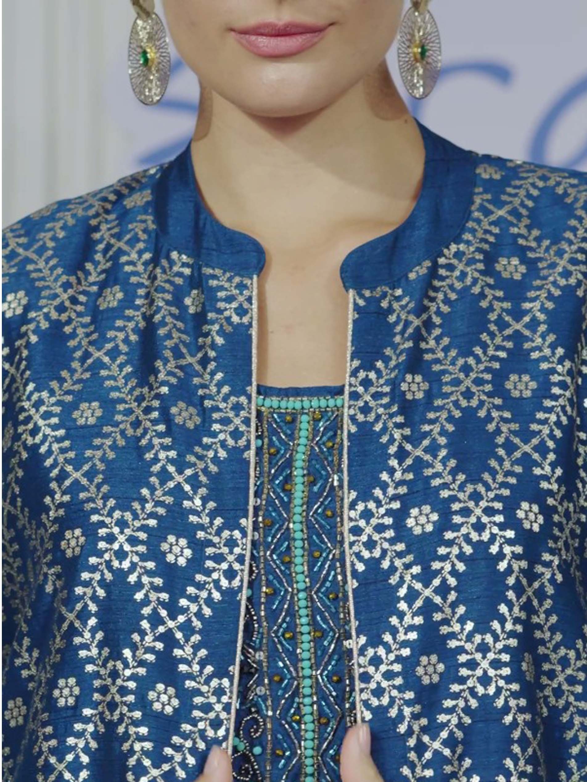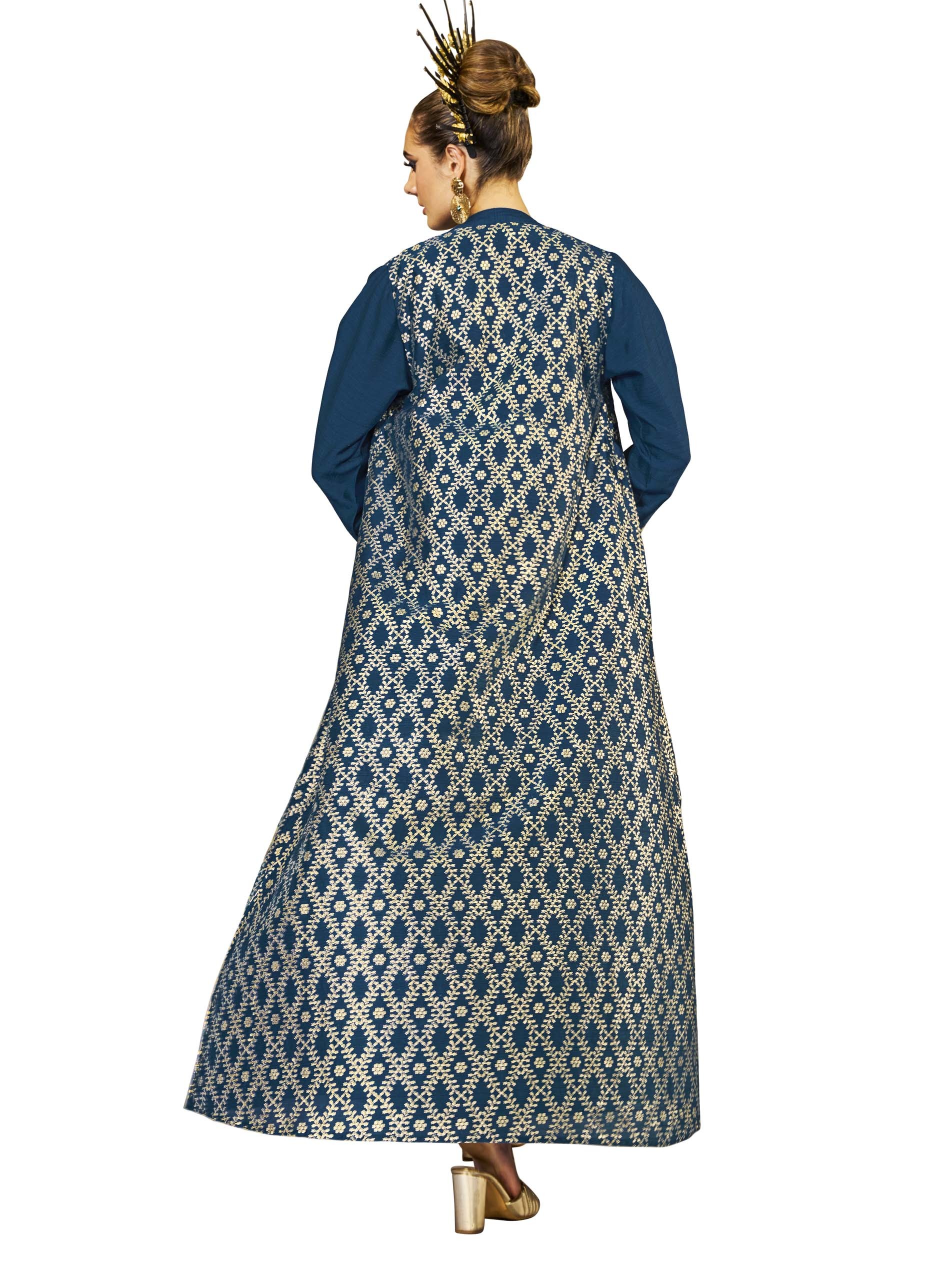 تتميز هذه الجلابية بقَصّة مُتَوَسِّعة المصنوعة من القطن القابل للتنفس، مما يجعلها مثالية للمناسبة الروحانية لشهر رمضان. القاعدة الزرقاء مزينة بأنماط هندسية معقدة باللونين الأصفر والذهبي، وطبعات زهور، وتفاصيل مخططة على الأساور، في حين أن الطبقة الداخلية تحتوي على تصاميم زهور أنيقة. تعزز طبعة الفويل اللامعة والعمل اليدوي الجميل بالخرز المظهر العام، مما يجعلها خيارًا مثاليًا للاحتفالات الصيفية.