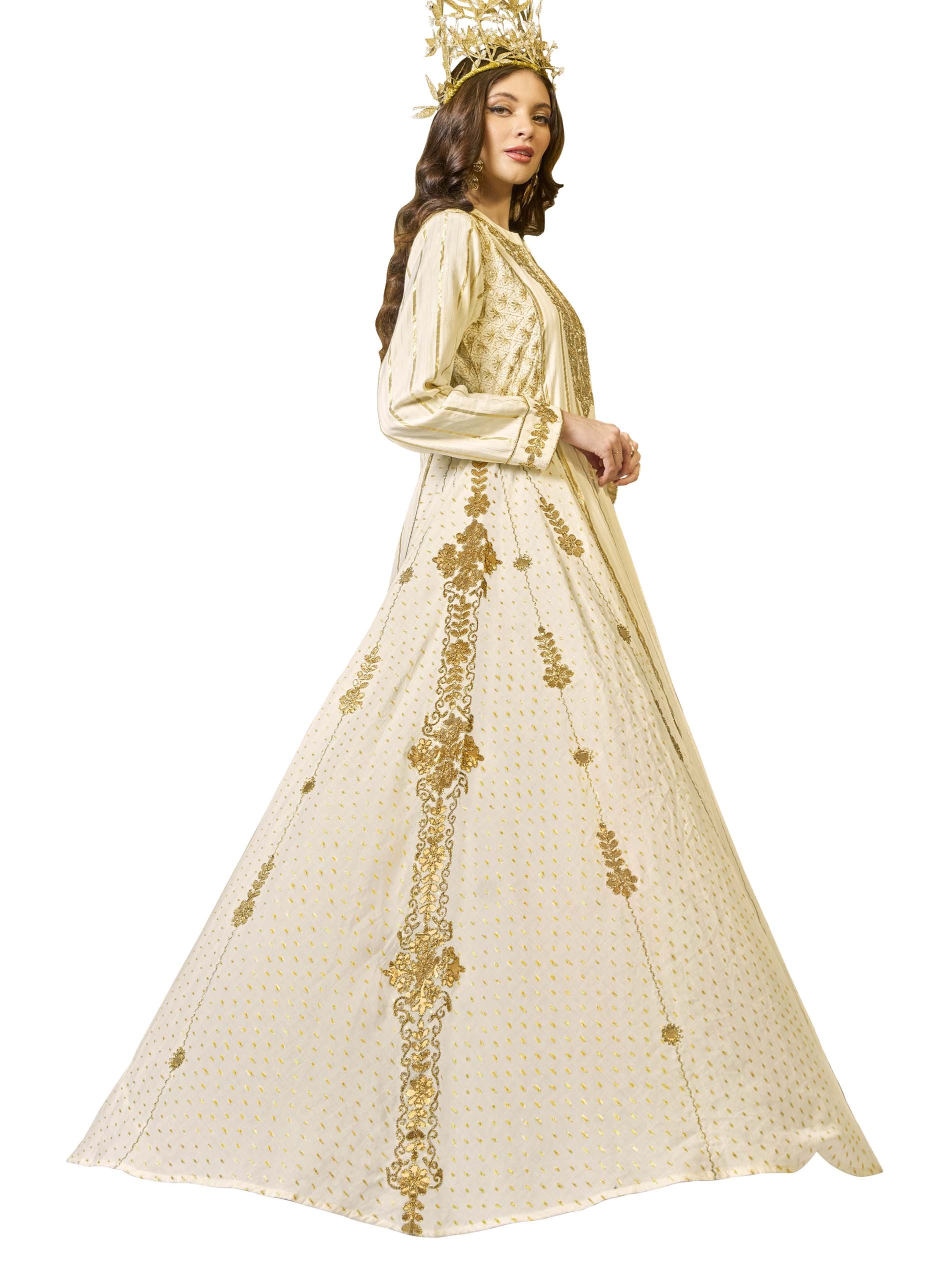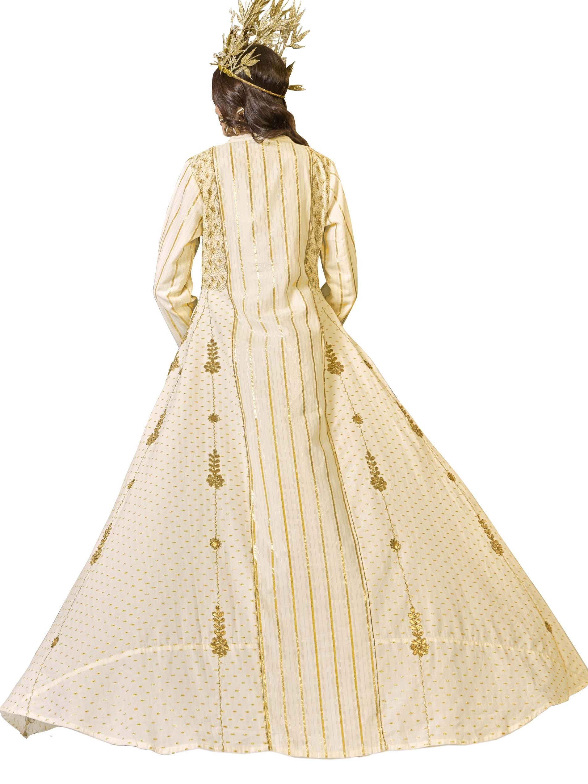 تتميز هذه الجلابية المتسعة، المصنوعة من القطن القابل للتنفس، بأنها مثالية لمناسبات رمضان خلال موسم الصيف. اللون العاجي الناعم مزين بشكل جميل بنقوش ذهبية دقيقة، بما في ذلك الخطوط الرأسية، النقاط الدقيقة، والتفاصيل الزهرية. يضيف العمل التطريزي الذهبي الأنيق لمسة من الرقي إلى التصميم.