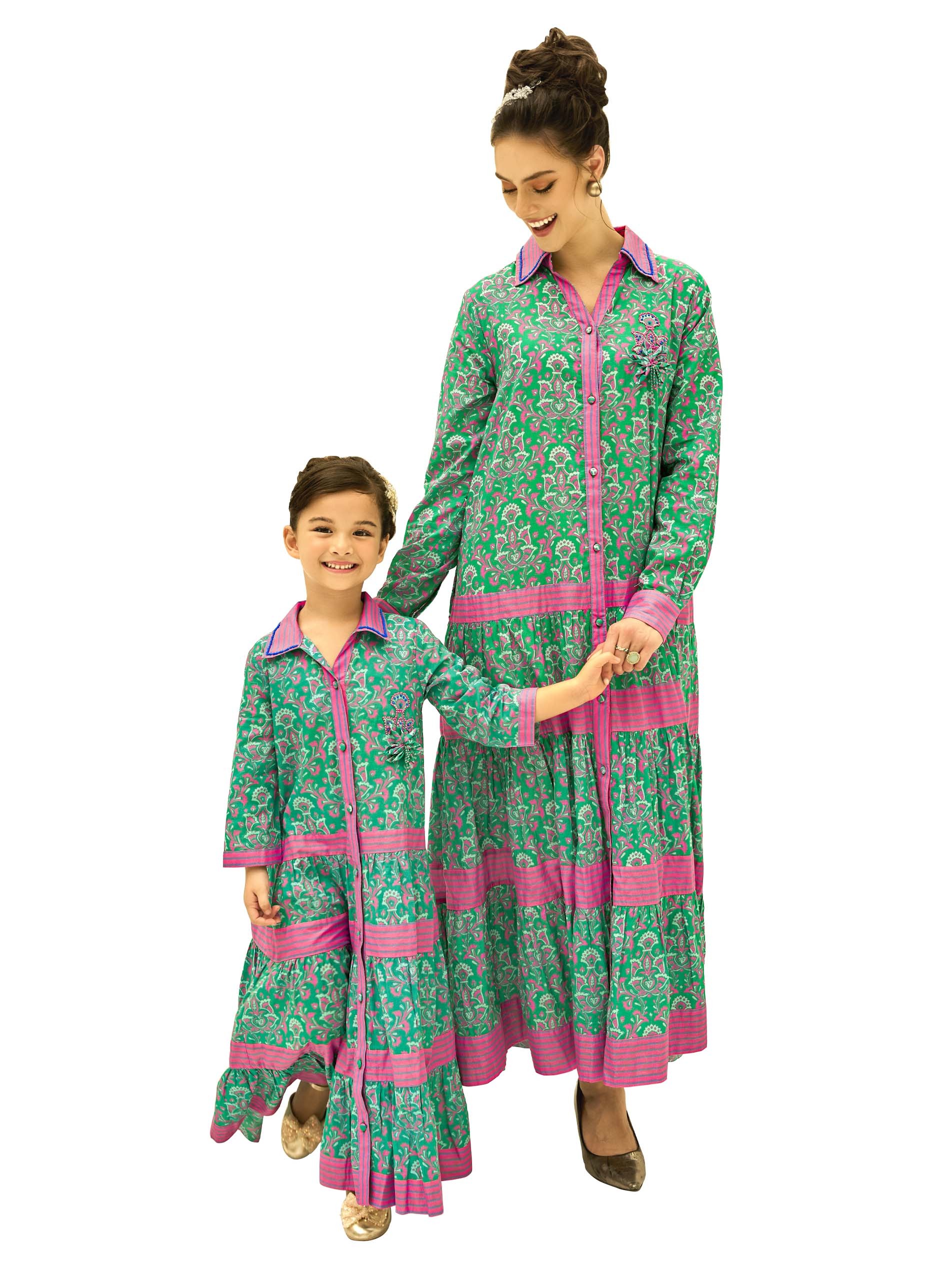 تتميز هذه الجلابية للأطفال بقاعدة خضراء زاهية مع طبعات زهرية مستوحاة من الطبيعة وطبقات مخططة باللون الوردي المتباين. توفر لوحة الأزرار المزدوجة والقصّة المتوسعة تنوعاً وأسلوباً مميزاً، بينما يضمن القماش القطني الراحة خلال الصيف. مع تفاصيل العنق المدور وتطريز اليد، فهي مثالية لأي مناسبة احتفالية.