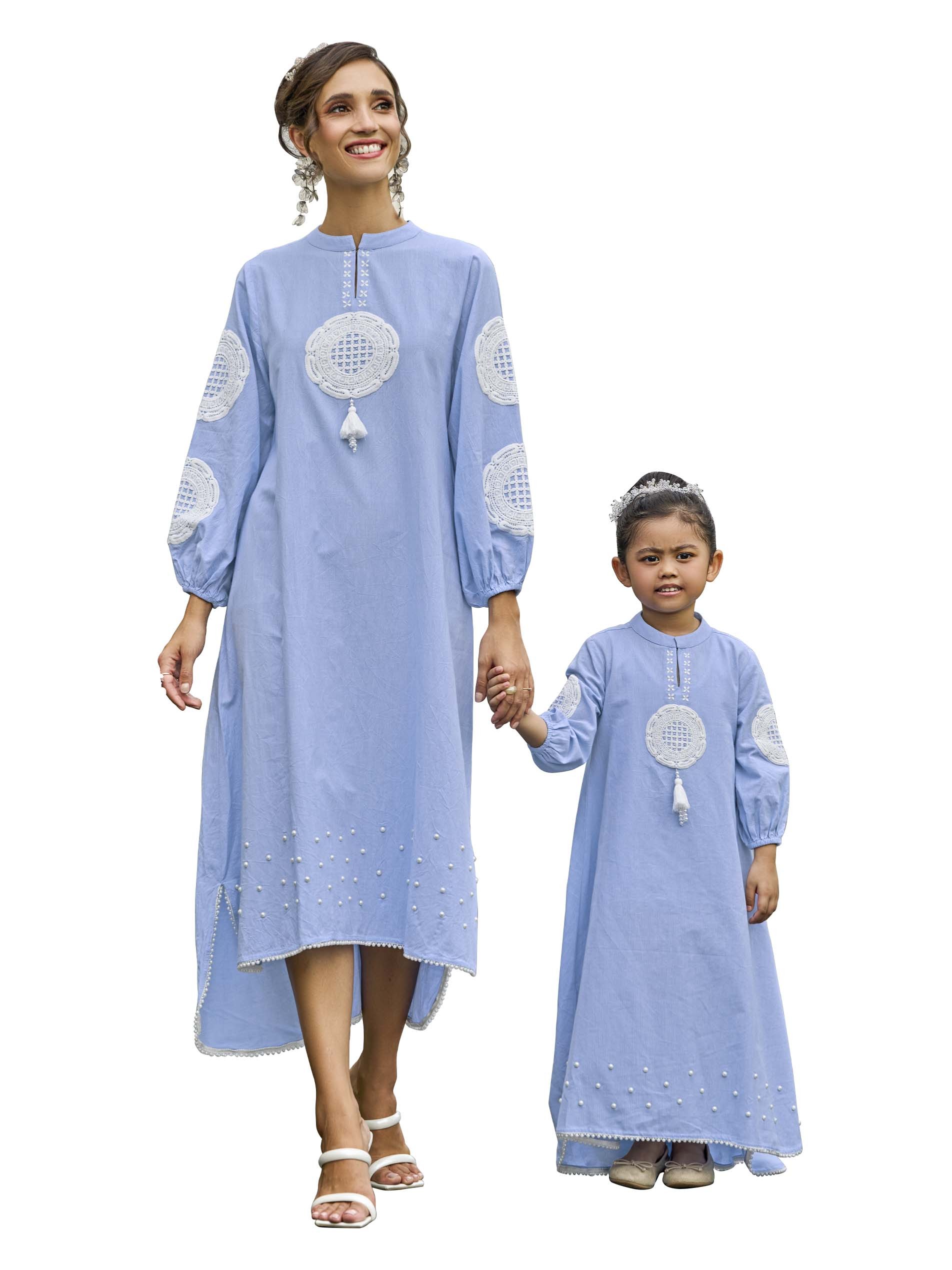 تتميز هذه الجلابية القطنية الزرقاء المشرقة للأطفال بتطريز أبيض دقيق، مع تفاصيل من الأنماط الهندسية المرحة ونقوش الدانتيل التي تضيف سحرًا. توفر القصّة نصف ونصف fit أنيقة ومريحة، مما يجعلها مثالية للتدوير في حفلات الصيف. تضيف تفاصيل اللؤلؤ والعمل بالخرز لمسة احتفالية، مما يجعلها خيارًا مرحًا لأي مناسبة.
