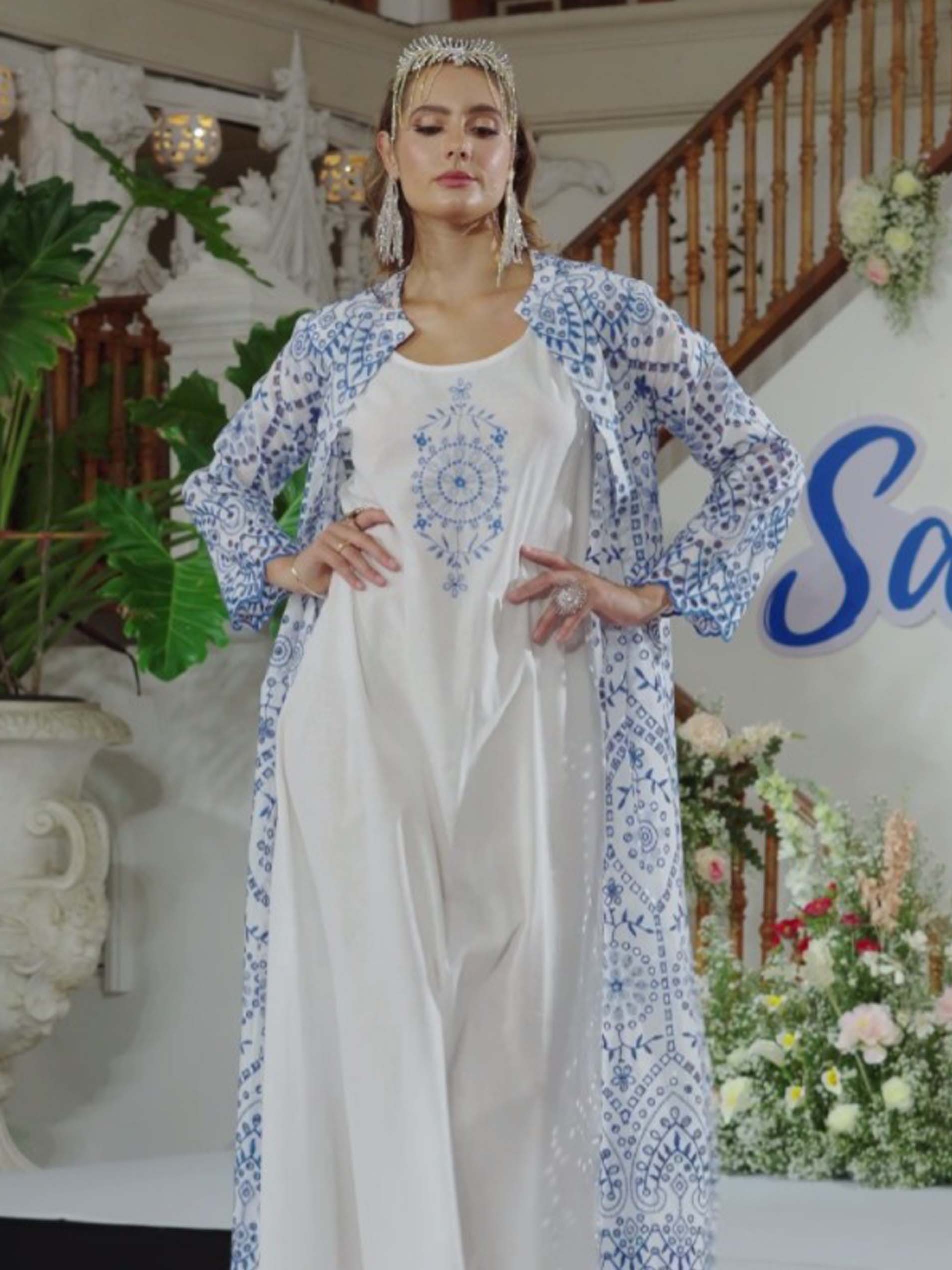 تتميز هذه الجلابية ذات التصميم الجاكت للأطفال بزي سادة باللون الأبيض مزخرف بتطريز شيفلي باللون الأزرق، يعرض أشكال زهرية مرحة وأنماط هندسية. يوفر الجاكت المفتوح مع القاعدة القطنية البسيطة راحة وسهولة في التنسق مع ملابس الصيف. مثالية لاحتفالات رمضان، يجمع هذا التصميم بين الأناقة والعملية لطفلك.
