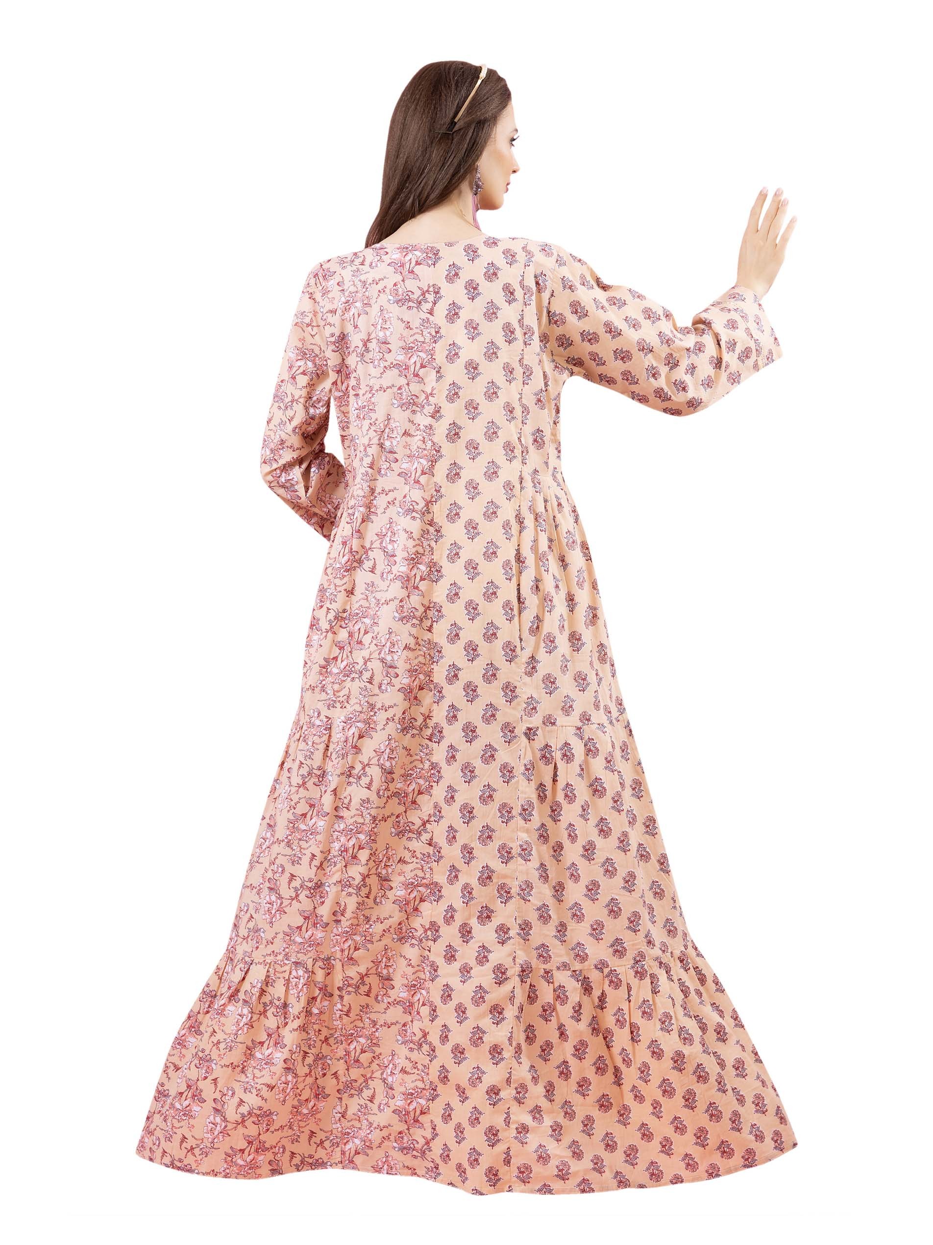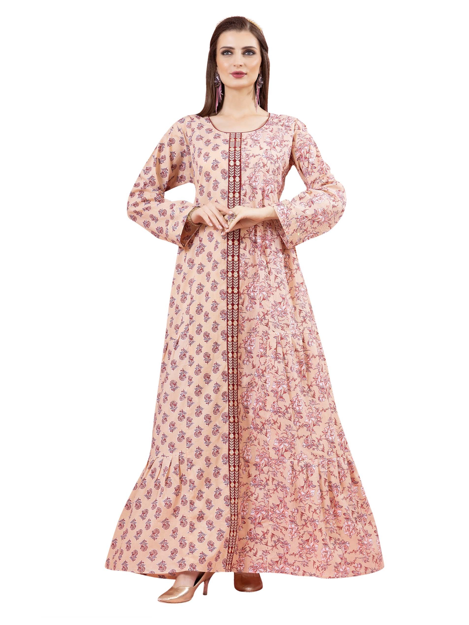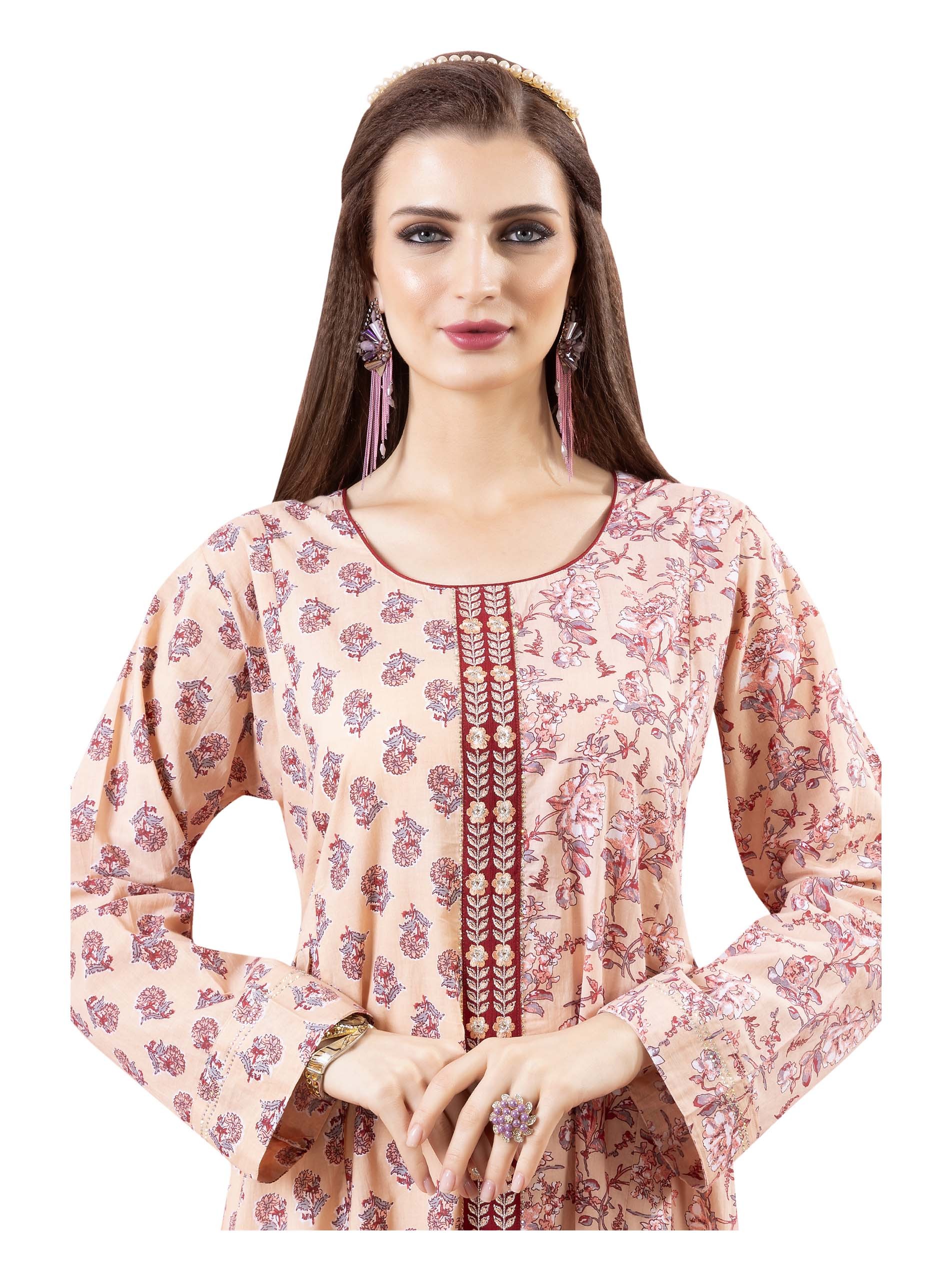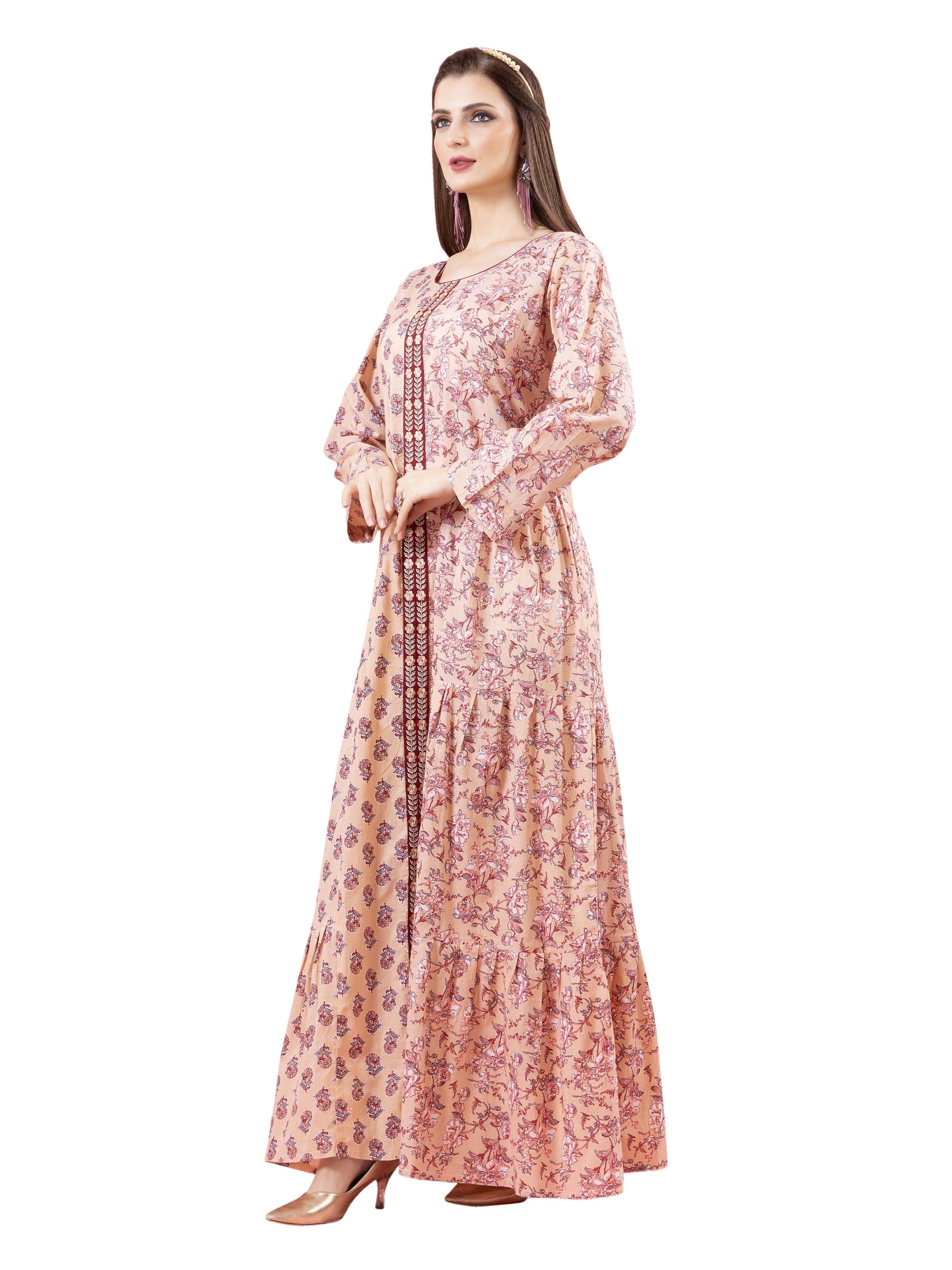 جلابية باللون الزهري مصممة بقصة A-line ومطرزة بنقوشات متنوعة على الجانبين لاطلالة فريدة من نوعها.
