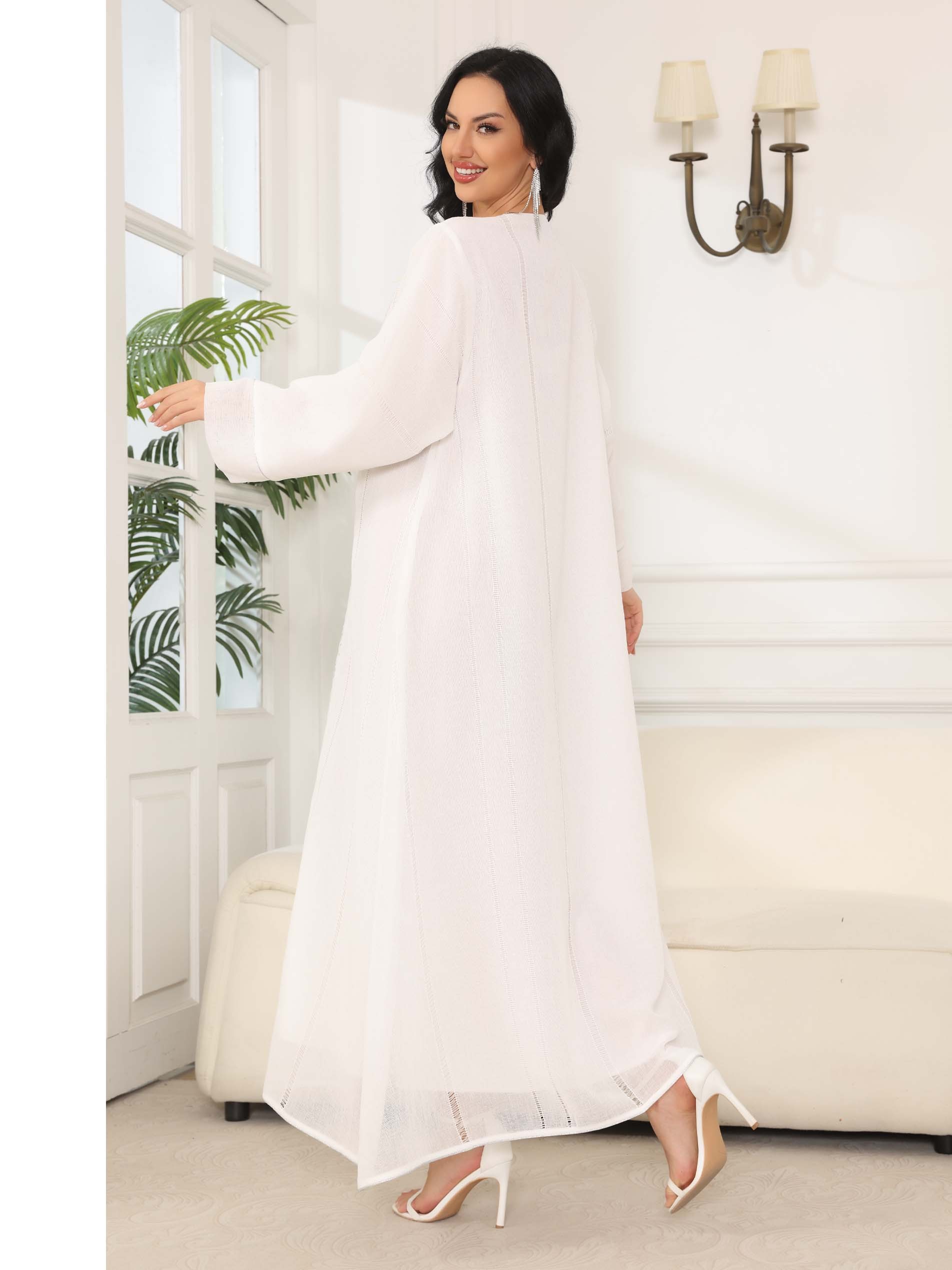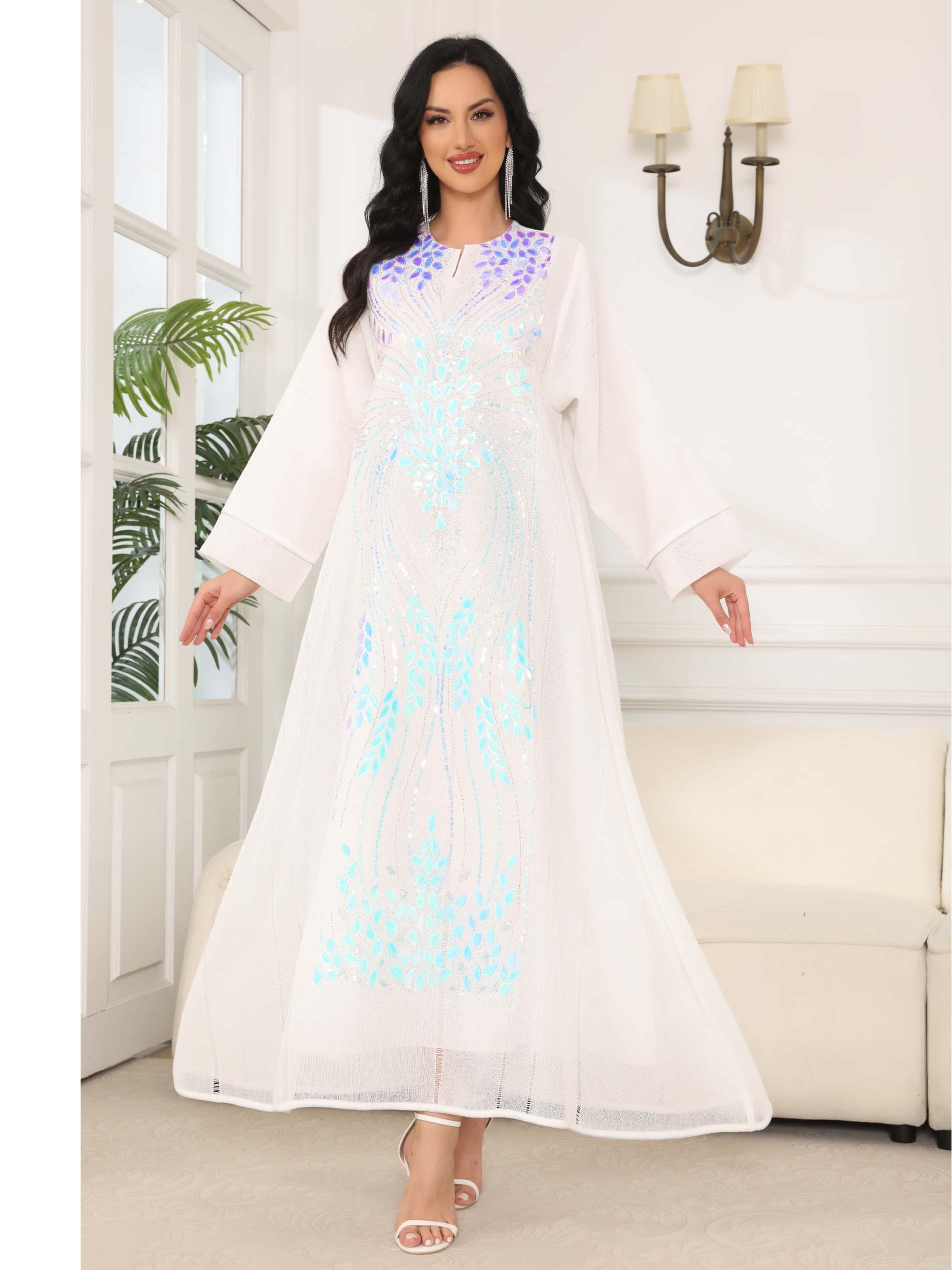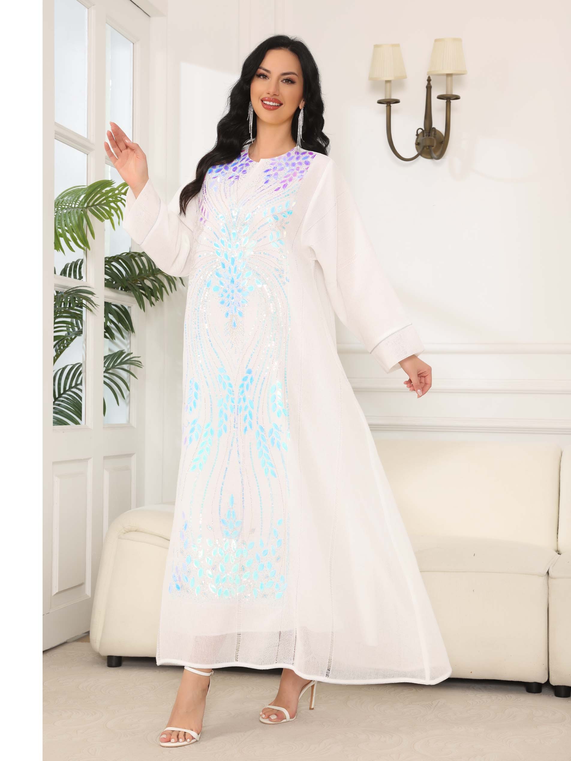 جلابية بيضاء مصنوعة من الكتان ، مصممة بأحجار زرقاء جميلة مع أكمام طويلة لاطلالة مذهلة في الاحتفالات والمناسبات.