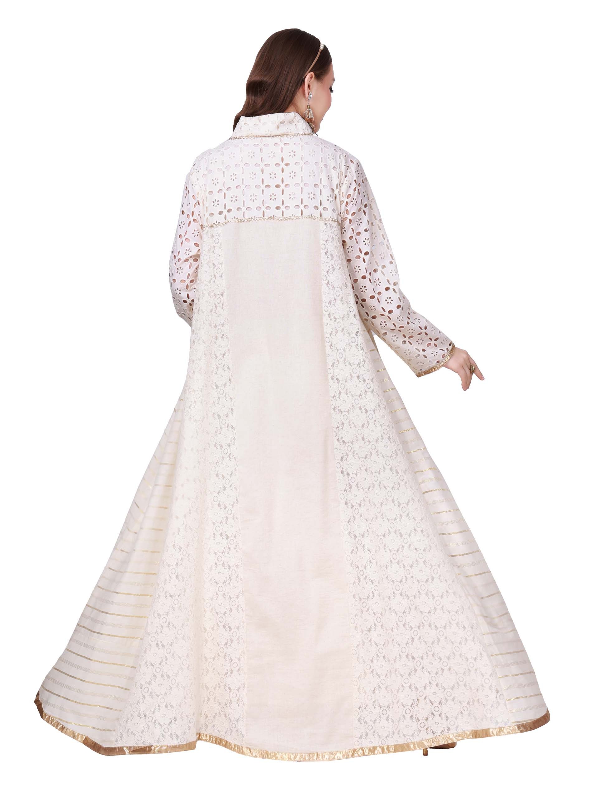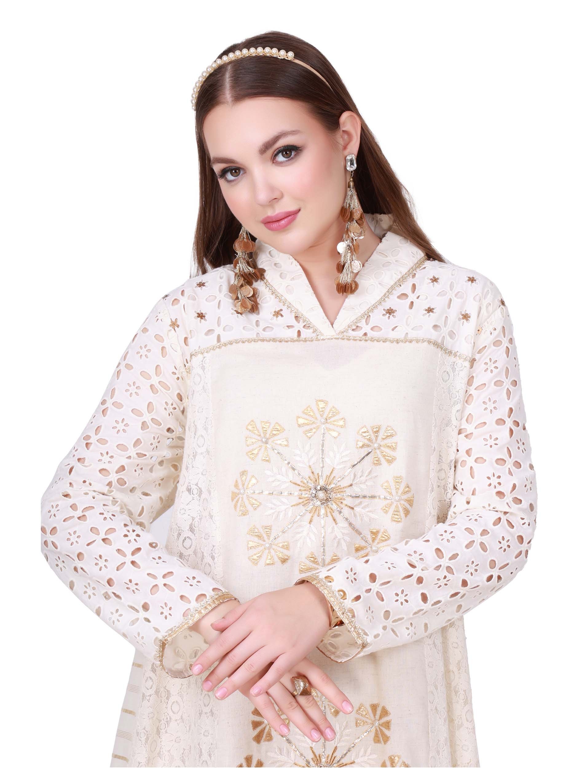 تألقي بجلابية ماكسي بيضاء مصممة من القطن ومطرزة بزهور ذهبية لاضفاء لمسة مميزة لمظهرك.