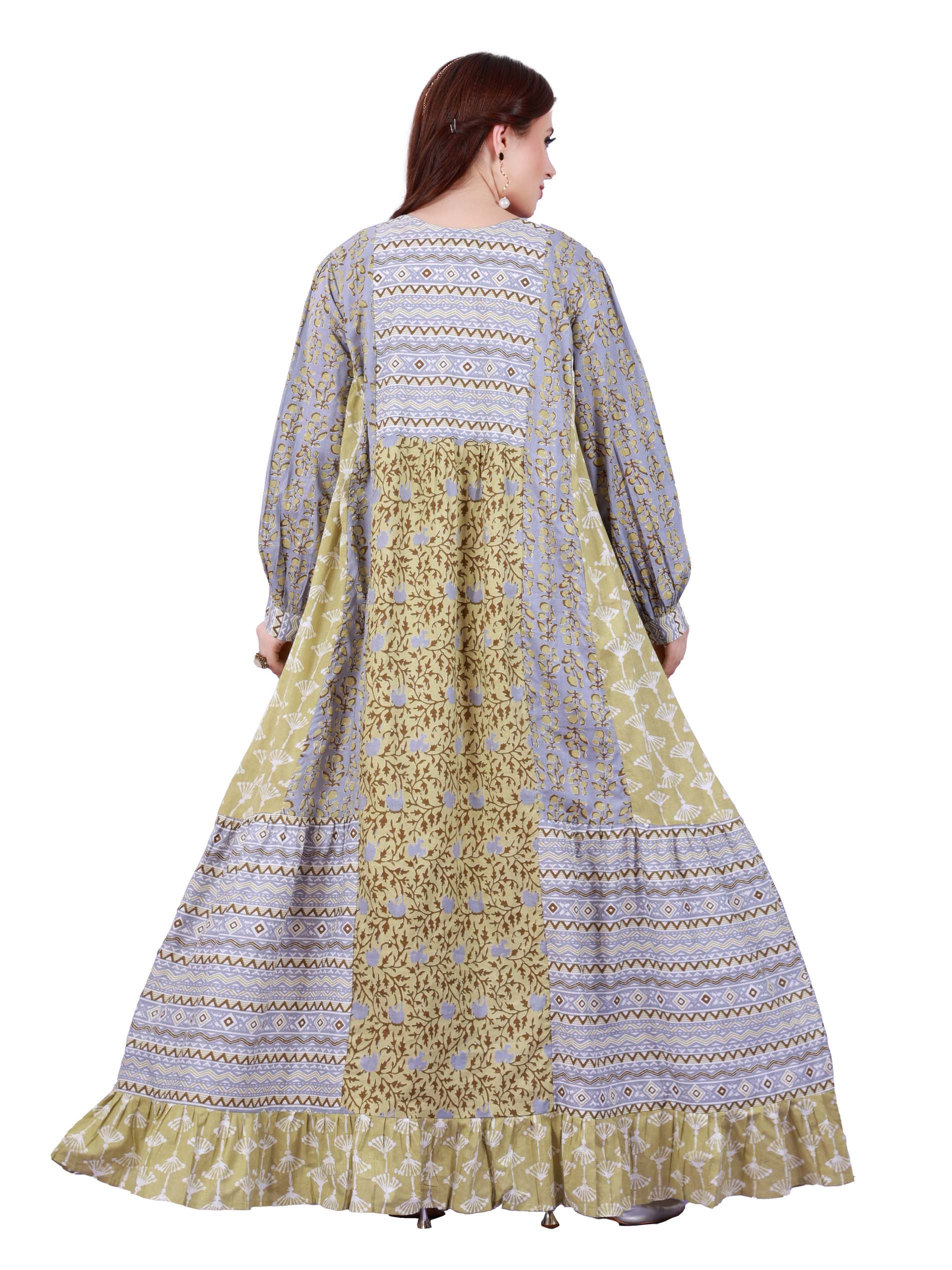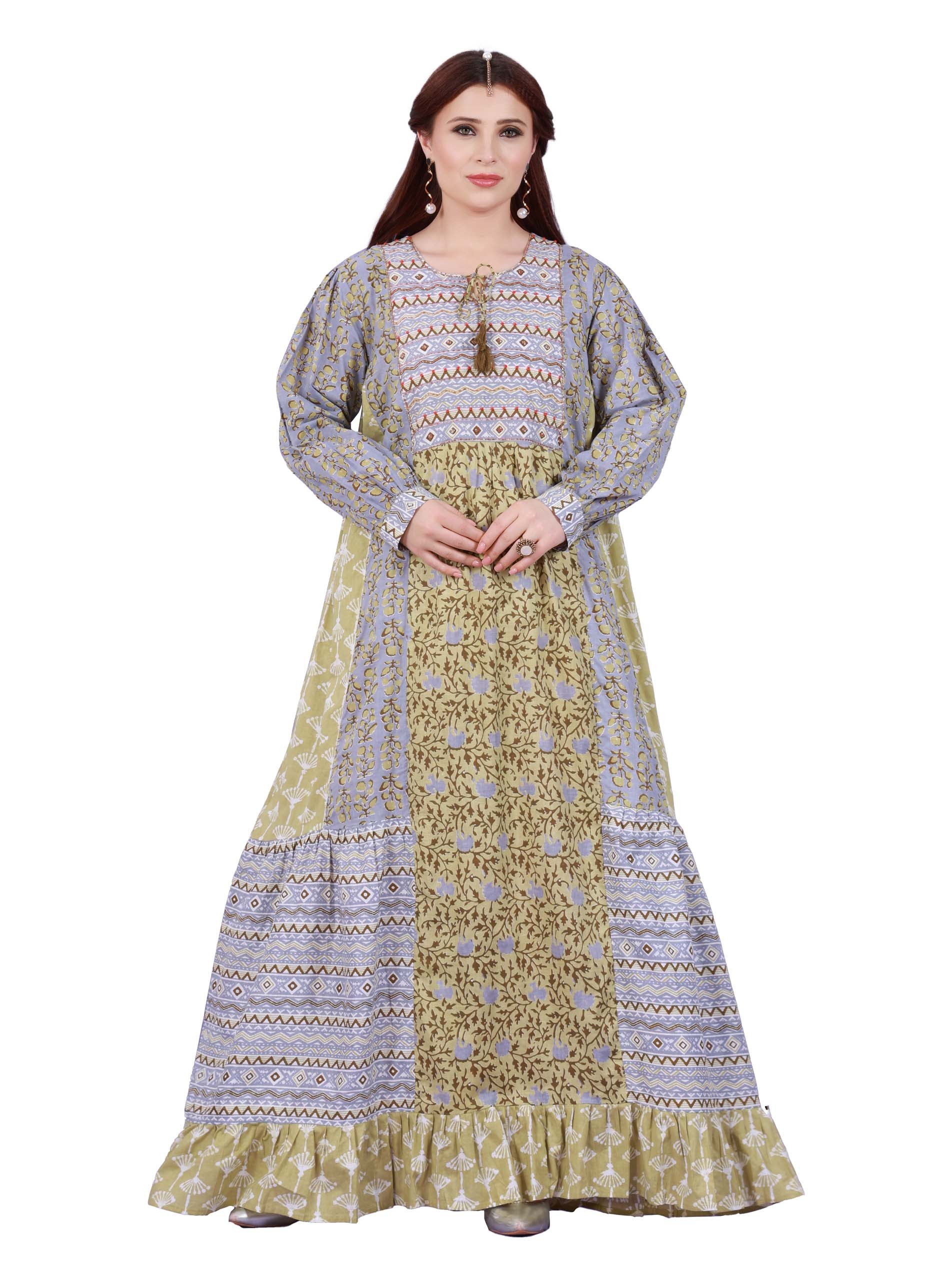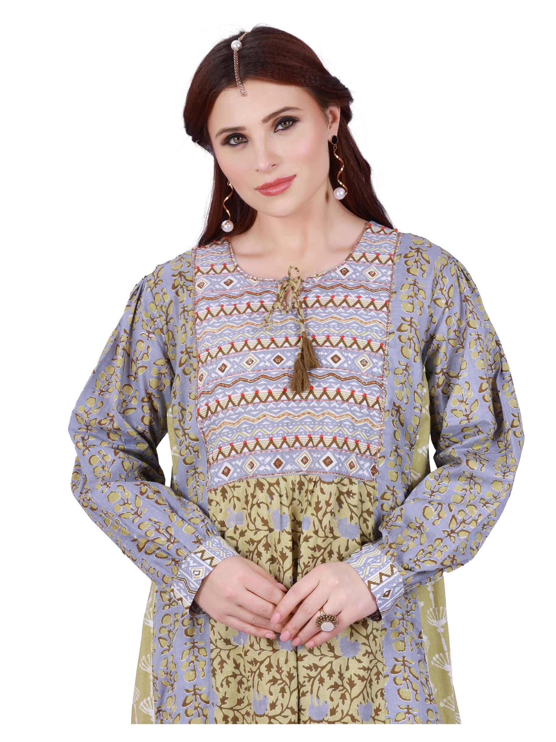 صممت هذا الجلابية المصنوعة من القطن بمزيج مميز من اللونين الأصفر والأزرق بطبعات مميزة ومتنوعة لتصبح اختيارك المثالي في المناسبات القادمة.