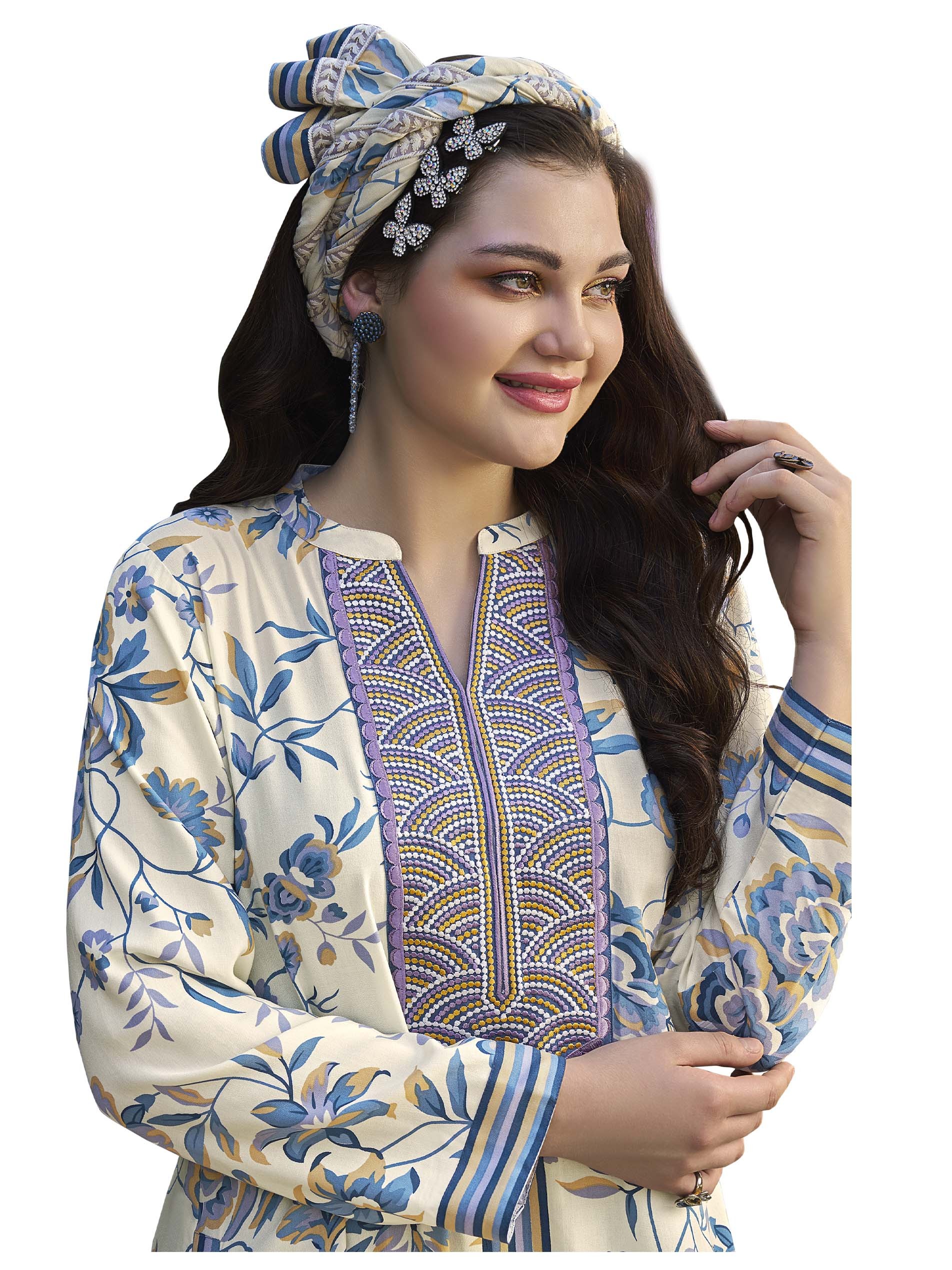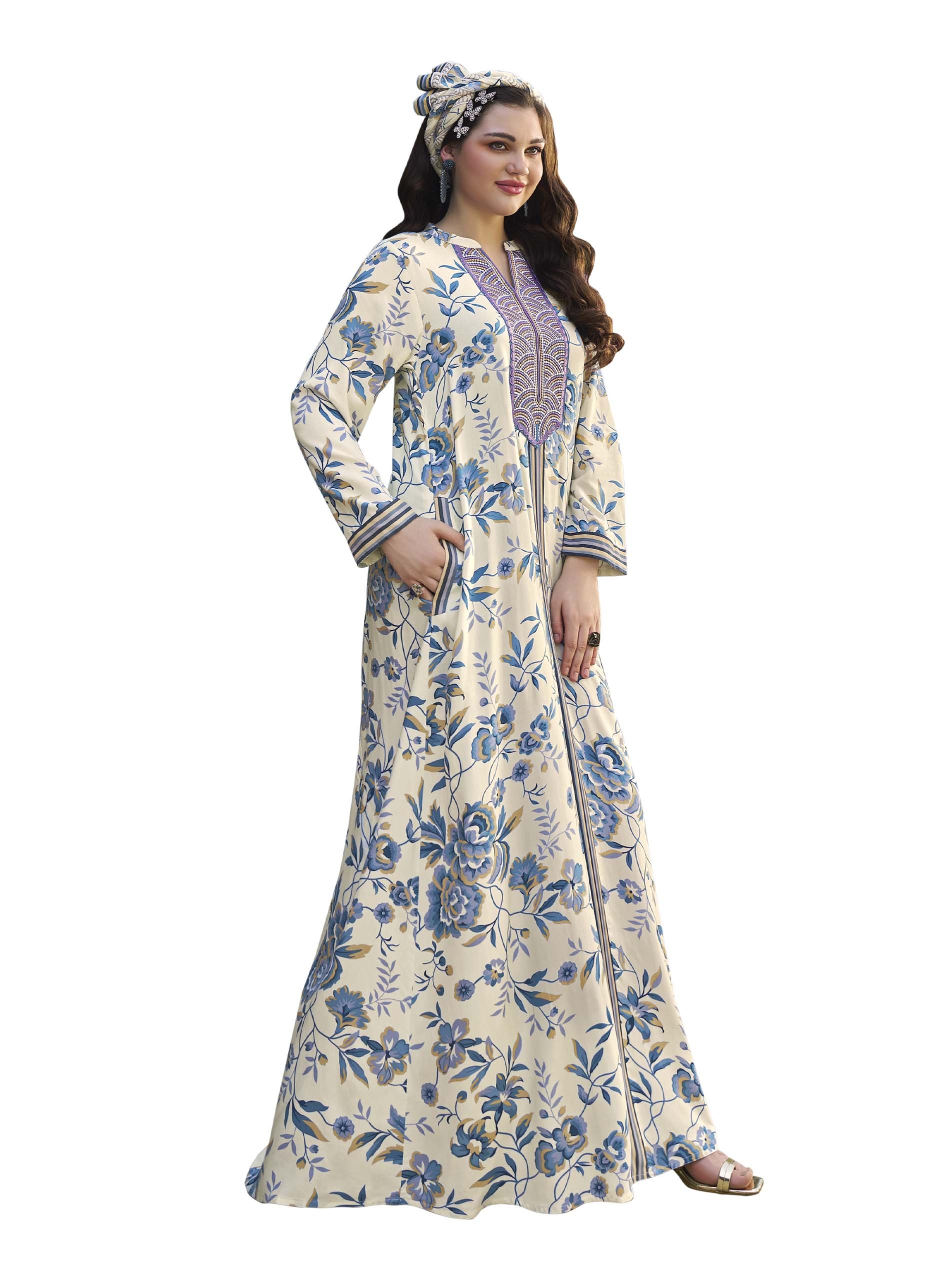 استمتعي بجلابية رائعة من الرايون، مصممة بنقشة الأزهار باللونين الأزرق والأبيض مع أكمام طويلة وتطريز رائع على الصدر.