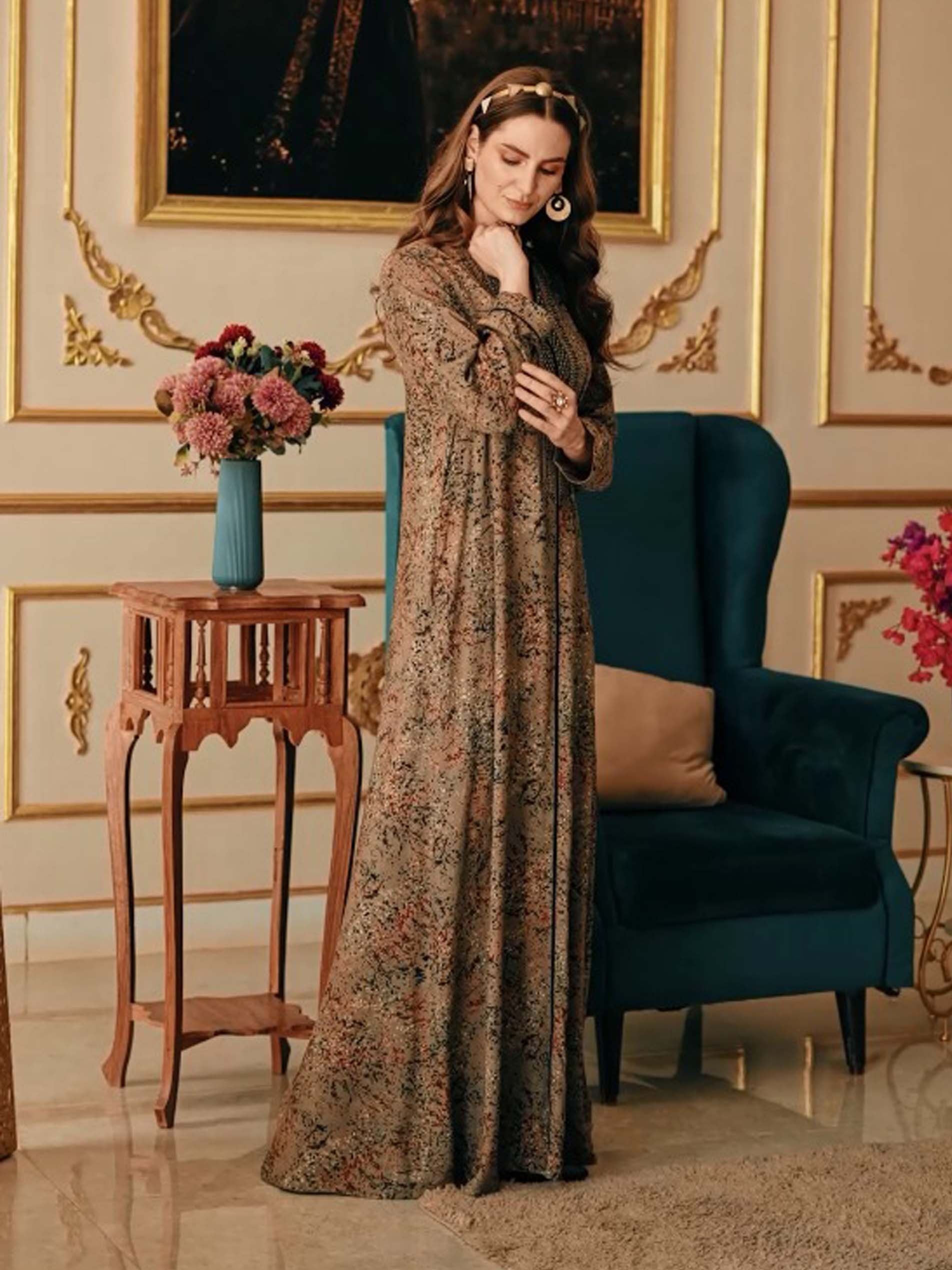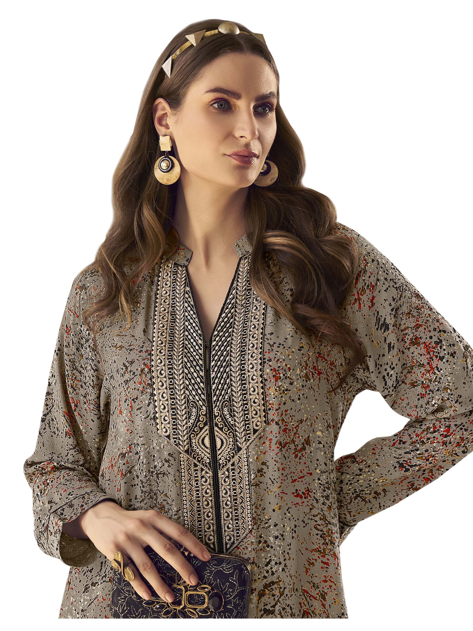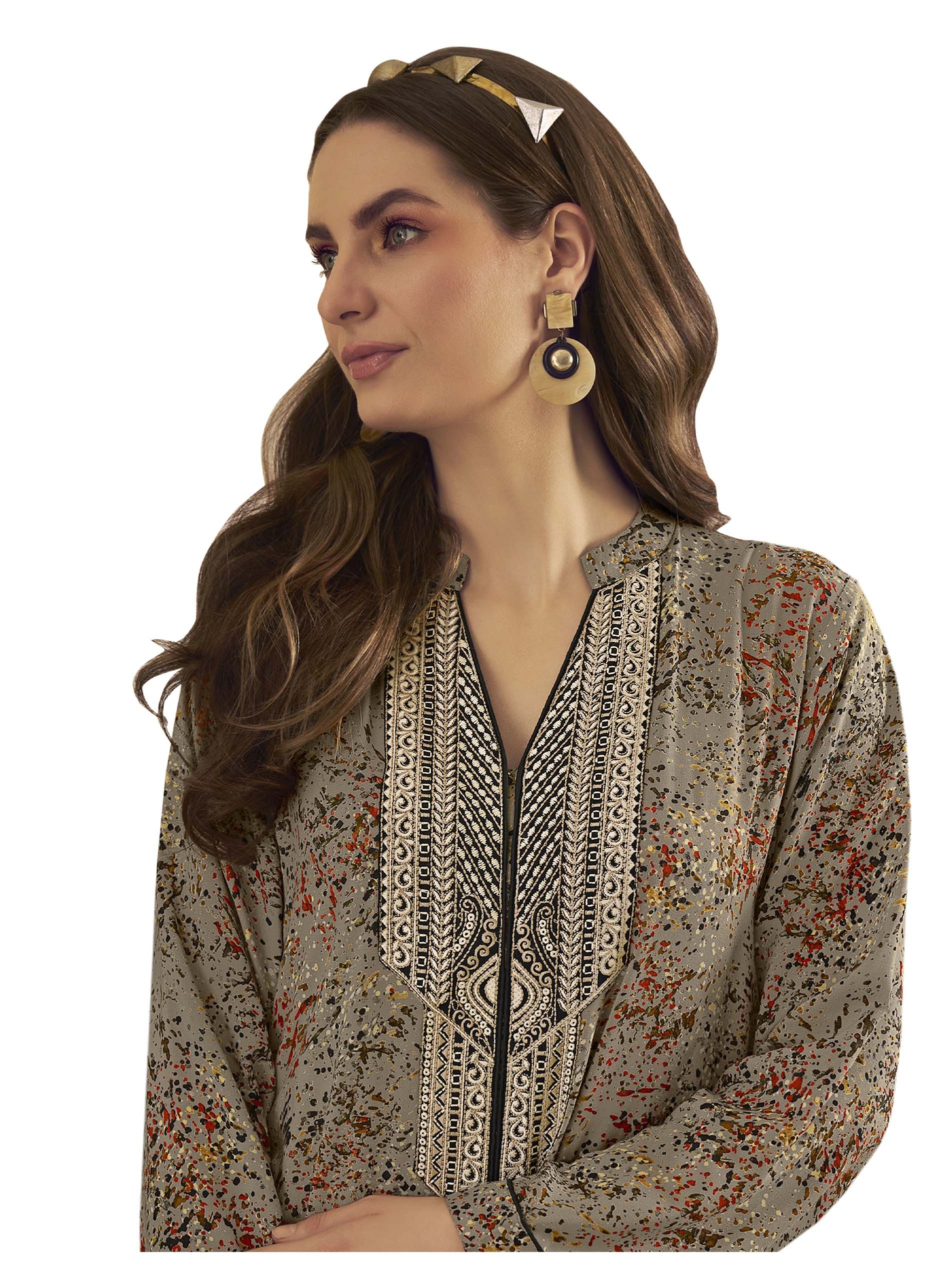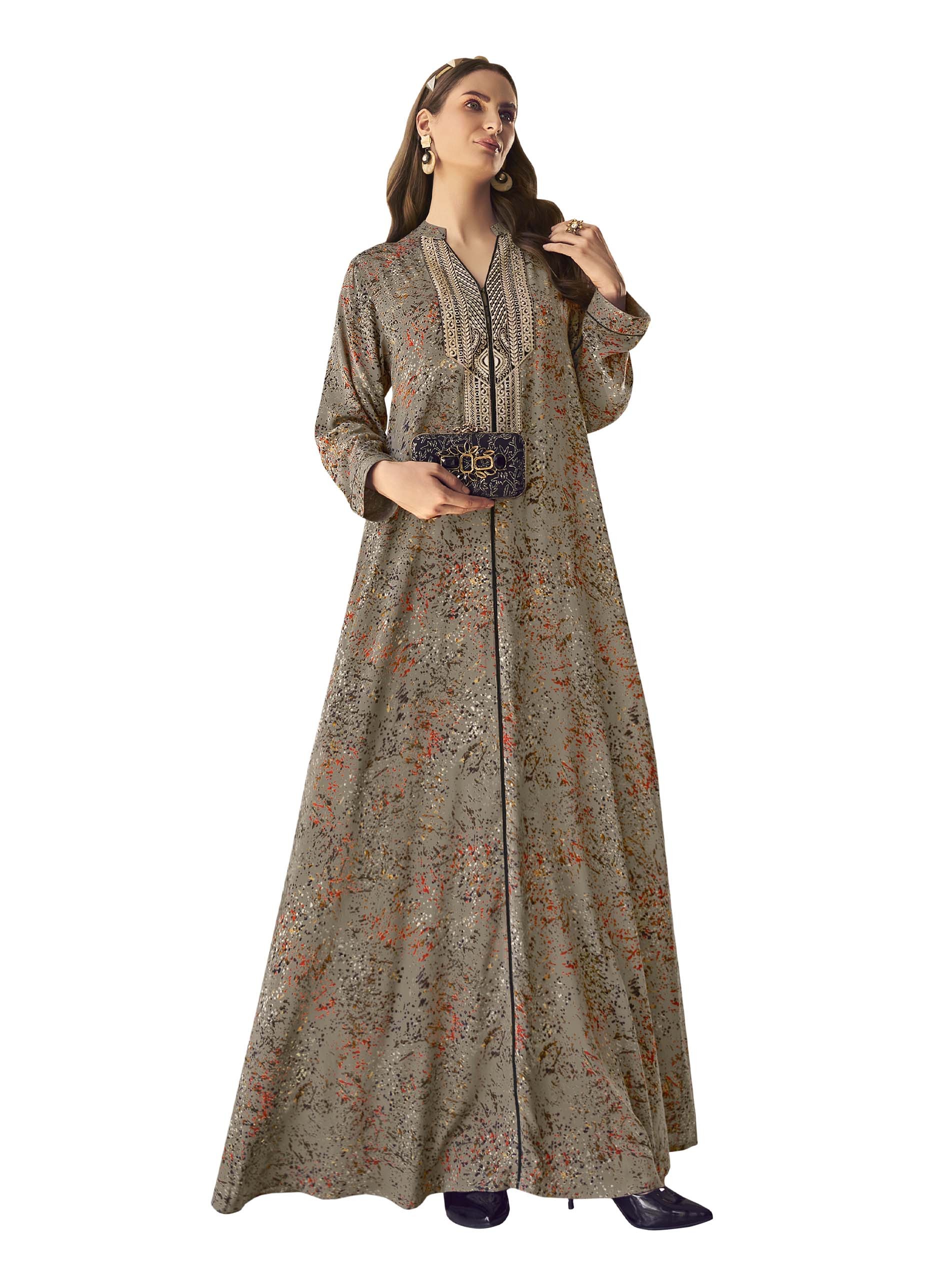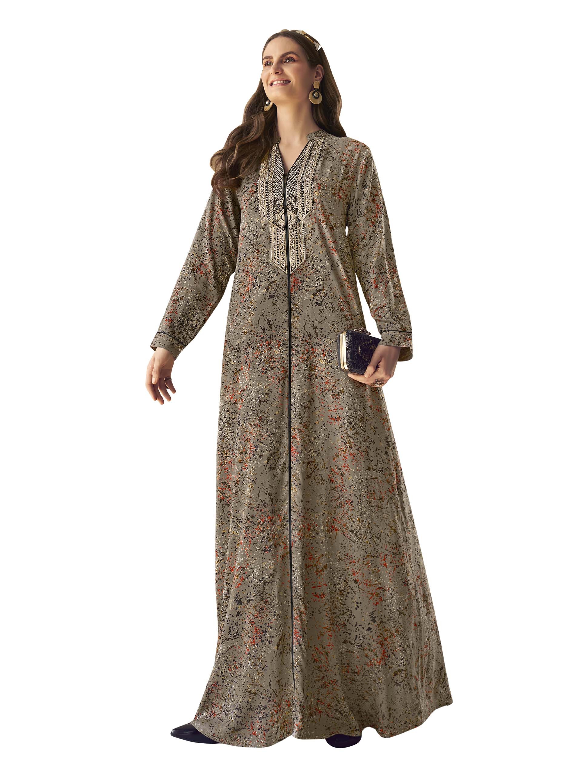 تألقي بارتداء جلابية باللون الرمادي، مصممة من قماش الرايون، ومزودة بنقوشات مميزة وملونة لاطلالة فريدة من نوعها في الصيف.