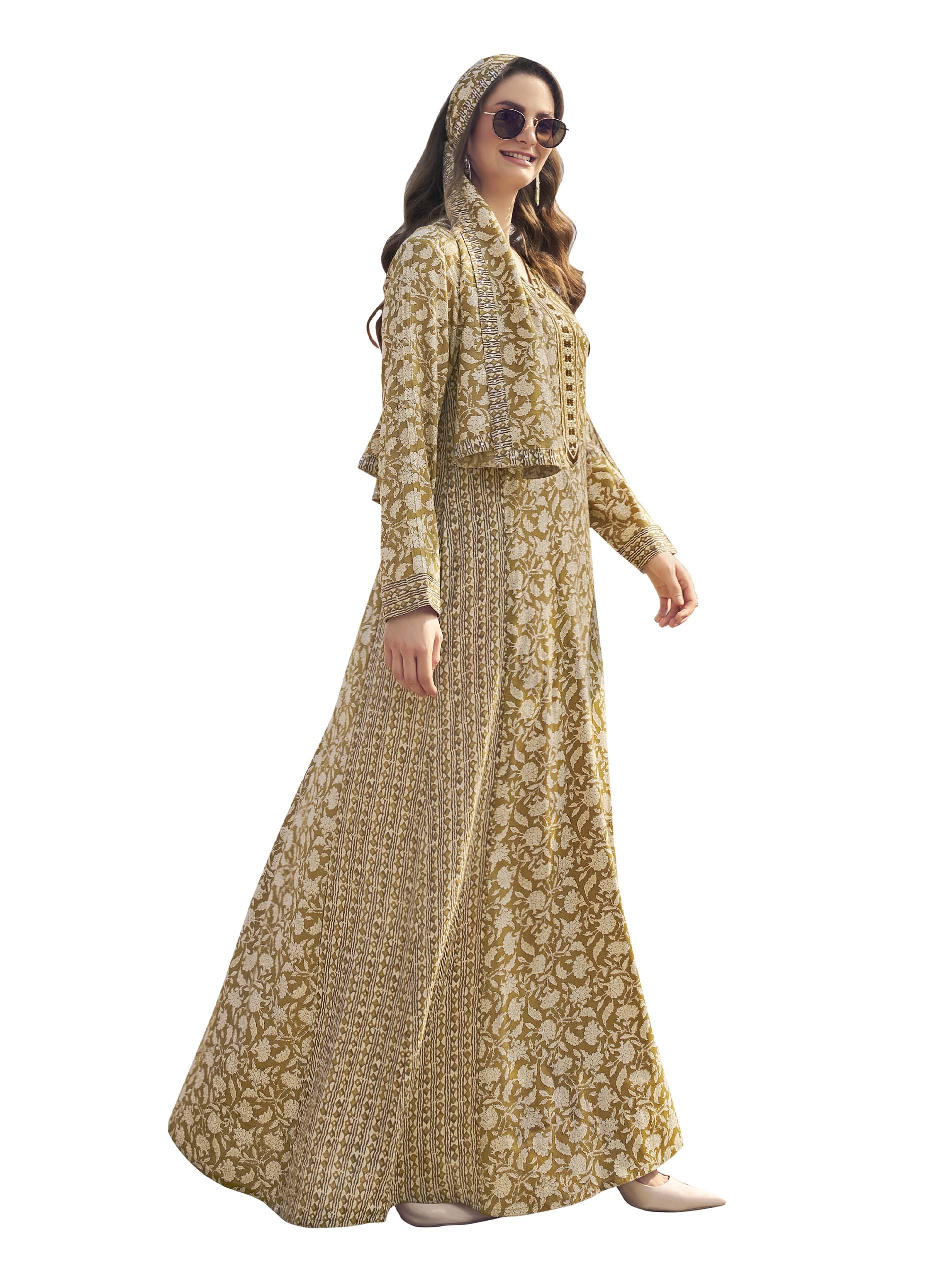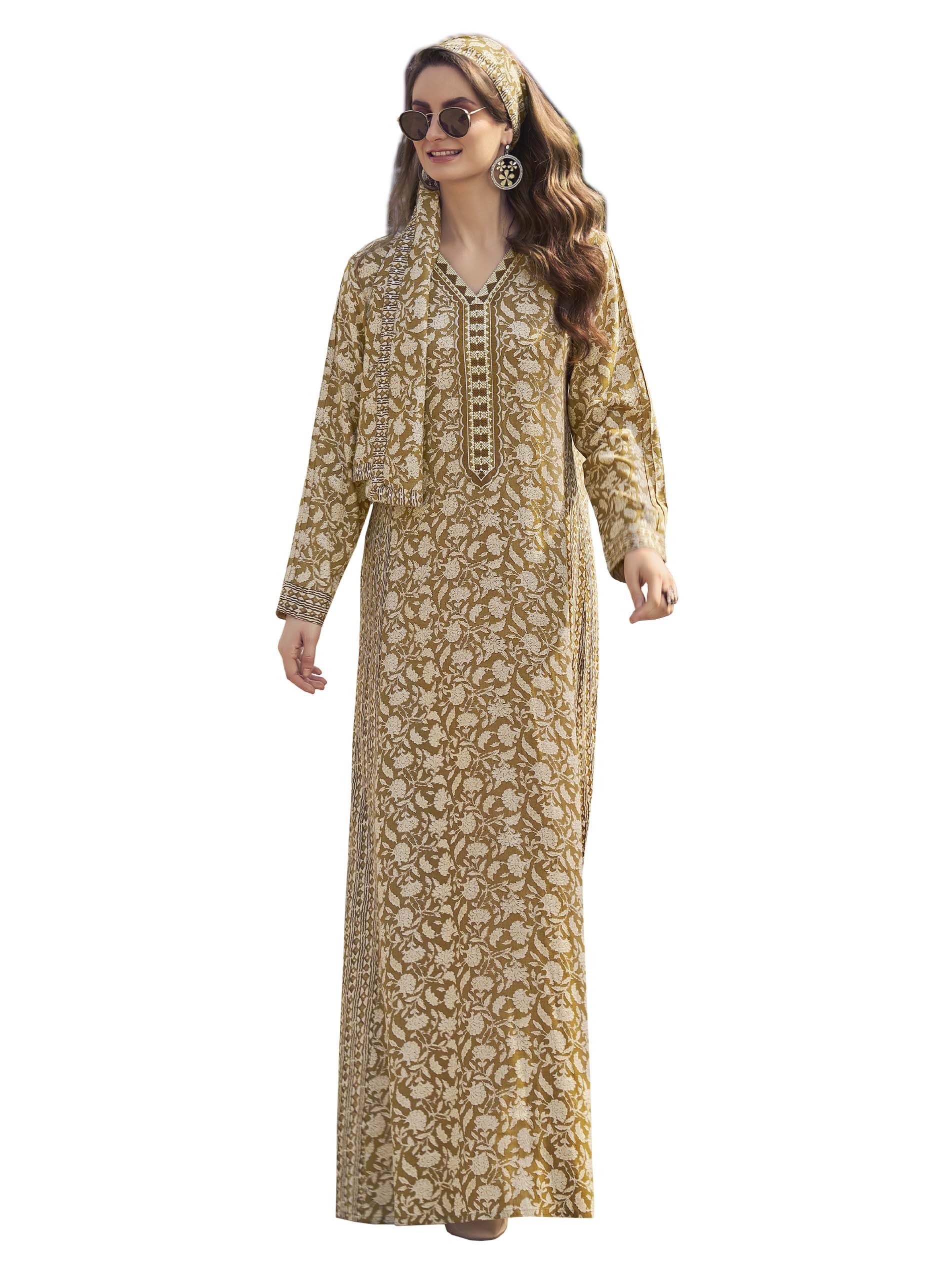 جلابية بنية اللون مصممة بنقشة الأزهار البيضاء لتمنحك اطلالة مميزة في الصيف. ويكتمل التصميم مع الأكمام الطويلة والتطريز الرائع على الصدر.