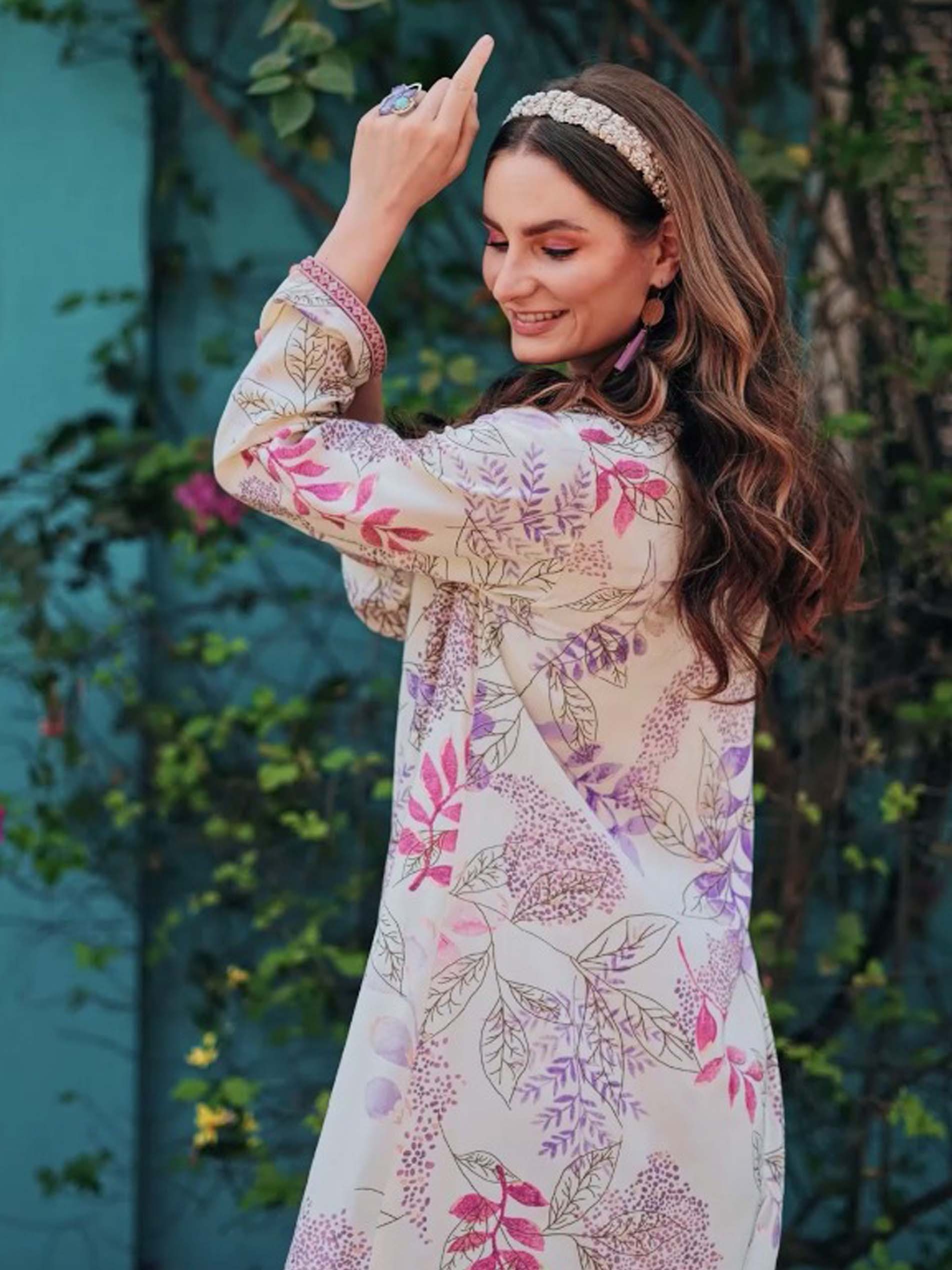 جلابية بيضاء اللون من قماش الرايون، مصممة بنقشة أوراق الشجر باللونين البنفسجي والزهري مع أكمام طويلة وتطريز على الصدر.
