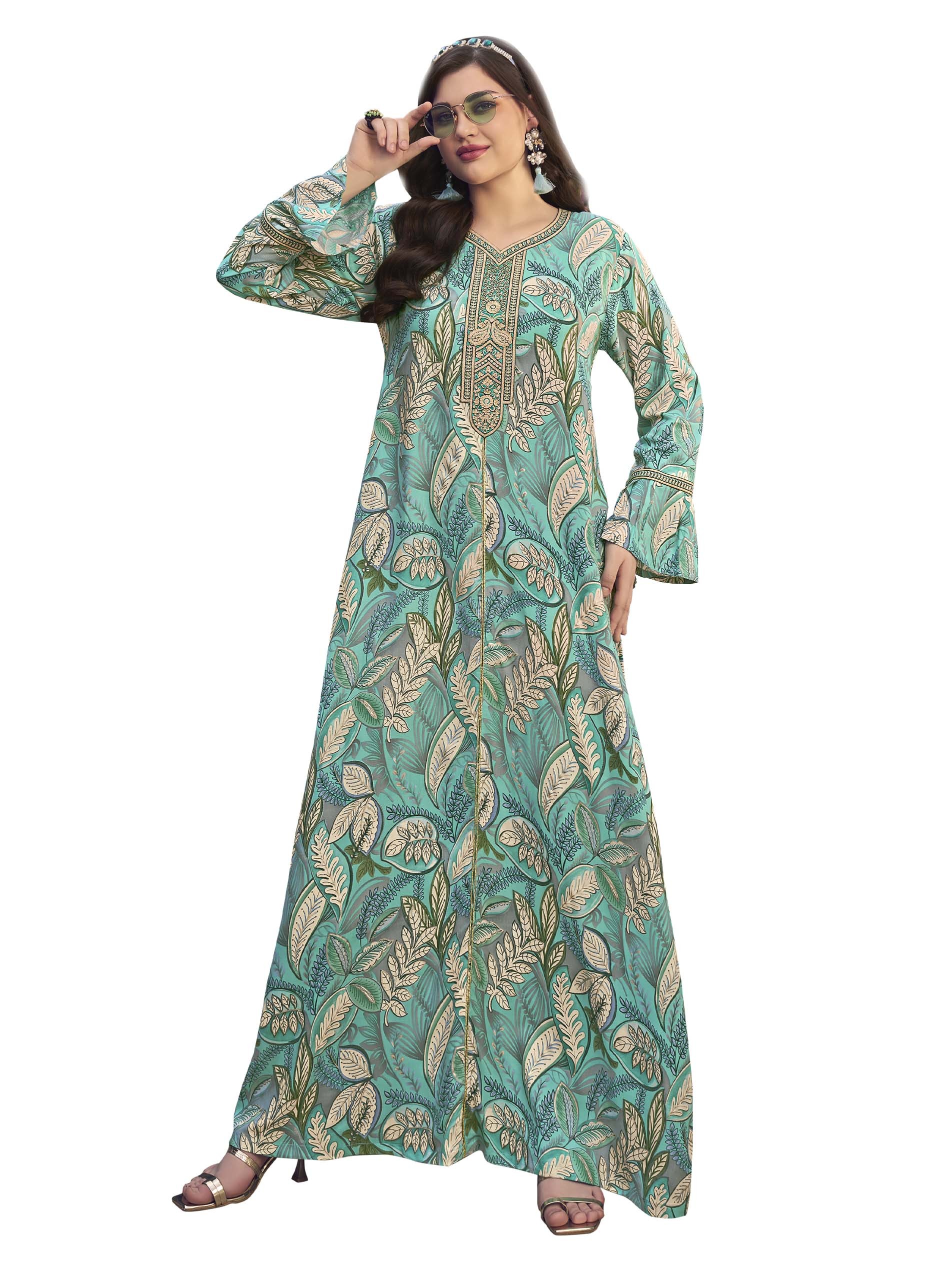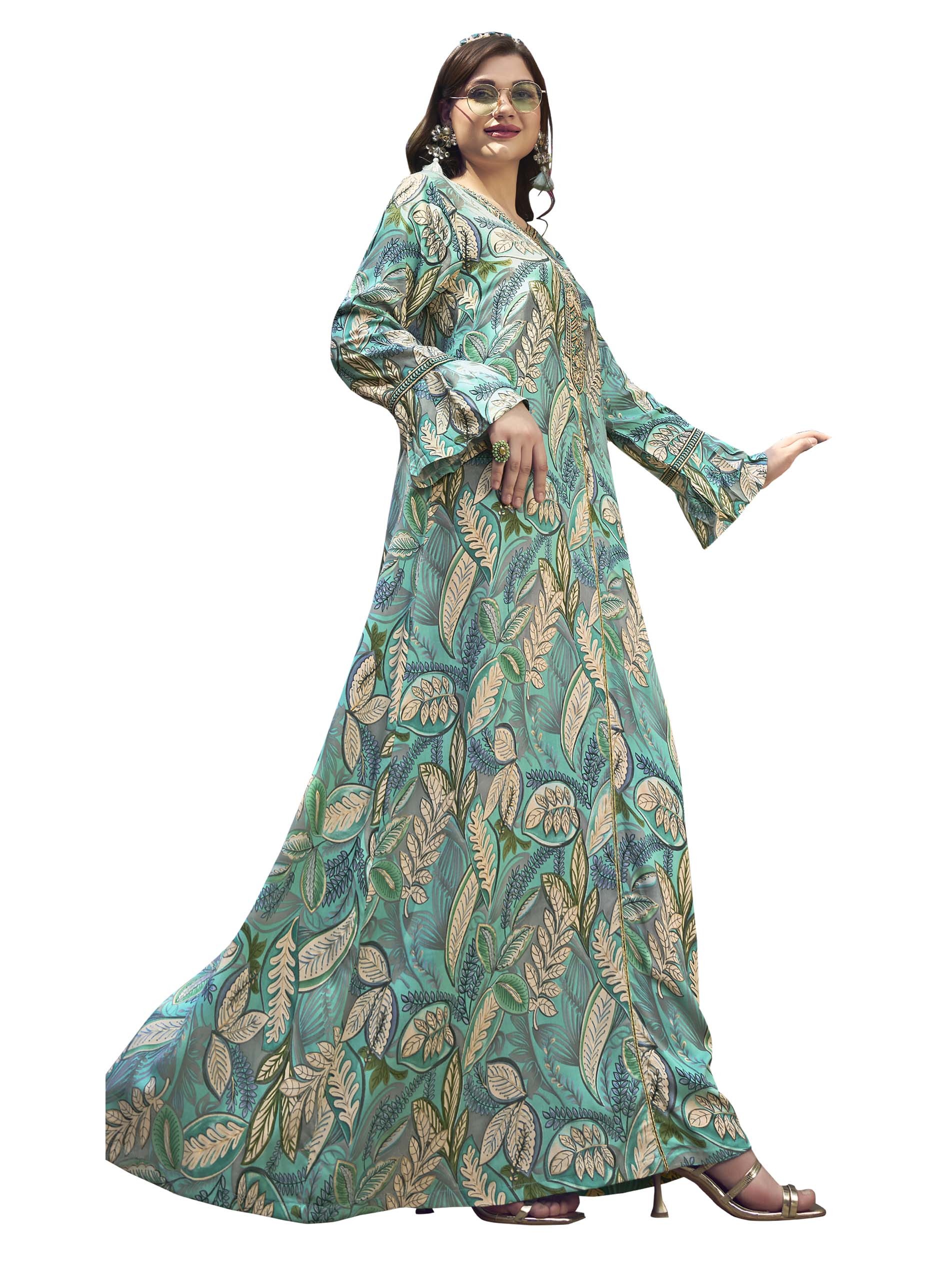 اذا كنتي من محبي اللون الأزرق، هذه الجلابية يجب أن تكون جزء من خزانتك...مصممة بنقشة أوراق الشجر باللون الرمادي مع أكمام طويلة وتطريز رائع على الصدر.