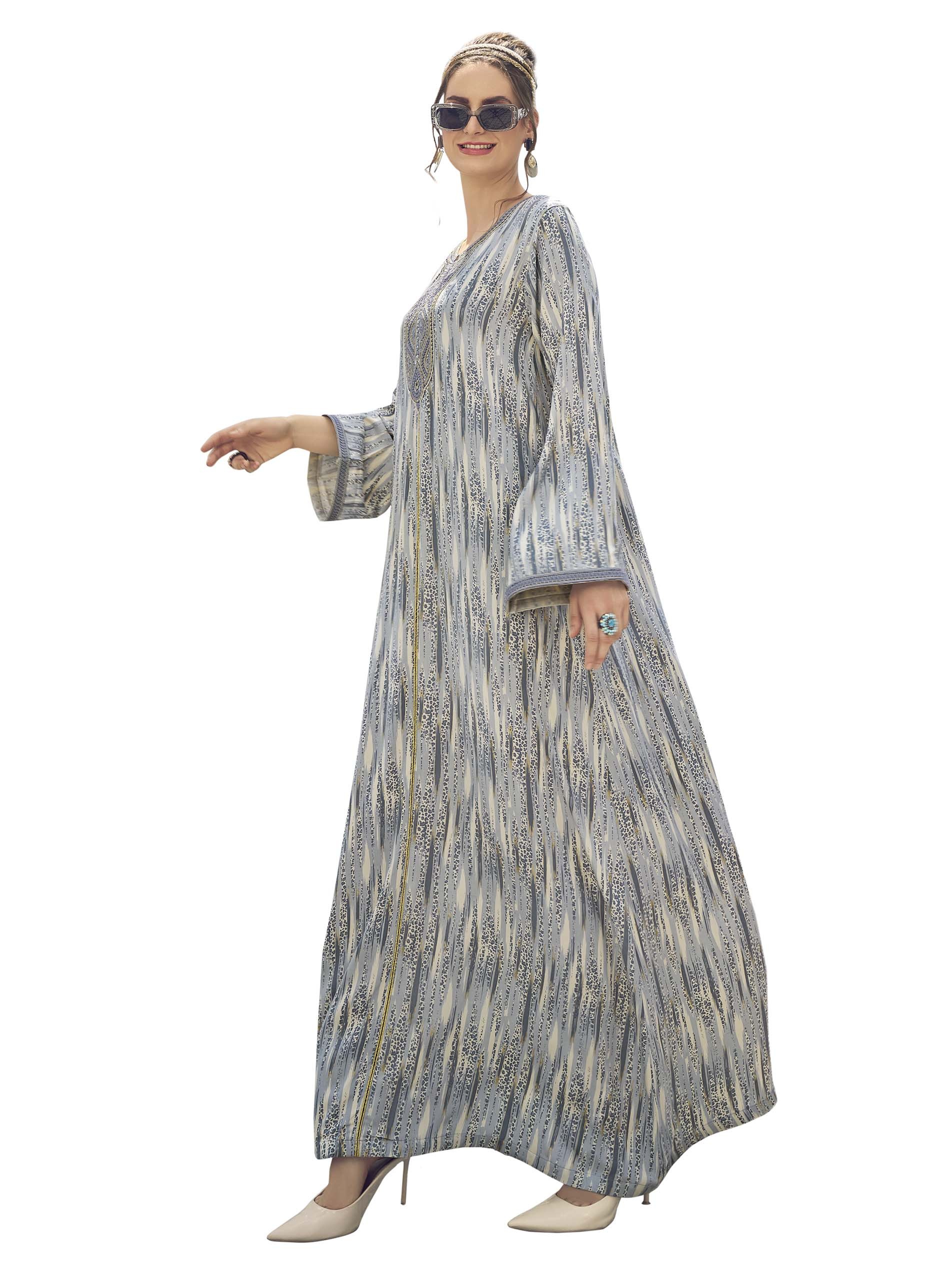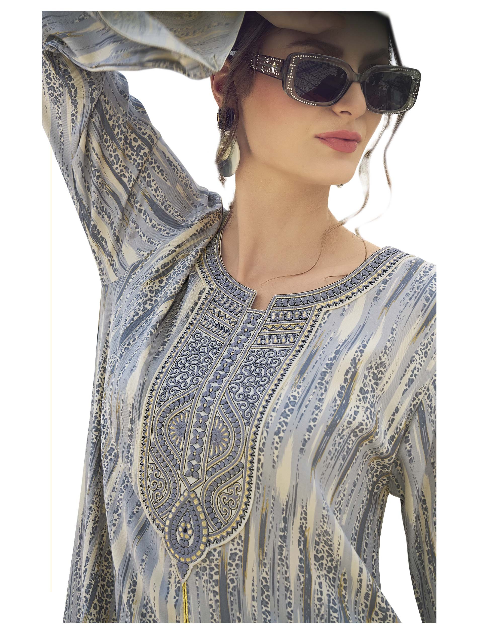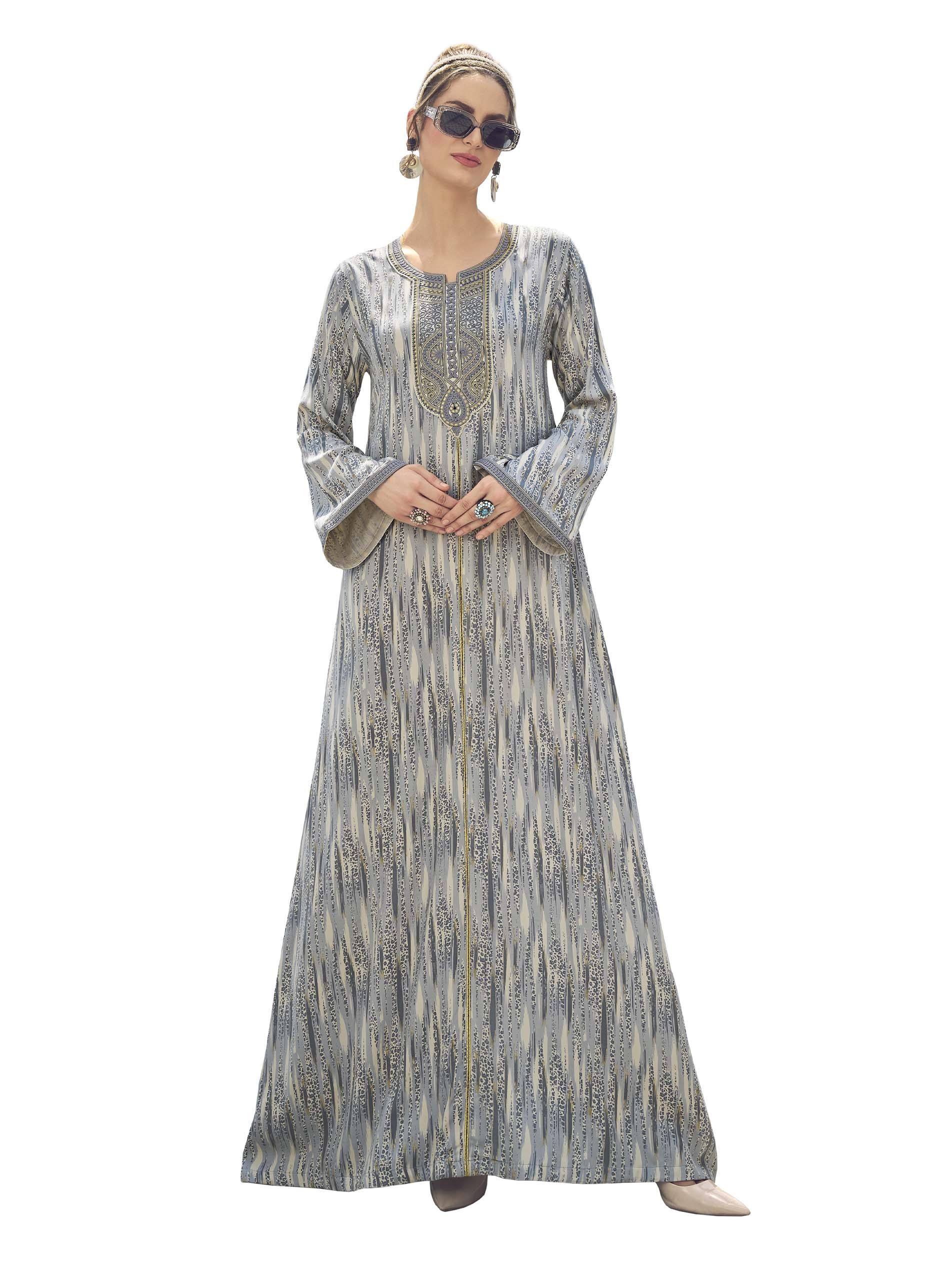 اذا كنتي من محبي التميز، هذه الجلابية يجب أن تكون جزء من خزانتك...مصممة من القطن وملونة باللون الرمادي الرائع مع نقوشات بيضاء مميزة وتطريز على الصدر.
