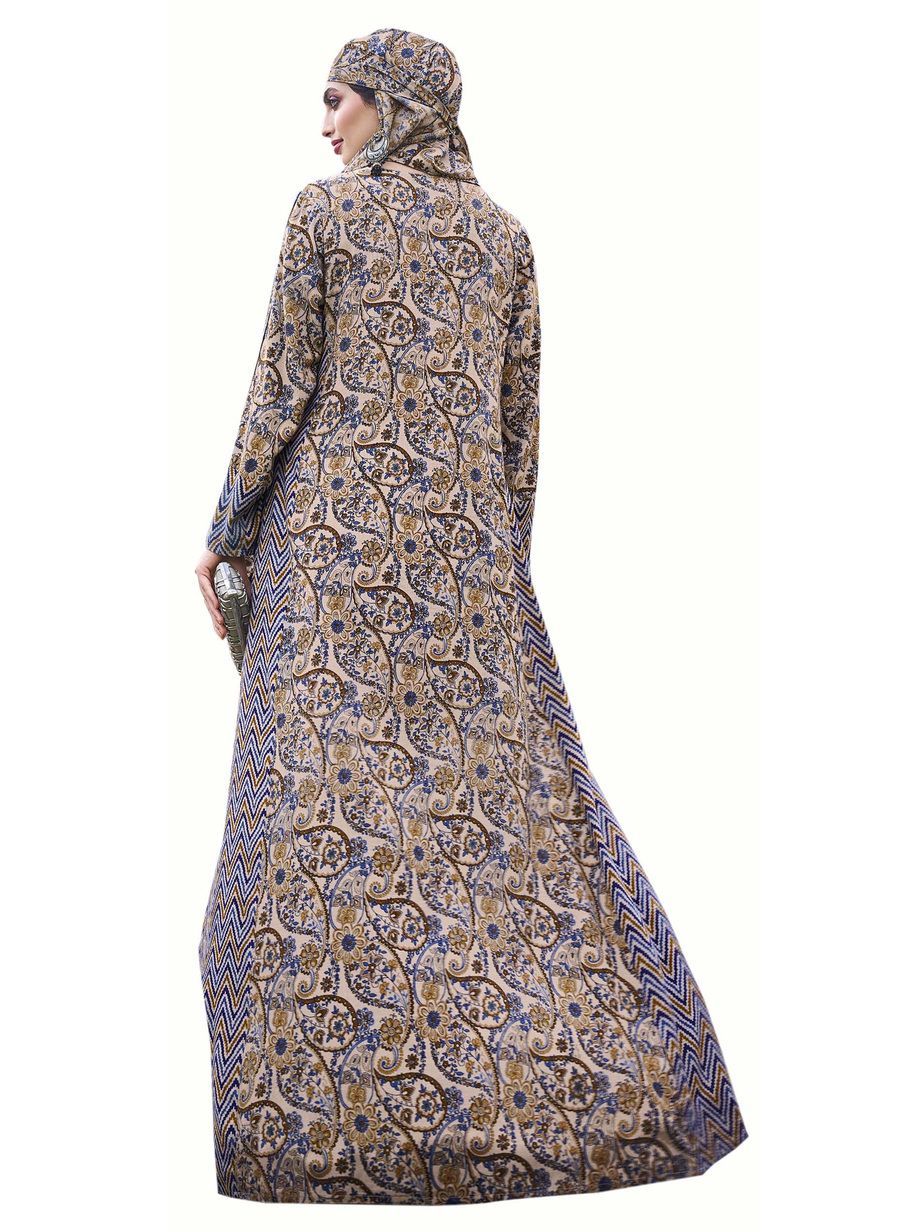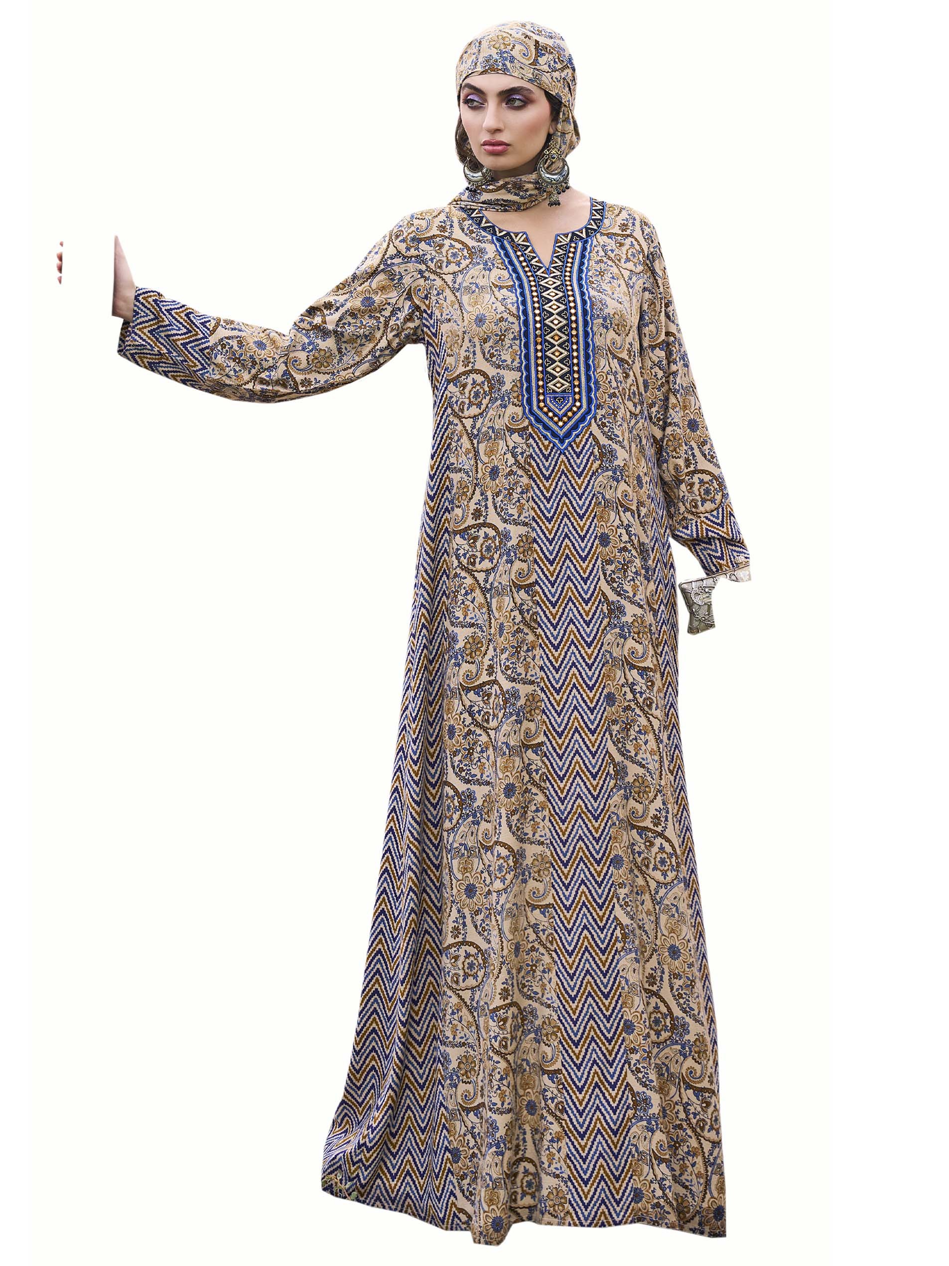 جلابية من القطن بتصميم فريد يدمج بين الزهور والخطوط المتعرجة باللونين الأزرق والذهبي مع أكمام طويلة وتطريز مميز على الصدر.