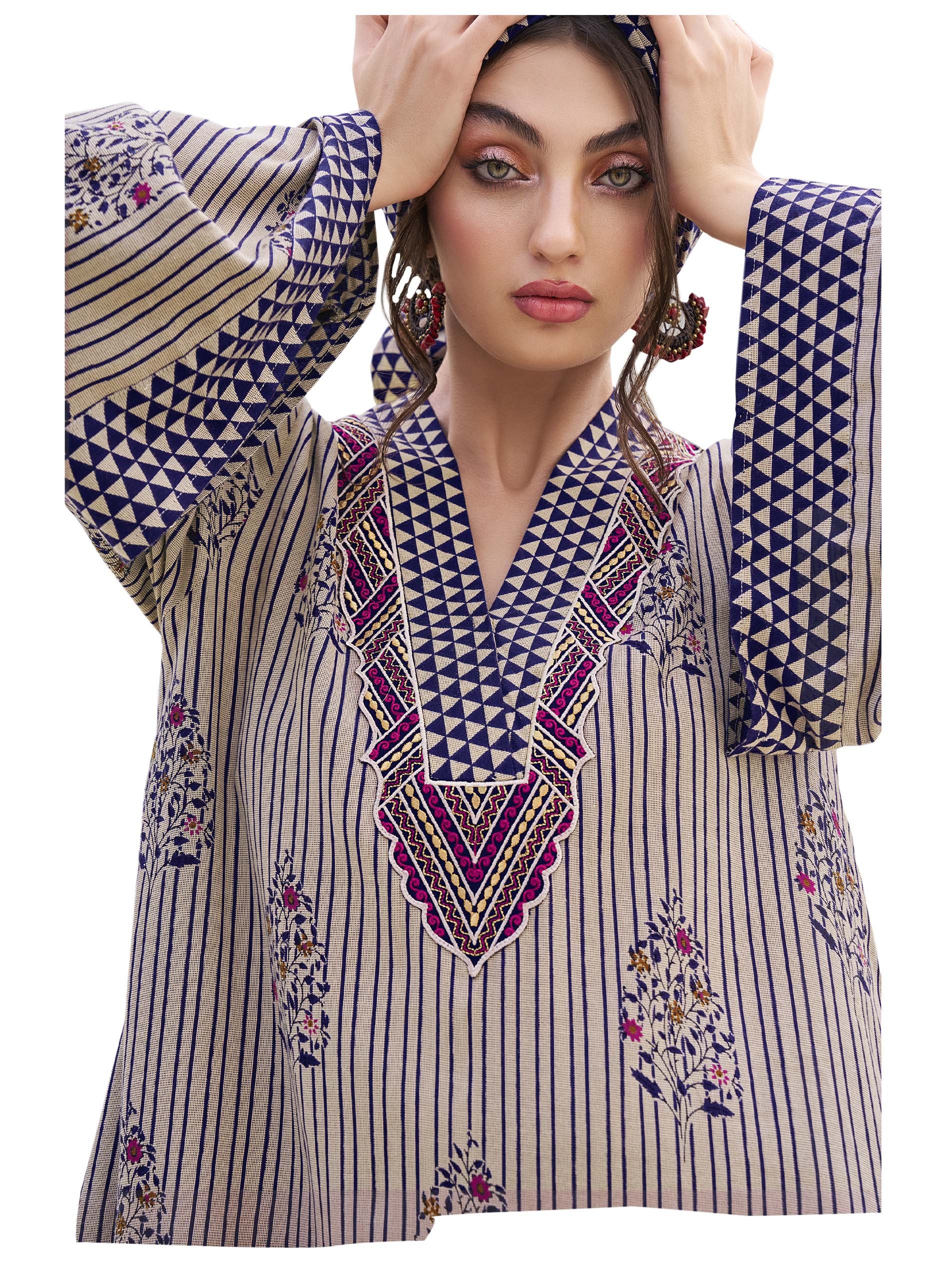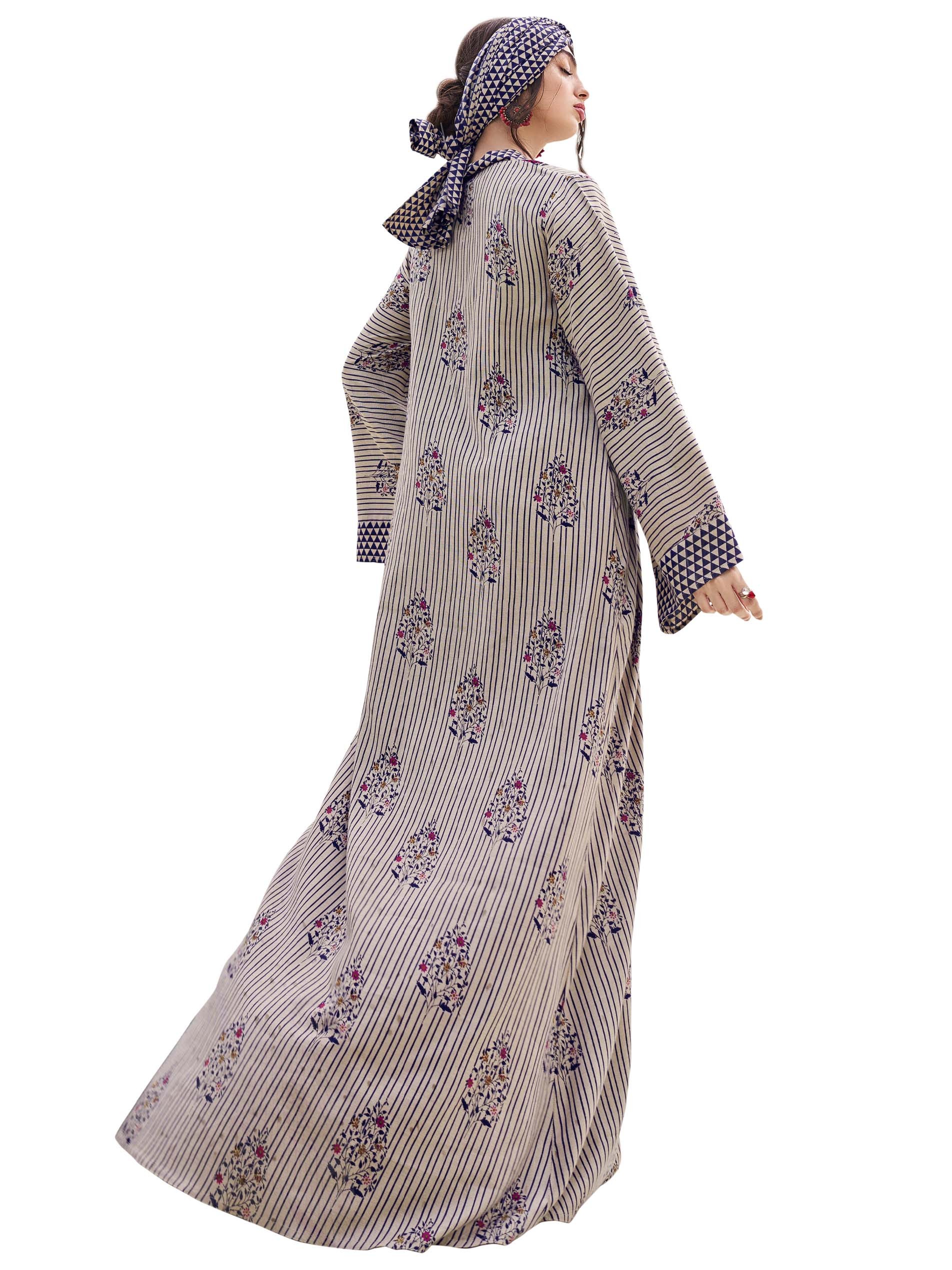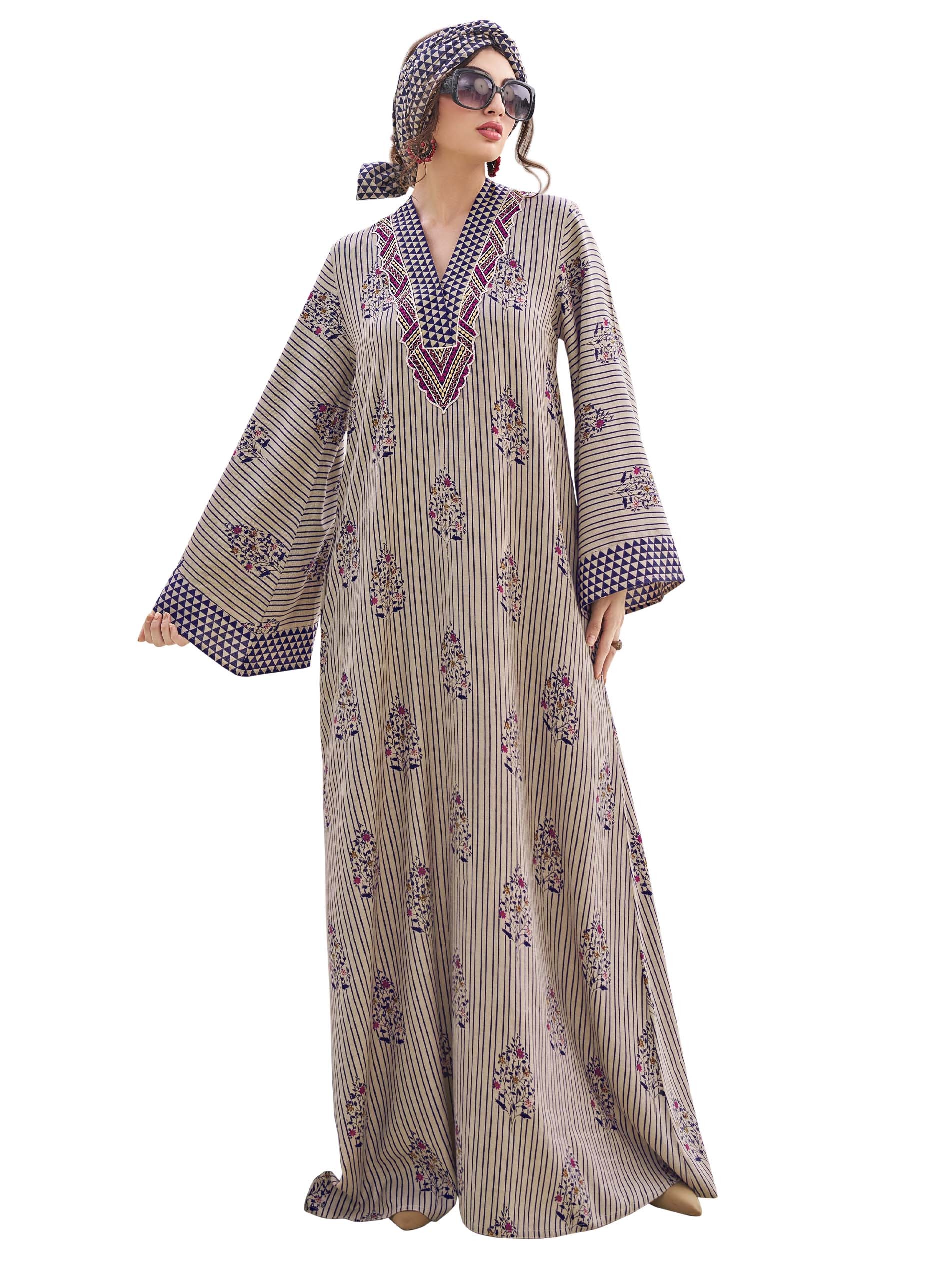 اذا كنتي من محبي البساطة و التميز، هذه الجلابية المخططة يجب أن تكون جزء من خزانتك...مصممة من القطن ومزودة بنقشة الزهور مما يضفي لمسة أنثوية ورقيقة على التصميم.
