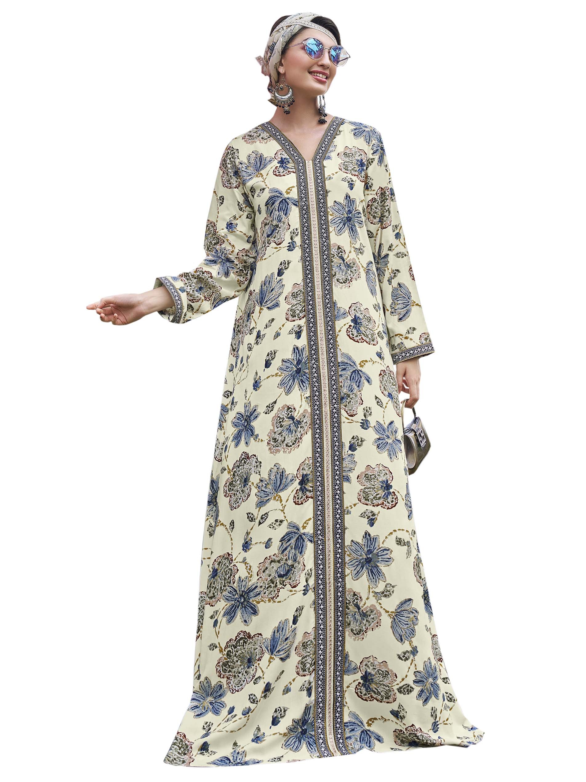 جلابية من القطن بيضاء اللون مصممة لمحبي البساطة والأناقة..مزودة بنقشة الأزهار الزرقاء مع تطريز مميز يمتد بطول الجلابية.