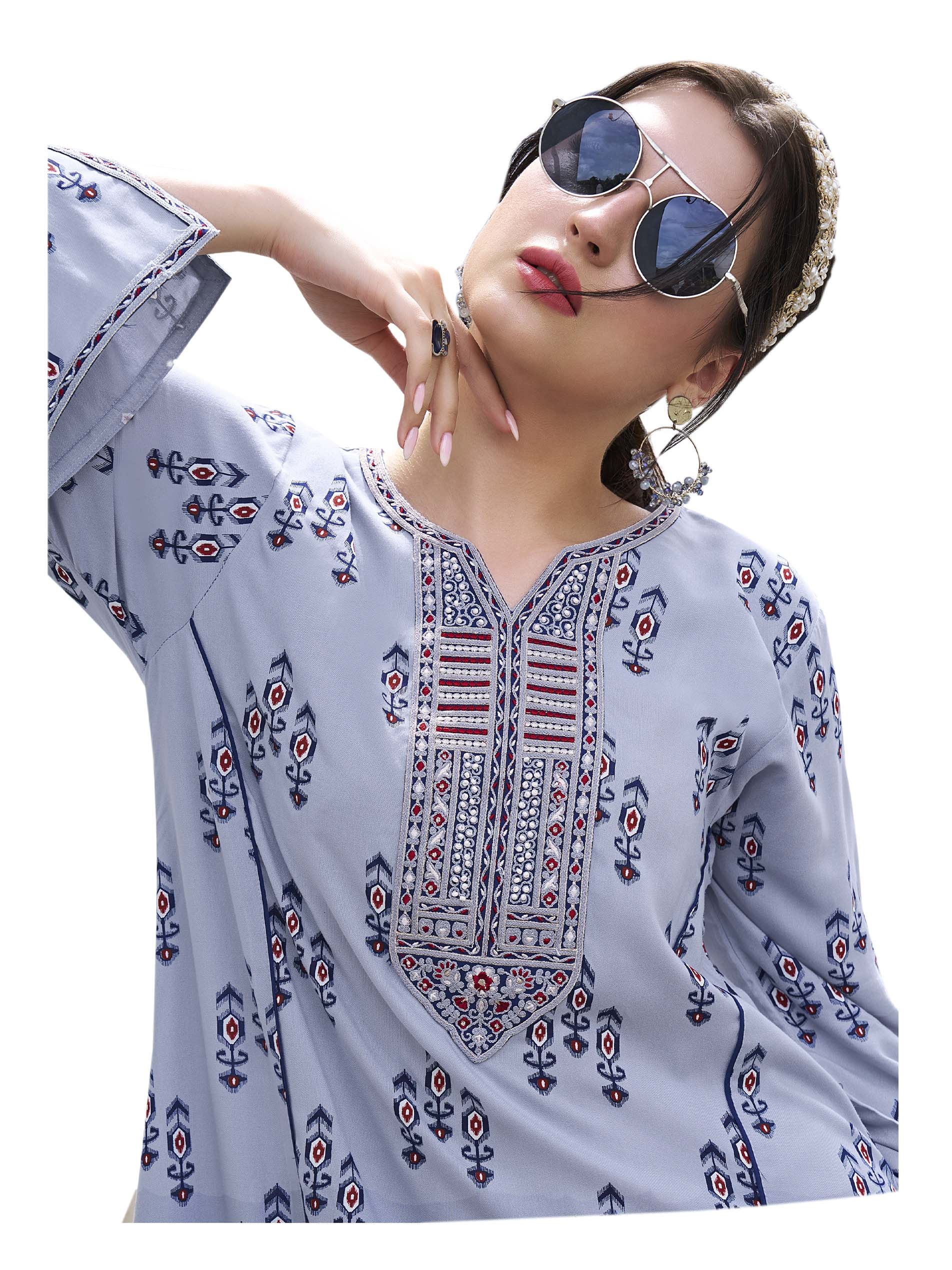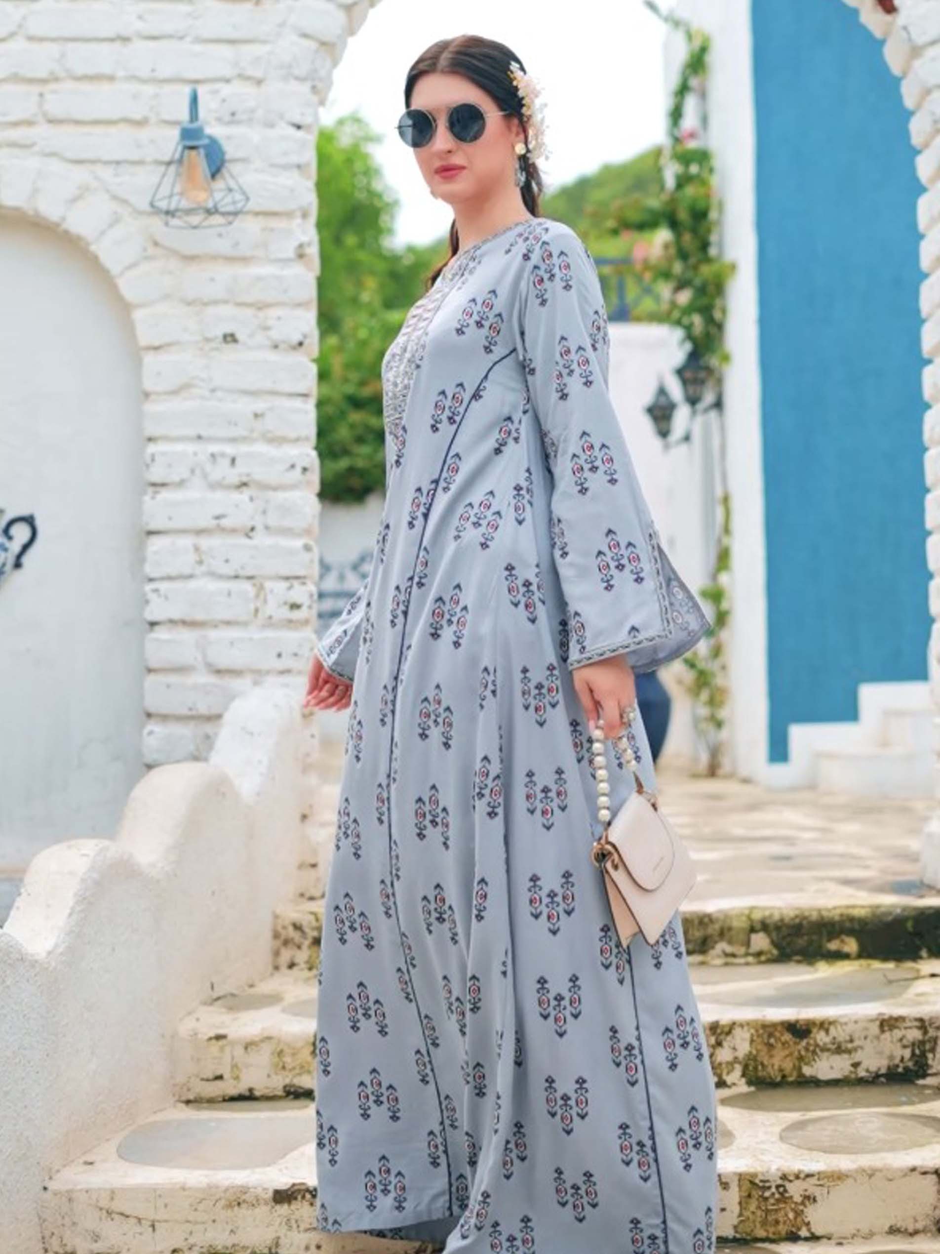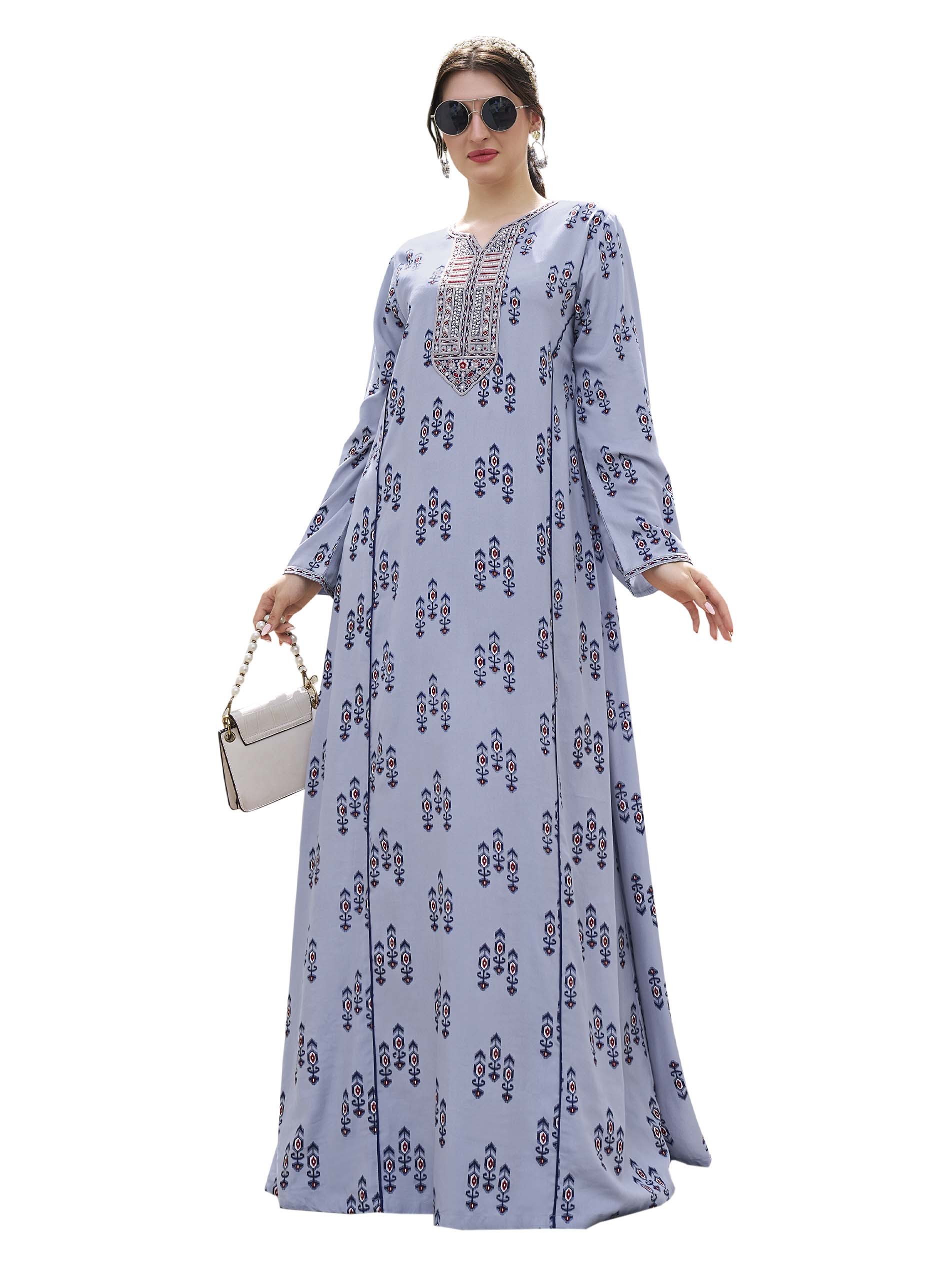 صممت هذه الجلابية لعشاق البساطة والتميز، فهي تأتي بلون أزرق فاتح دافئ ومزينة بتطريزات ناعمة تعكس رقيك!