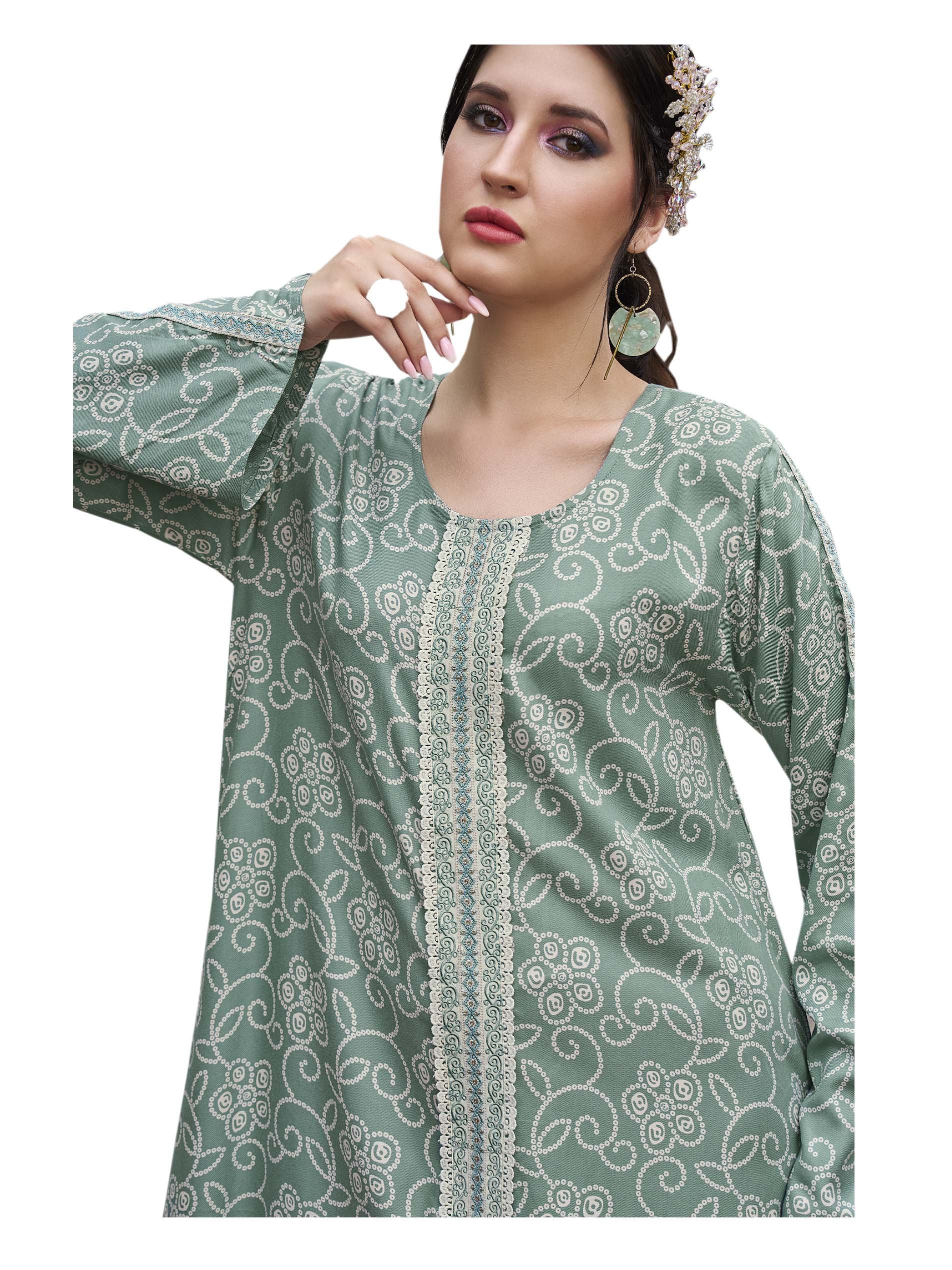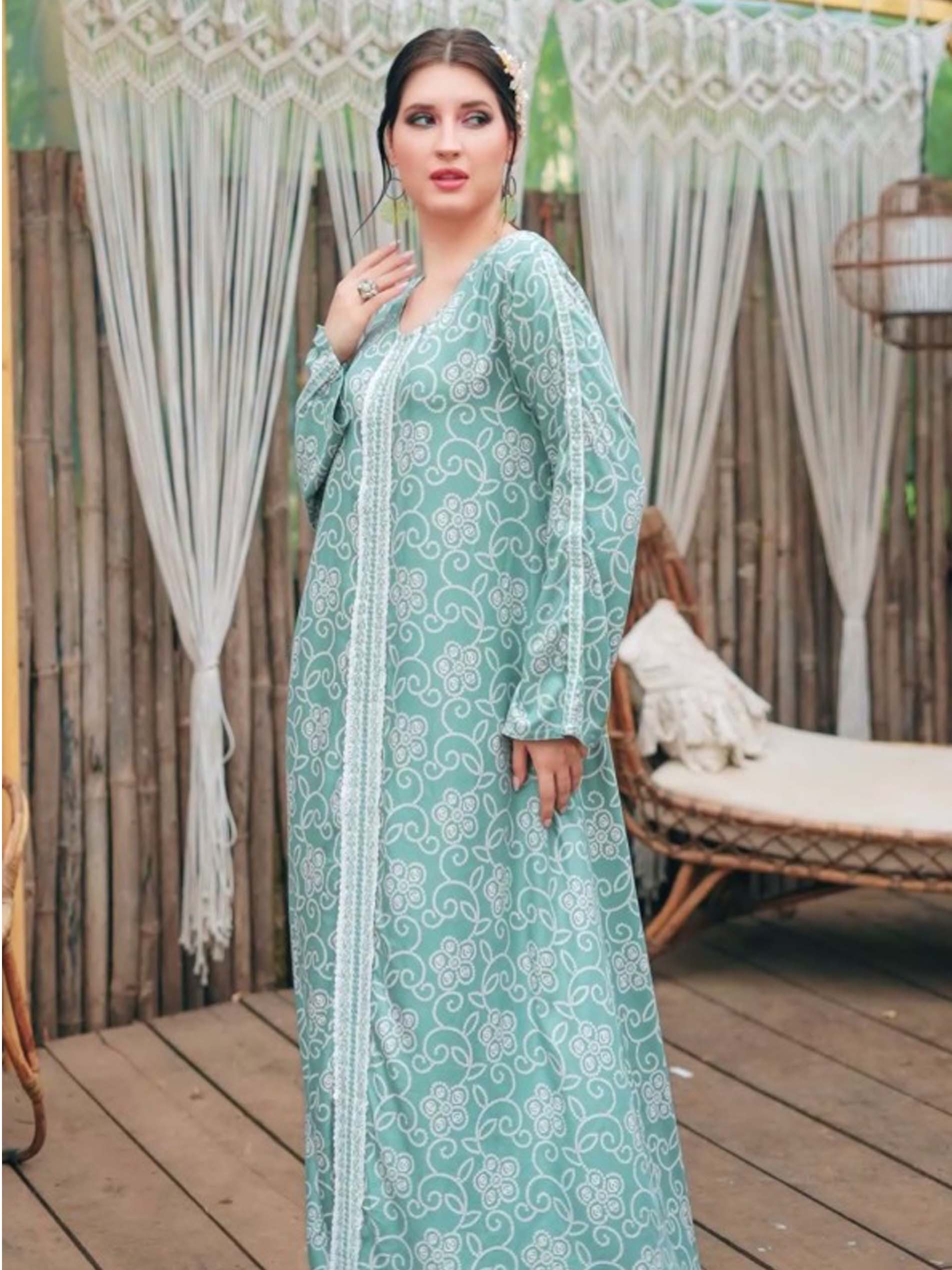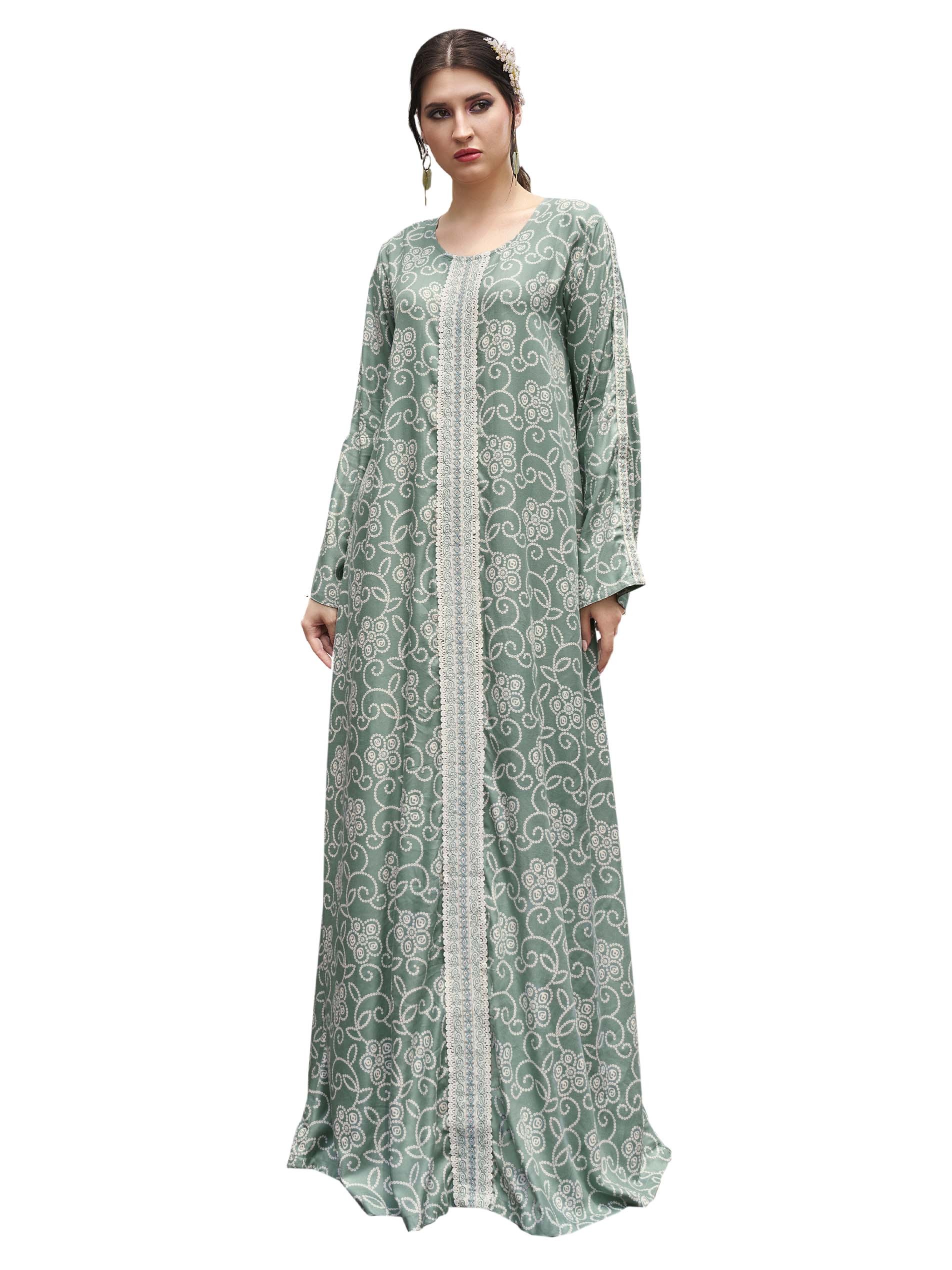 جلابية بقصة A-line مصممة من القطن وملونة باللون الرمادي الفاتح. ويكتمل التصميم بنقشة الزهور البيضاء وتطريز أبيض يمتد بطول الجلابية.