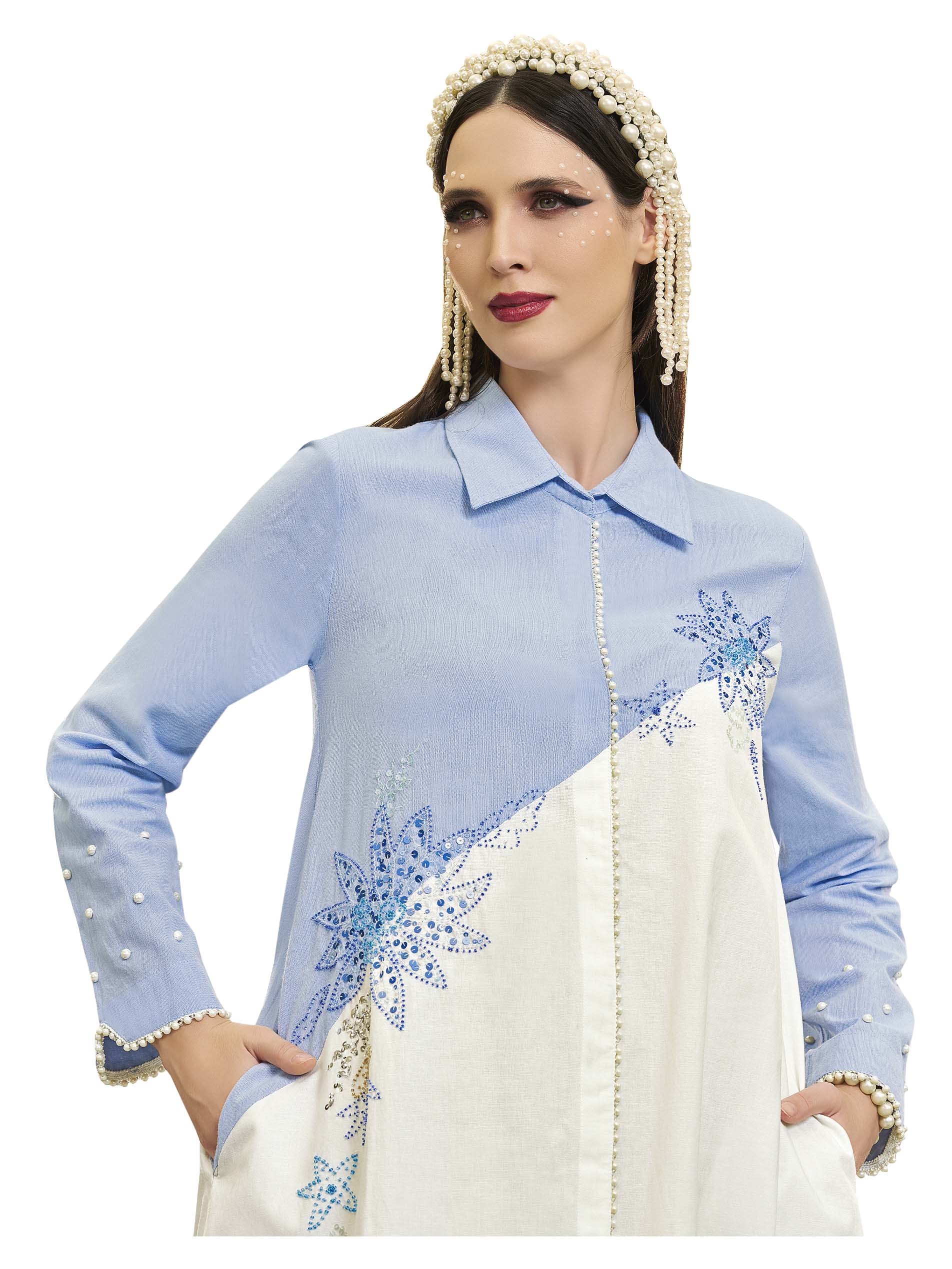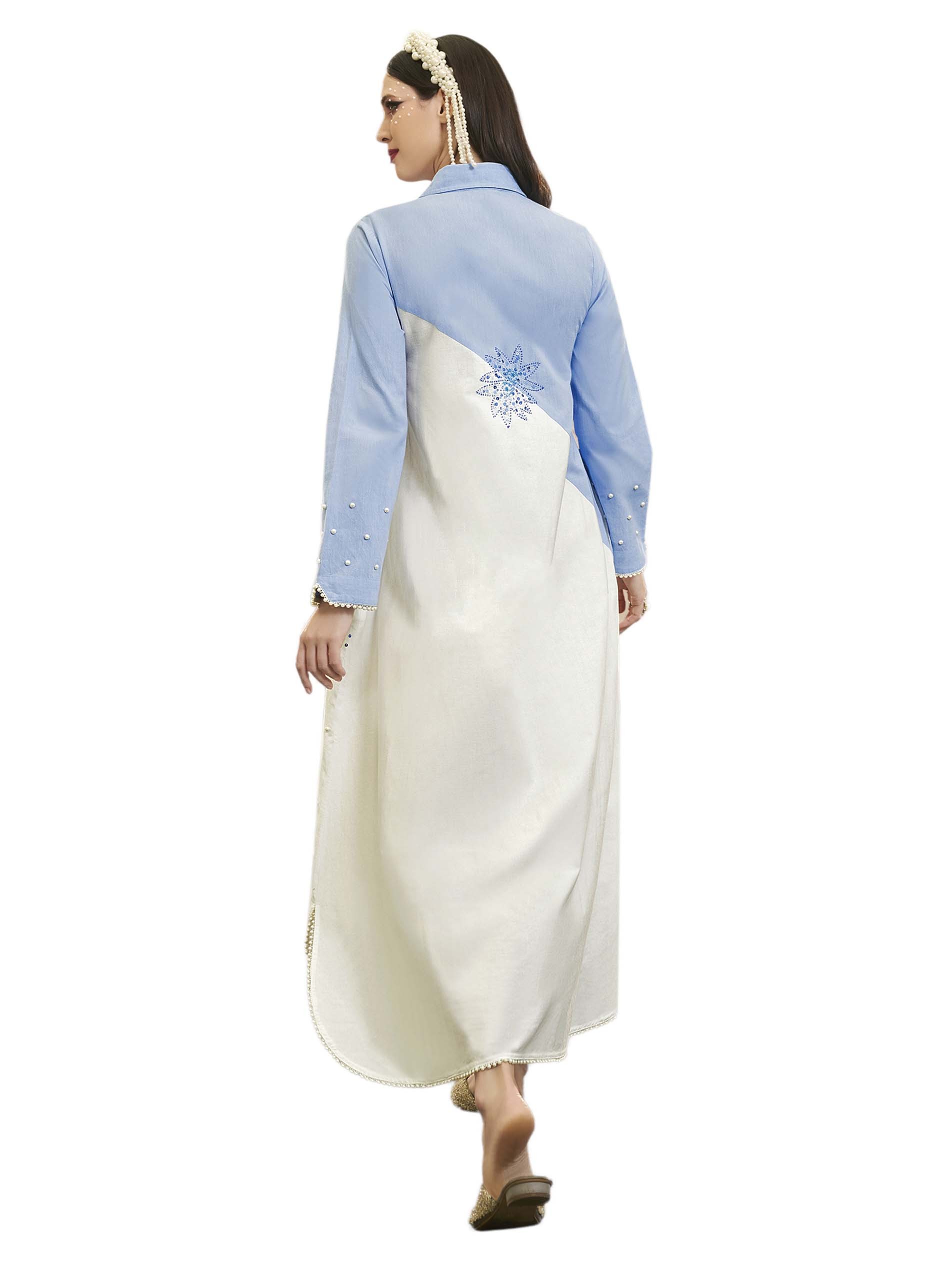 جلابية بتصميم بسيط مصنوعة من القطن باللونين الأزرق والأبيض مع تطريز بسيط على شكل نقشة الأزهار لاطلالة فريدة من نوعها في الحفلات والمناسبات.