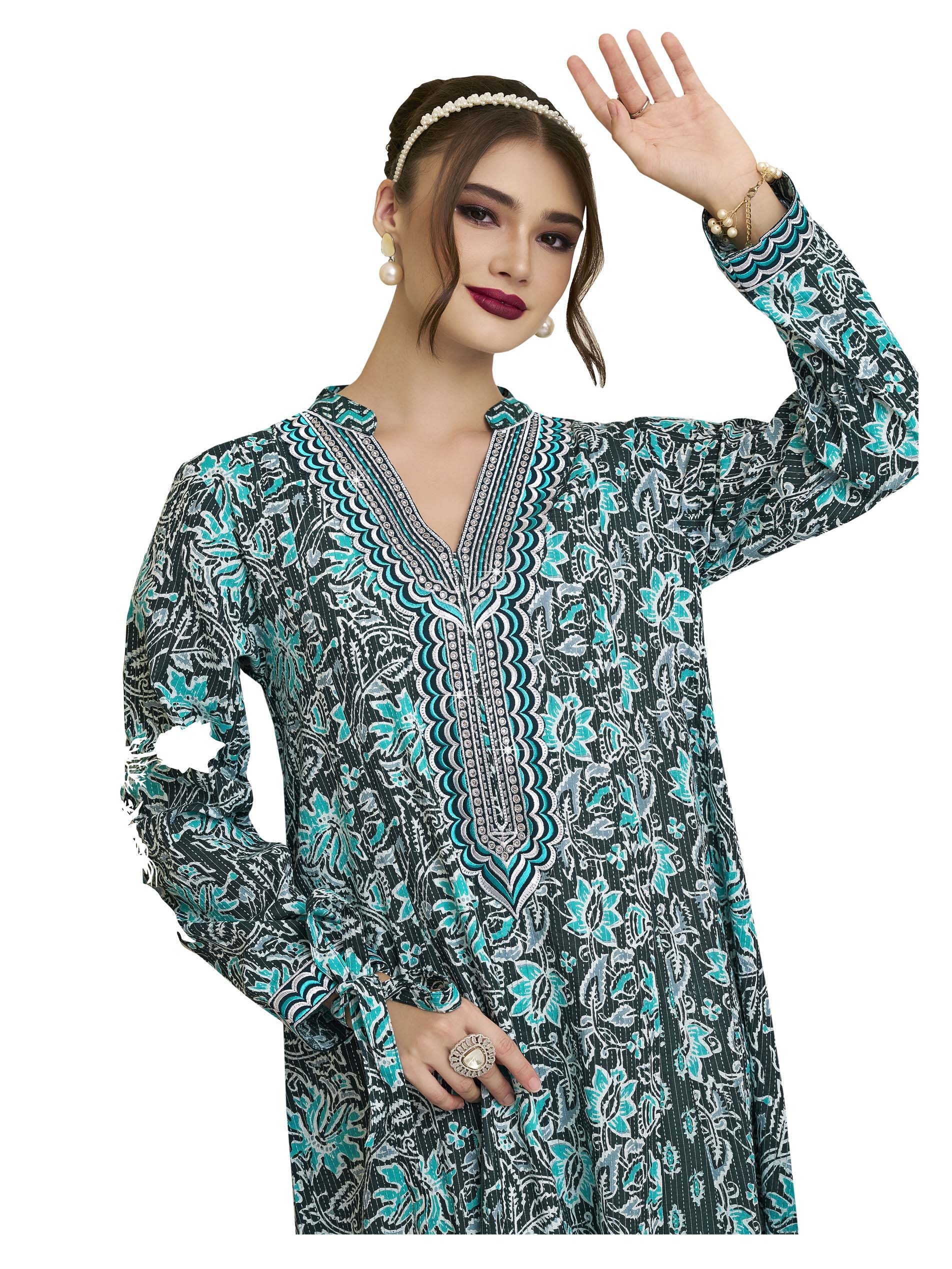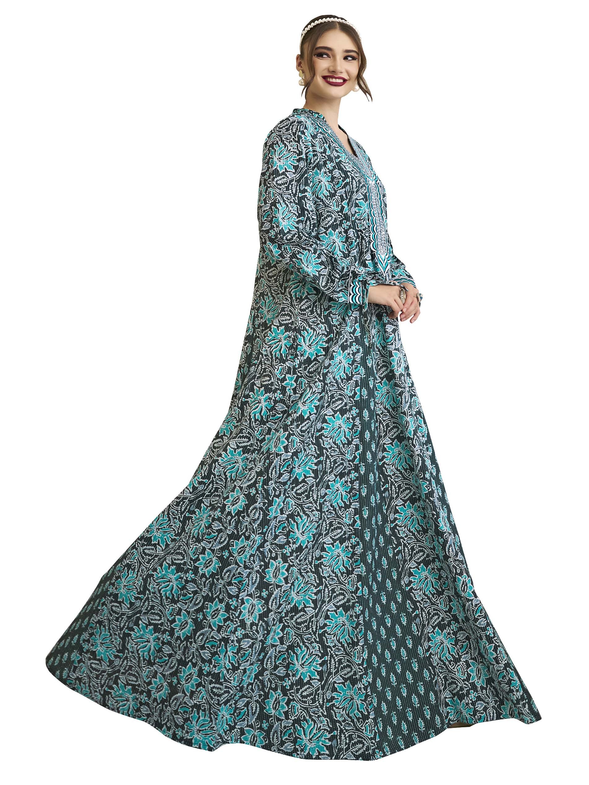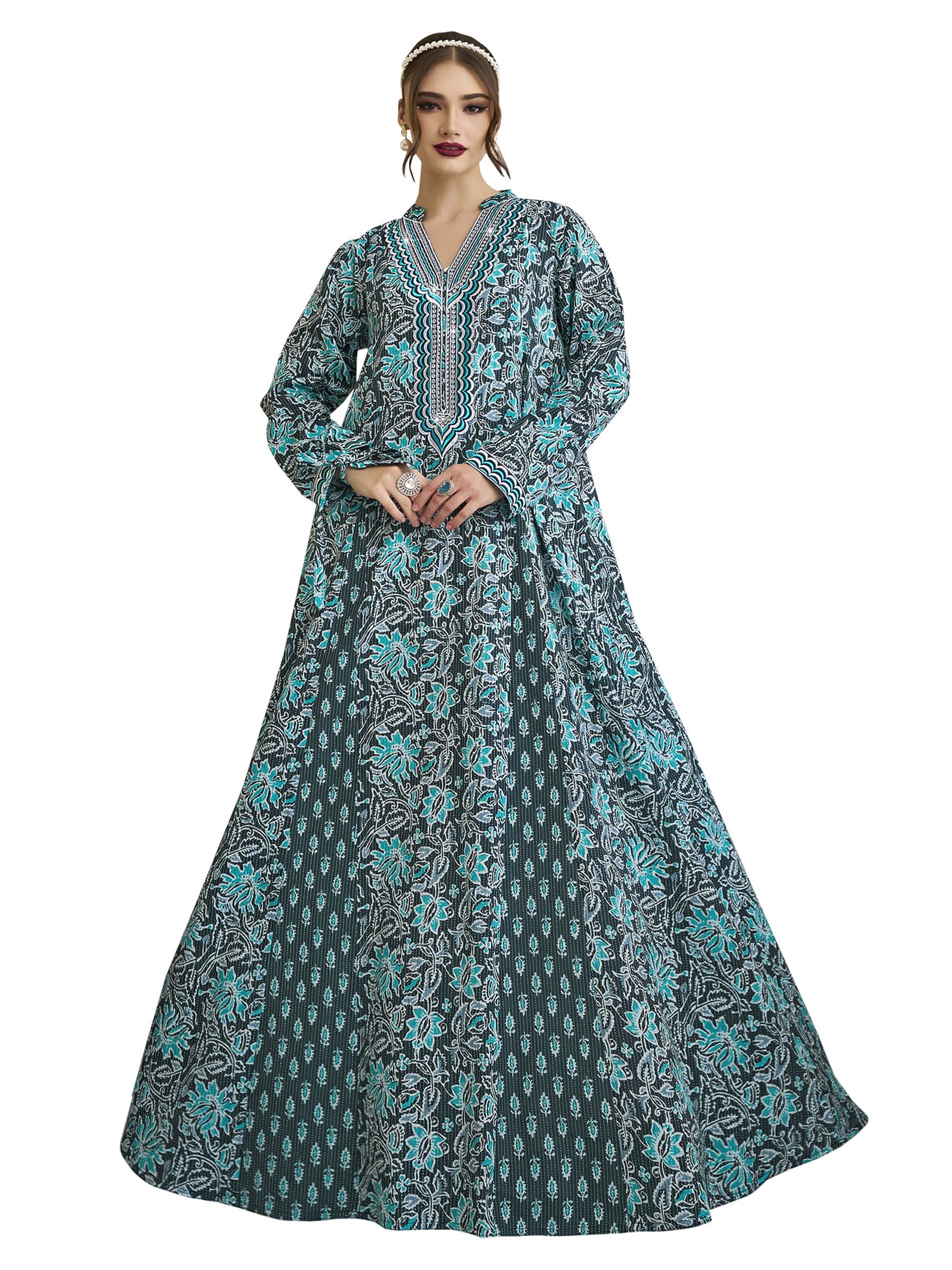 جلابية ماكسي طويلة من القطن، مصممة باللونين الأزرق والكحلي مع نقشة الزهور وتطريز على الصدر مرصع بالكريستال لاطلالة فريدة من نوعها في المناسبات.