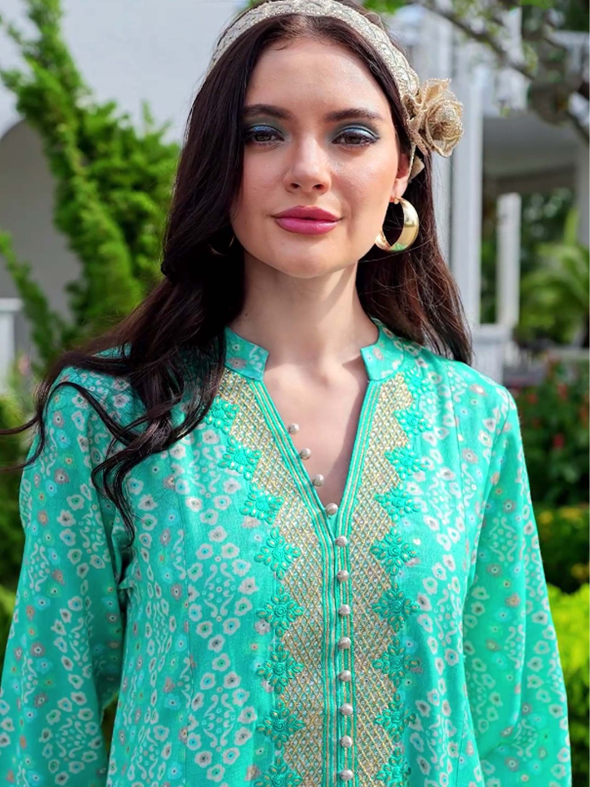 تألقي في جلابية من القطن باللون الأزرق السماوي مصممة بنقشة الزهور البيضاء مع نقشة الخطوط المتعرجة. ويكتمل التصميم بنقشة ذهبية على الصدر مع أزرار أمامية.