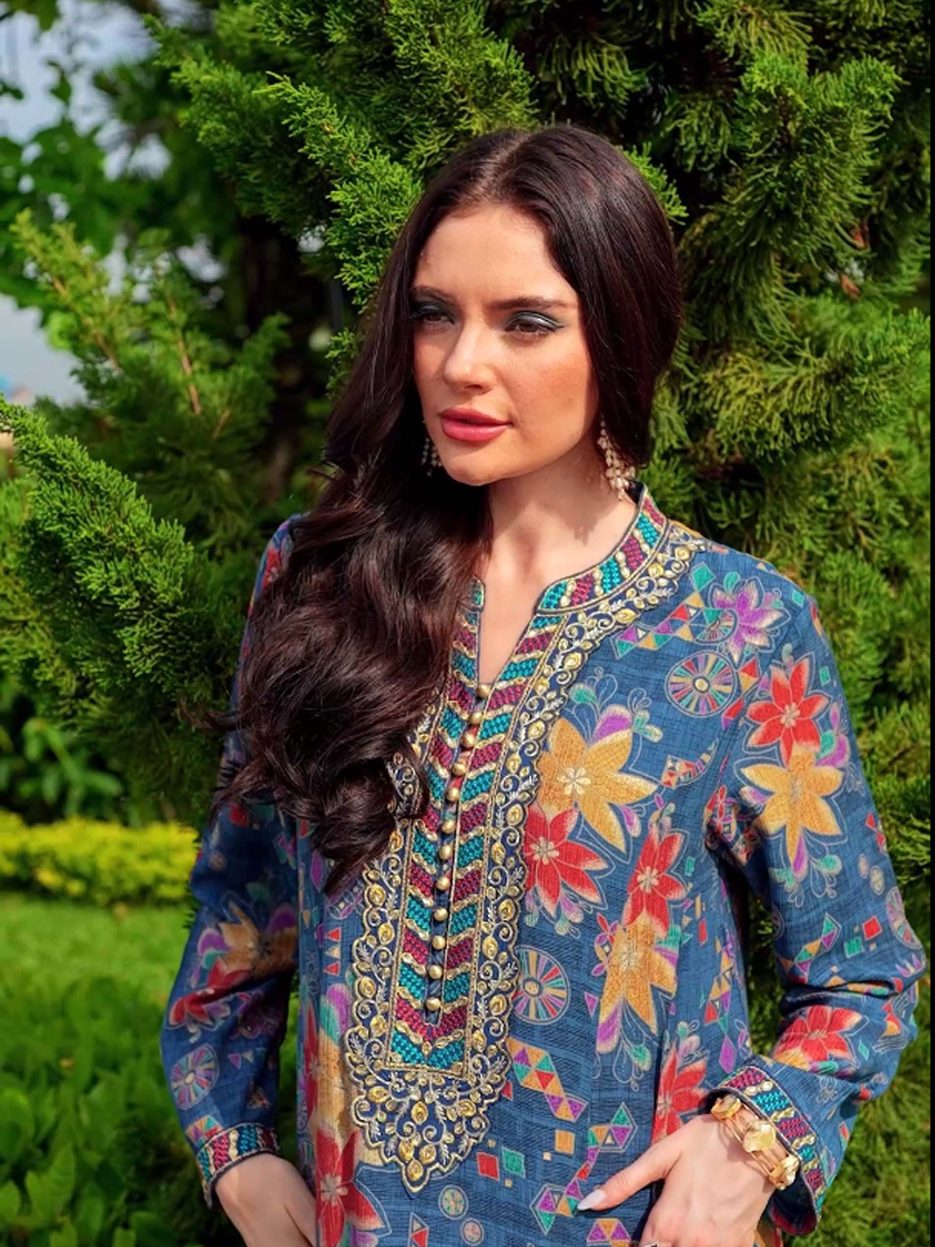 جلابية من الكريب الناعم باللون الأزرق مصممة بنقشة الأزهار باللونين الأصفر والنبيتي مع أكمام طويلة. ويكتمل التصميم بنقشة رائعة على الصدر، يضفي عليها اللون الذهبي مع أزرار أمامية لاضافة لمسة رائعة للجلابية.