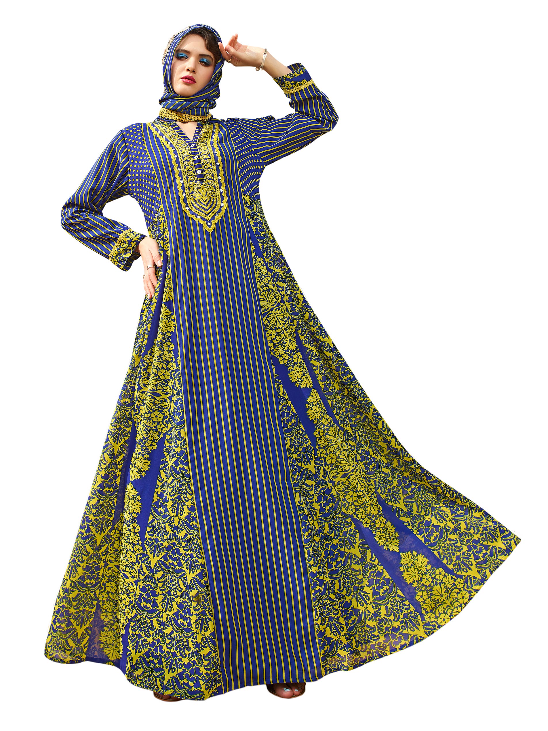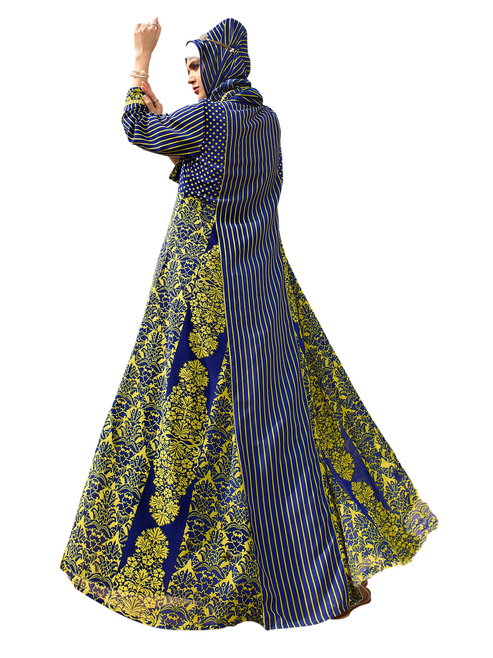 Flare up this summer as you shine bright in a green and blue stunning jalabiya. Adorn the full length flare Arabian party jalabiya from Sara Arabia. Styled in V neck and full sleeves for summer, in flowing chiffon. The richness and lustre of the rustic Damask design will set you apart from convention.