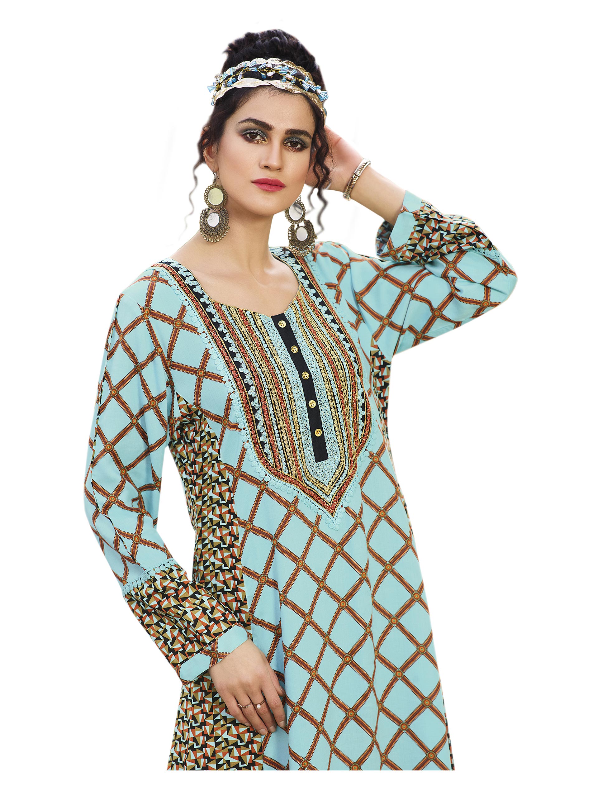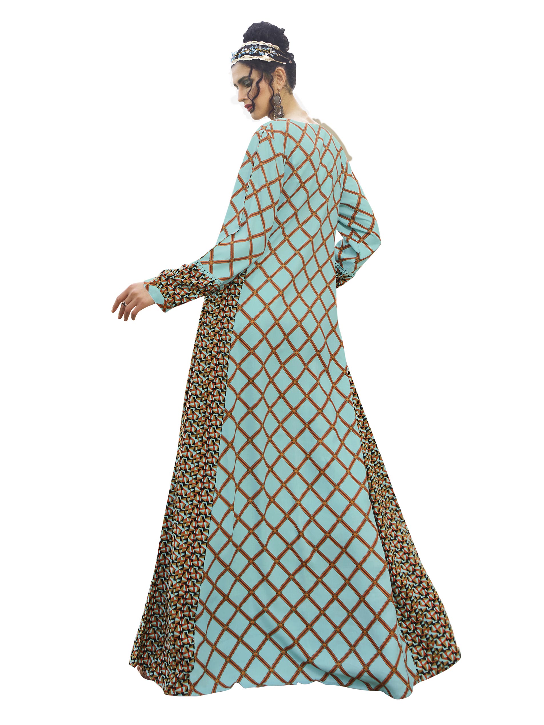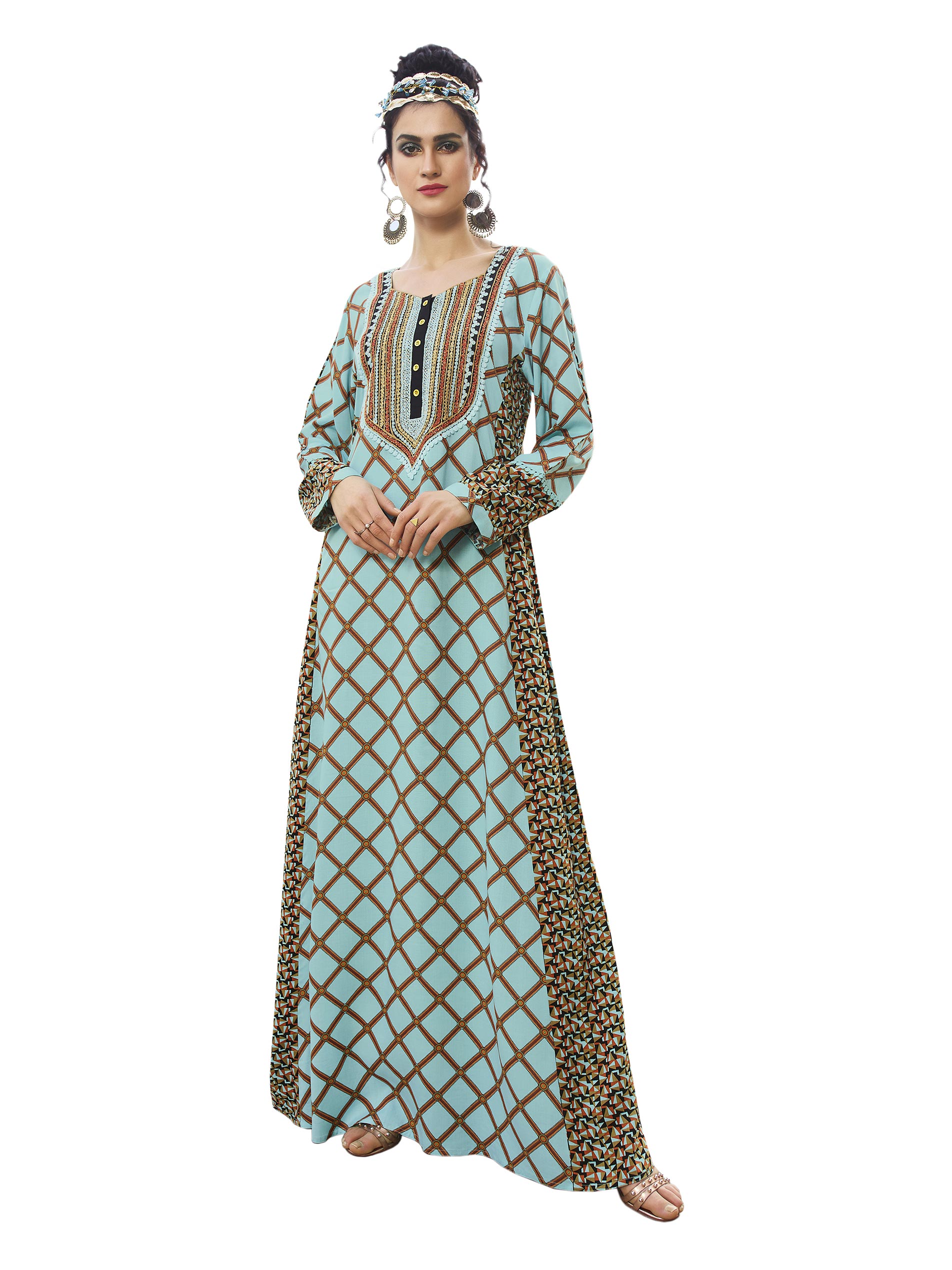 Turquoise is majestic and elegant. A full length jalabiya in the colour designed in a V neck, full sleeves and an A-line cut, the checkered print rayon fabric looks cool and comfortable for summer. A flare Arabian dress from Sara Arabia. Order online before it disappears.