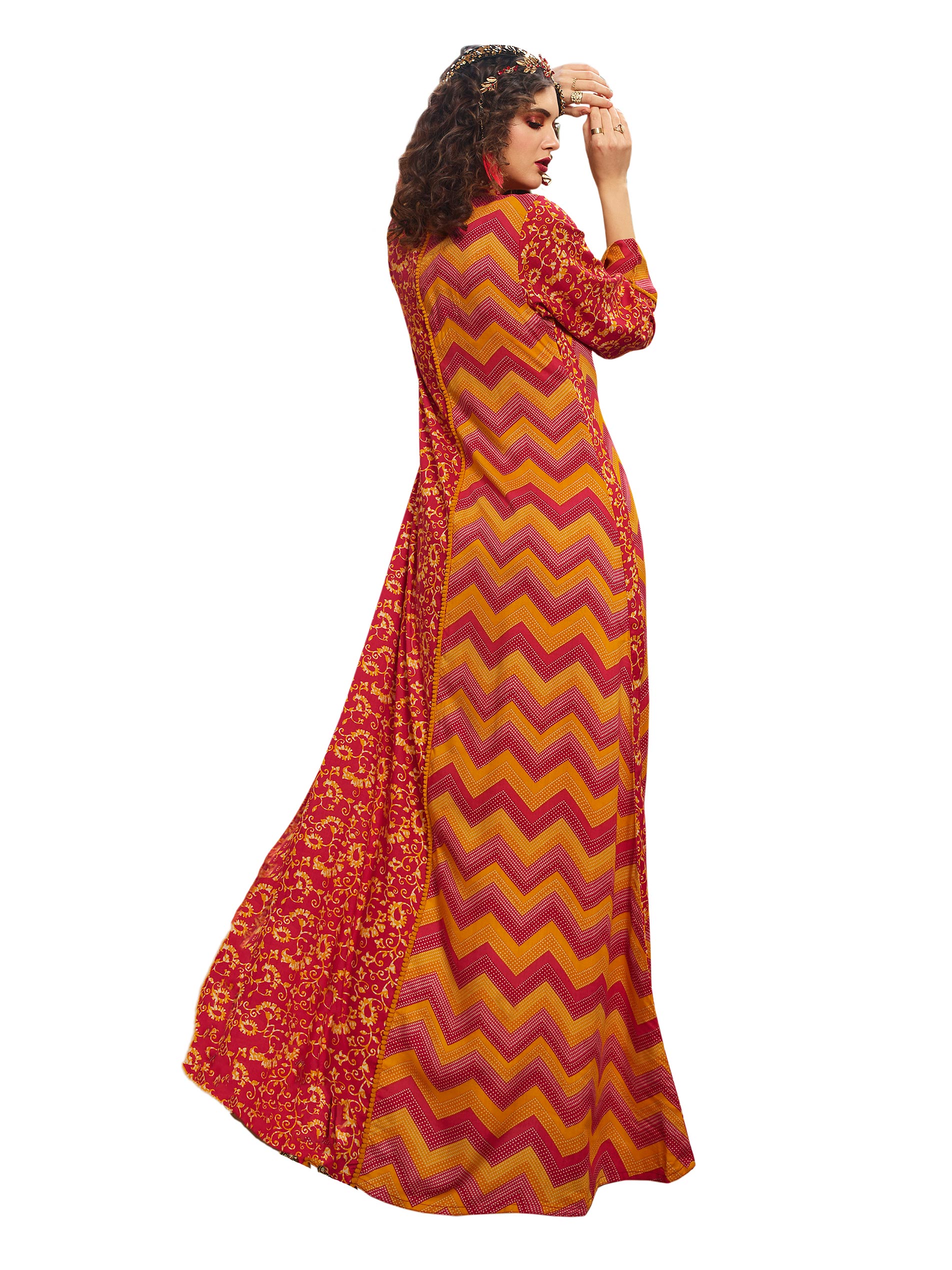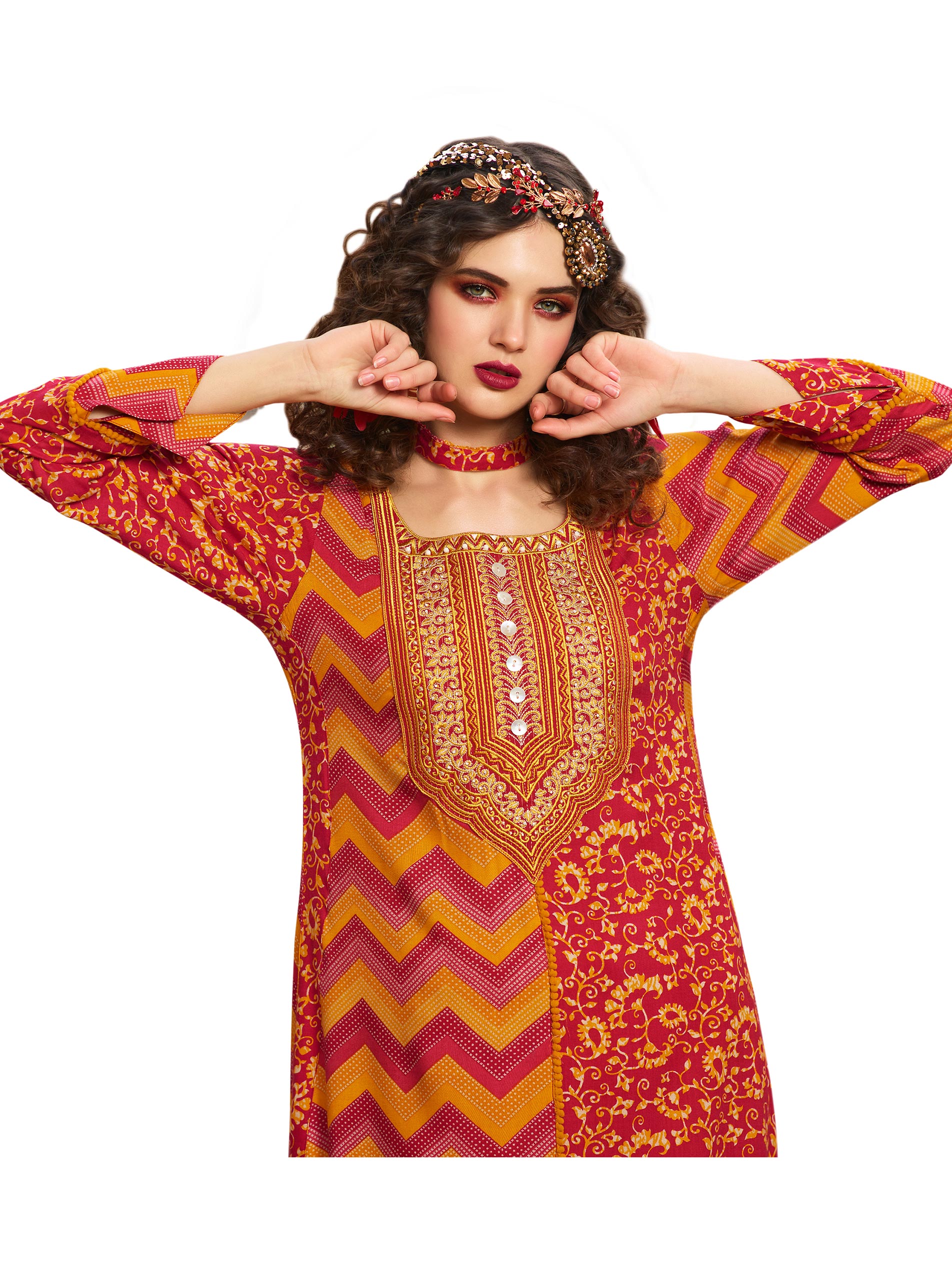 Red stands for power, grace, love and courage. This passionately designed red full length jalabiya is styled in a multiple print rayon fabrics. The full sleeves and the round neck with an A-line cut look simply stunning in the daring red. Sara Arabia online has the most pretty Arabian dresses.