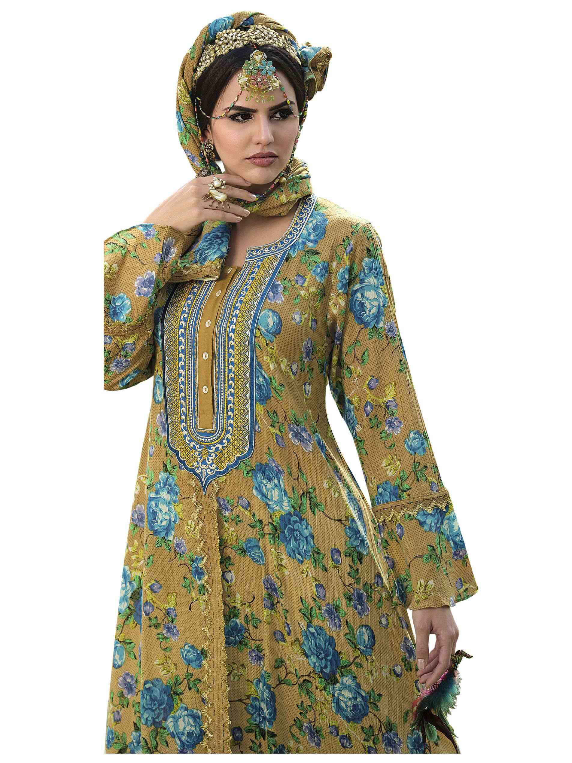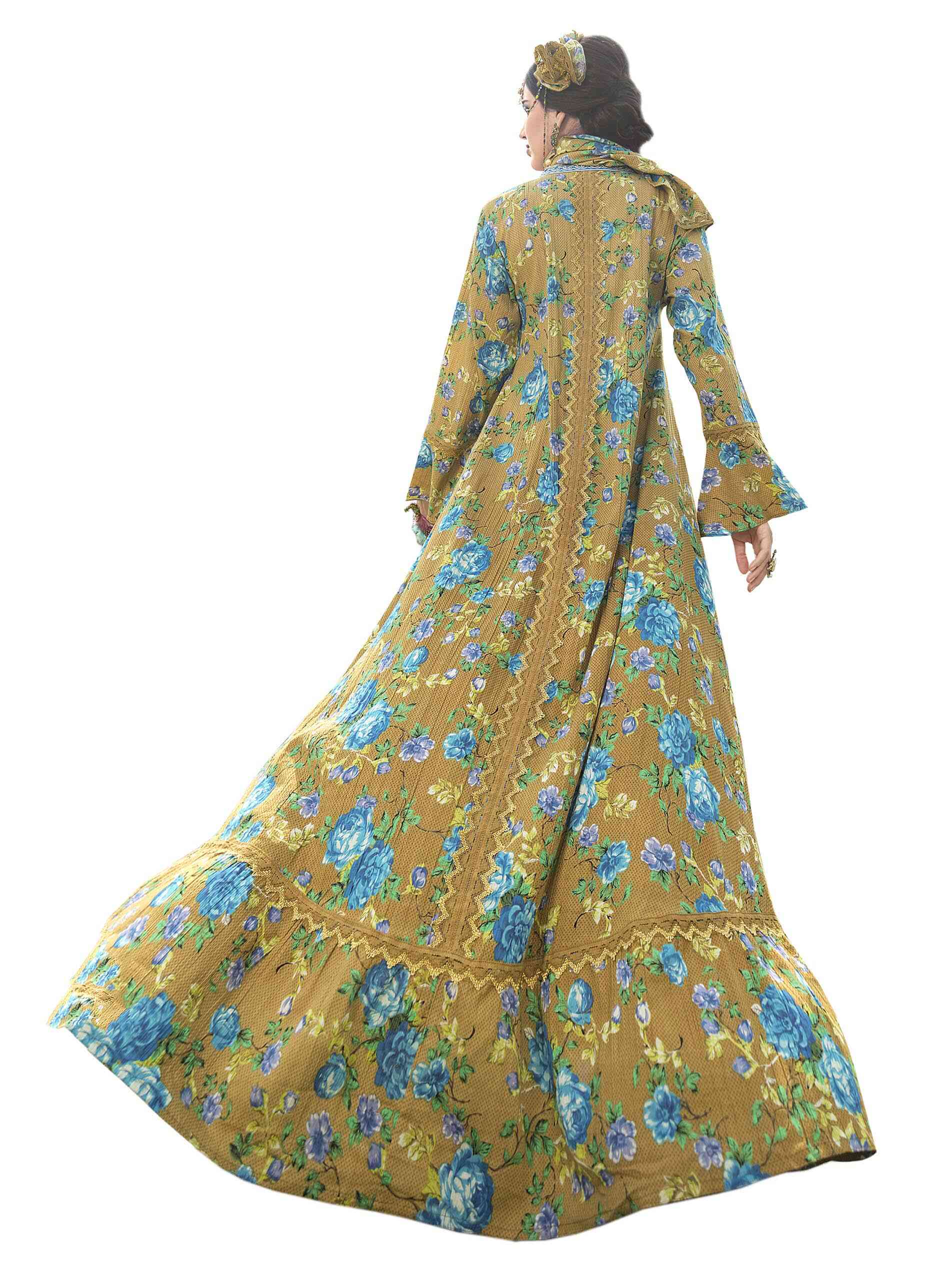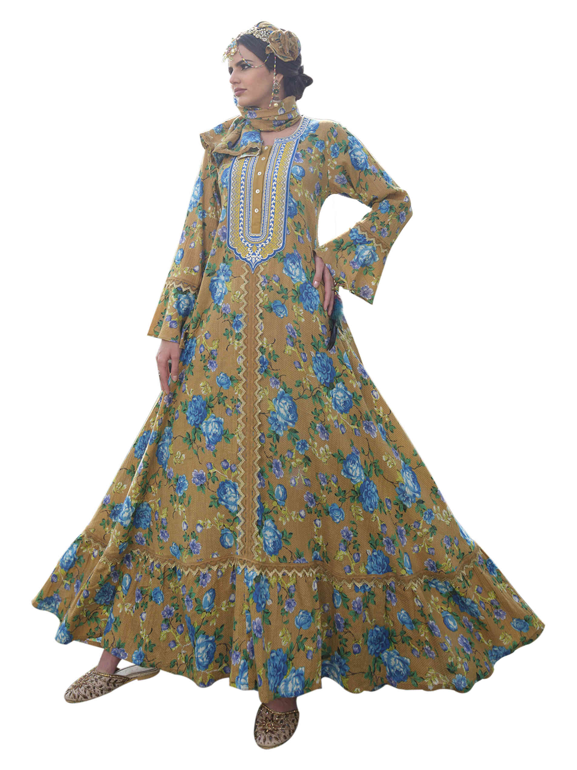 Bask in joy this summer with a full length floral cotton jalabiya enhanced in design with full sleeves , notch neck and a flare hemline to add sheer grace to your style. Speerhead a celebration in hues of multiple colours.