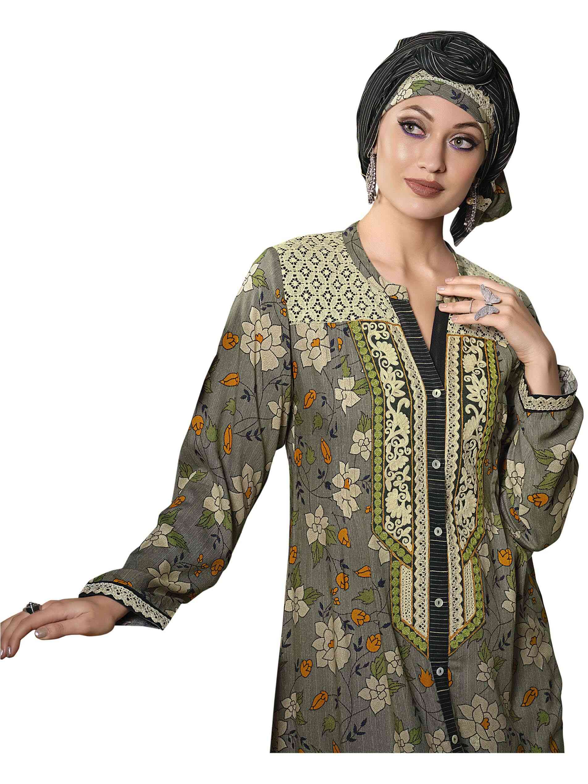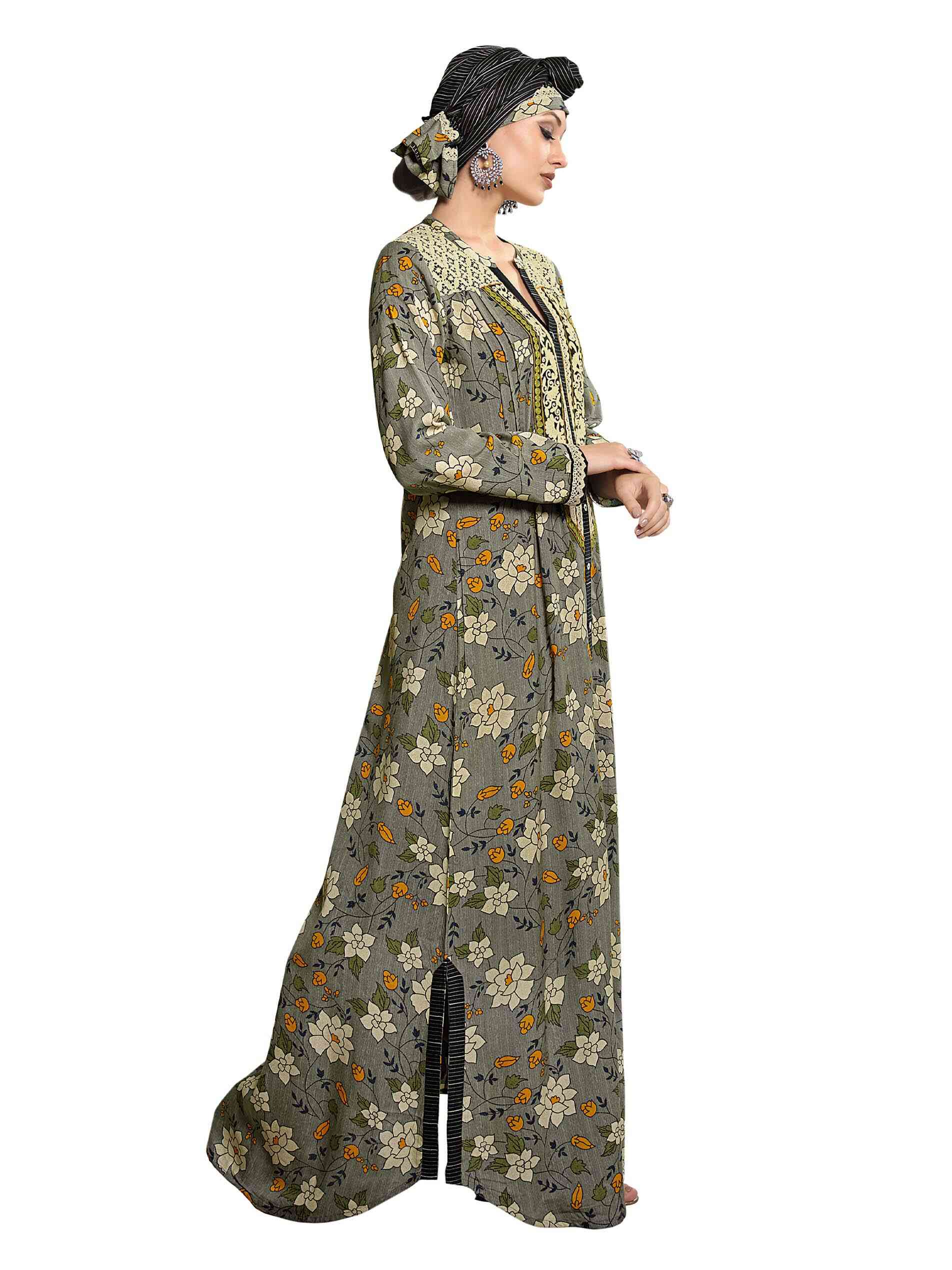 Welcome summer dressed in your best. The grey full length jalabiya is a complete charmer as it is highlighted in viscose fabric with a floral print. The full sleeves and V neck give it an enigmatic appearance, creating an aura of mystery in grey. The A line cut adds to its secretive vibe.