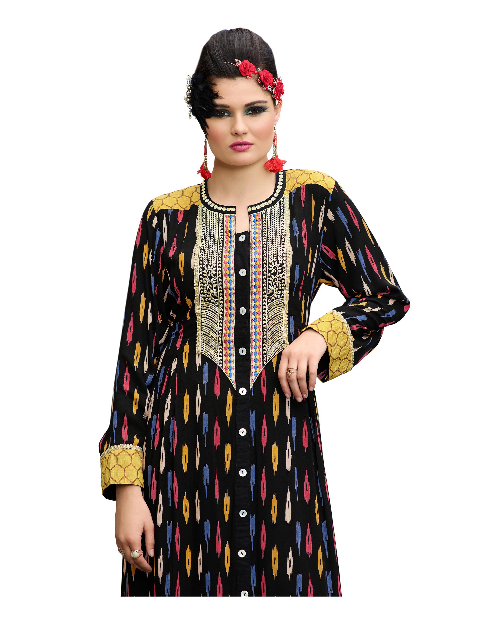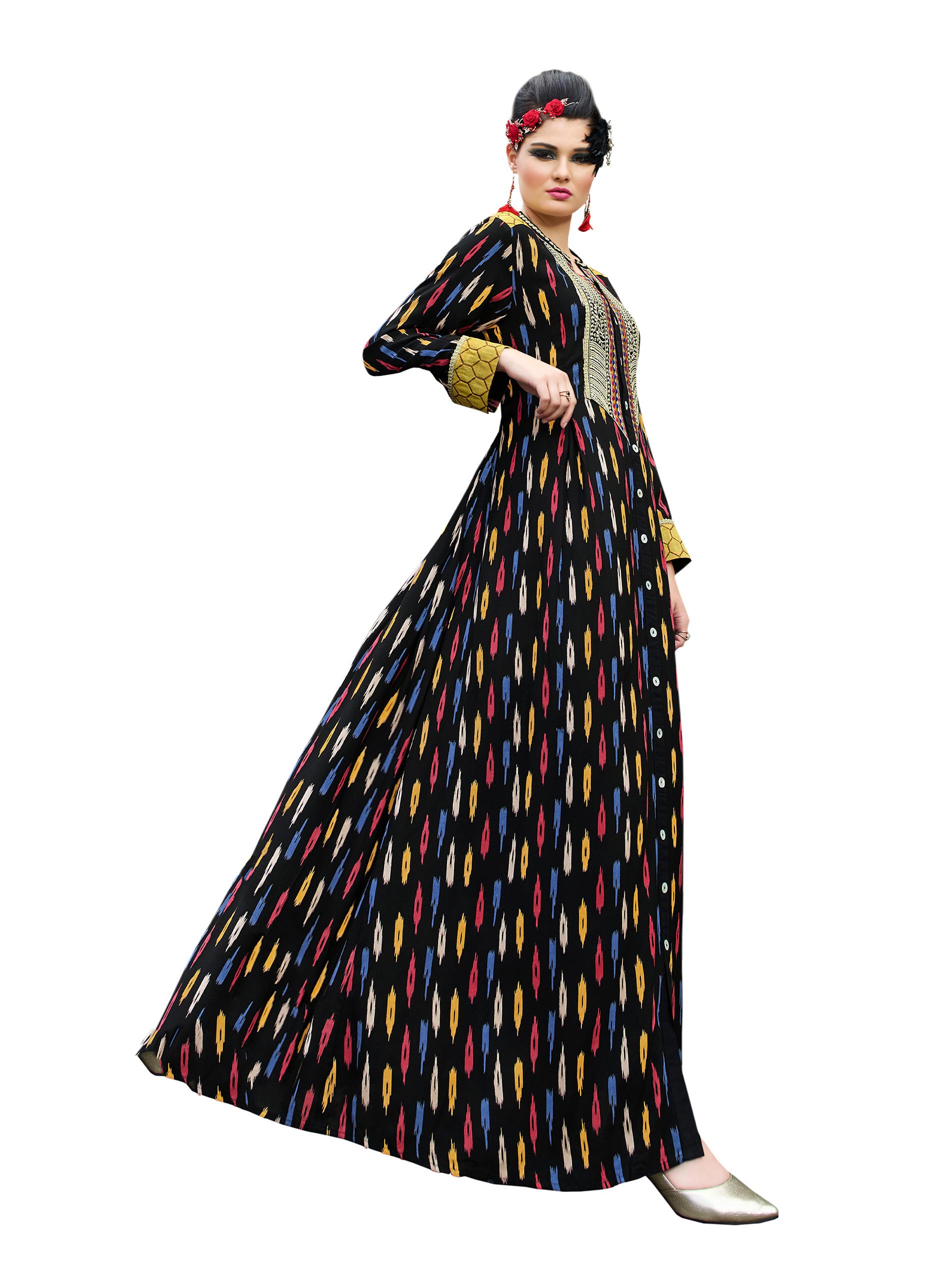 The vibrant multi-coloured patterns of ikat print adorn your new summer collection jalabiyas. Tapering off around the neck is the sheer elegance of a key hole cut highlighting your slender shape. The sparkling softness of rayon drapes you in full length, full sleeves and flared hemline. Casual never looked so good!