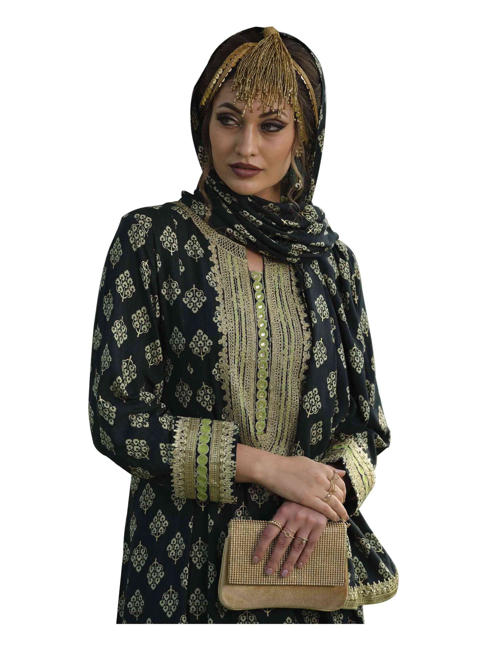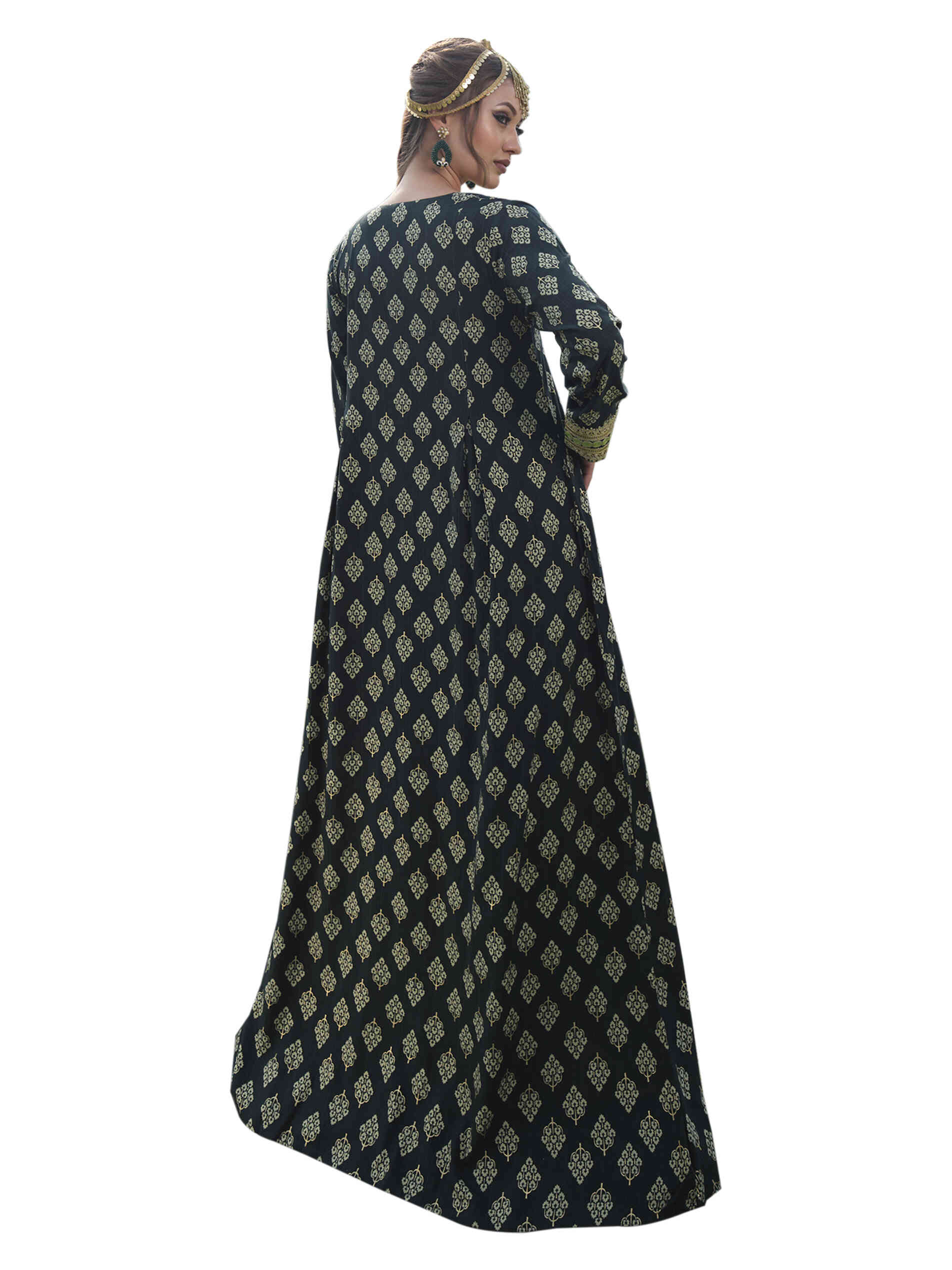 Ikat print is done with a technique called resist dyeing. However, it makes this dark green daraat look absolutely irresistible on a viscose fabric. styled in a notch neck the daraat wears a look of utter grace. The full sleeves and A line cut add to its glam.