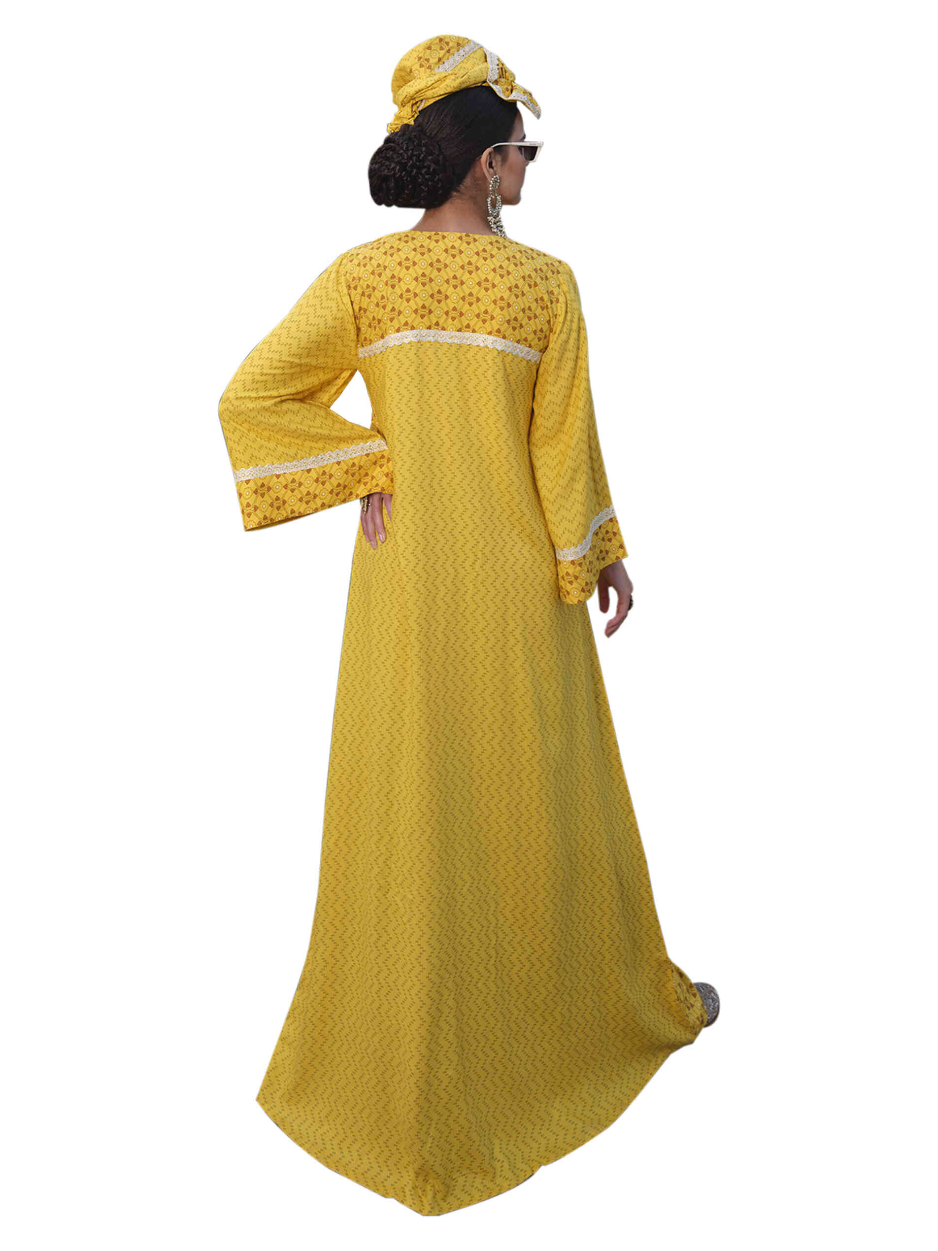 An ikat print in yellow on a full length cotton jalabiya is compelling. The daraat is designed in a sensational A line with full sleeves and round neck. The casual dress will impose an aura of brilliance as you shine this summer in a happy yellow daraat.