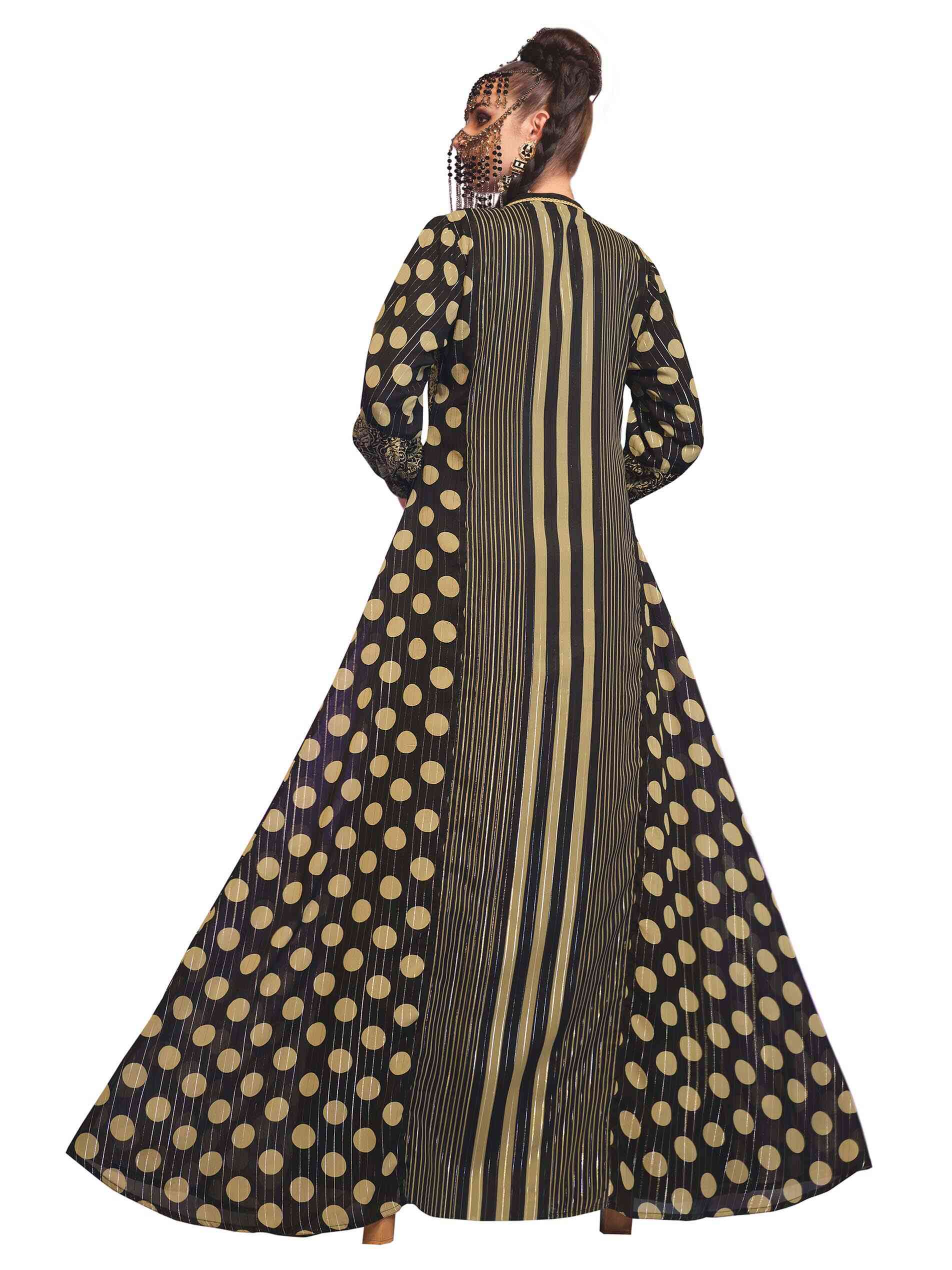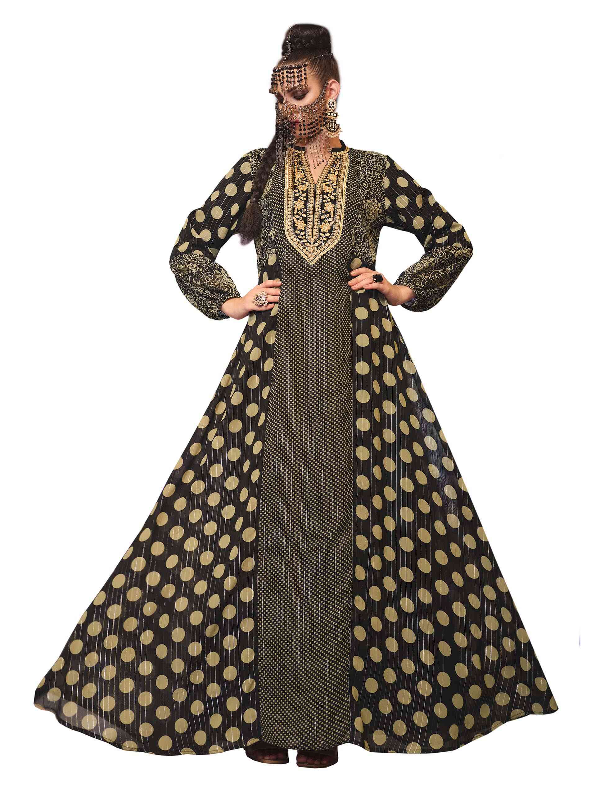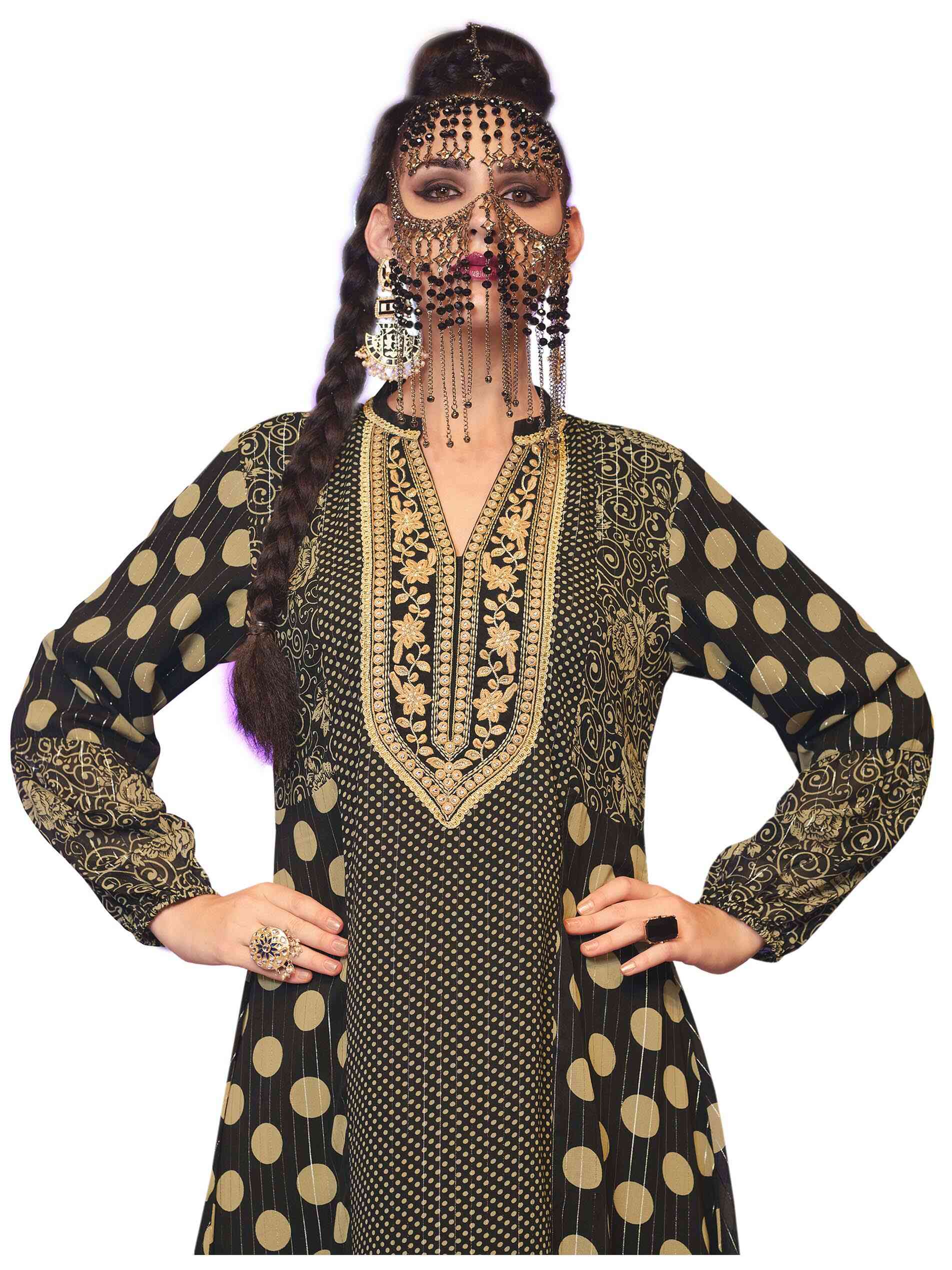 Black and beige always make a show stopper. This full length jalabiya is a sure stunner with polka dots in beige on a beautiful black polyester. The full sleeves end in floral grace and the V neck is embelished in awe inspiring embroidery to give the daraat an ornamental look. The flare cut adds to its styling.