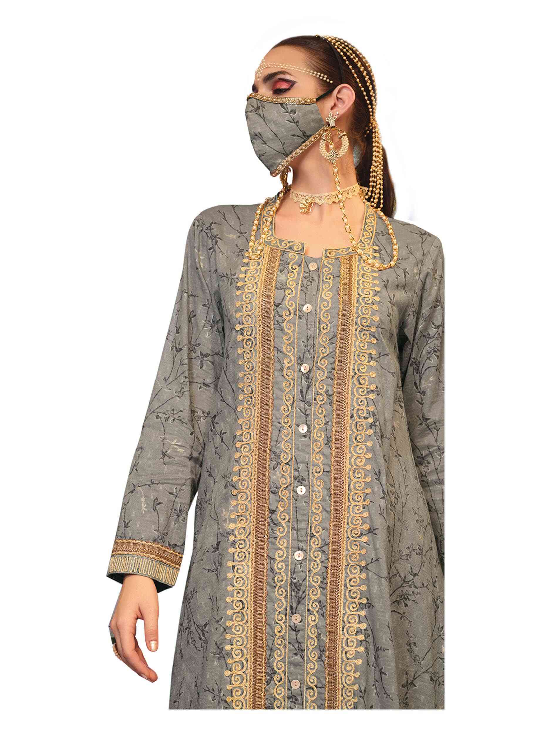 Grey with a touch of gold is just WOW. Embrace this full length grey cotton jalabiya in self print that's petterned to prettiness in a notch neck from where a streak of gold laces emanate on the front open daraat to add its poise. The A line looks perfect for the gorgeous grey and the full sleeves end in golden grace.
