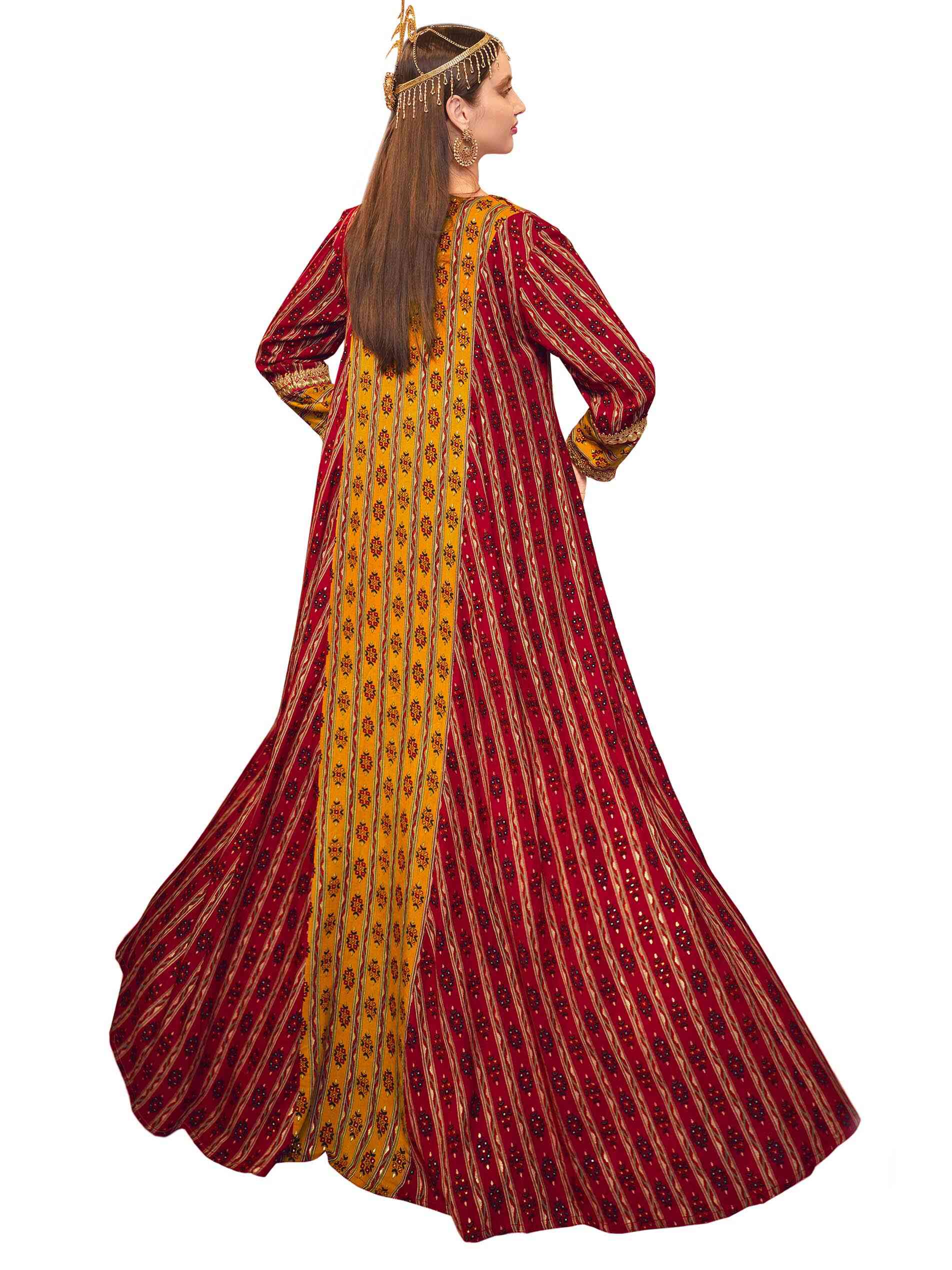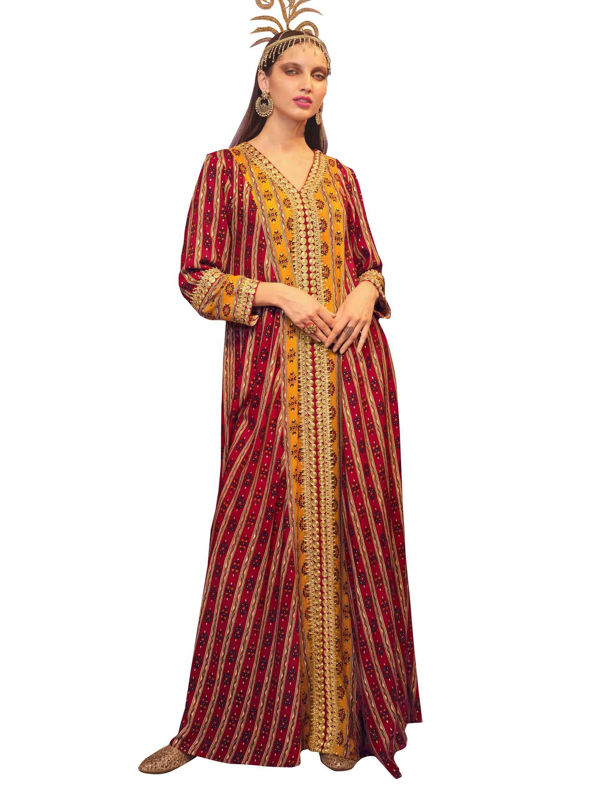 Red, the colour of love. Express your warm side in a full length red viscose jalabiya that is styled in an A line to enhance the dainty print embedded in-between printed stripes that hint orange. The V neck projects into a lovely yellow that goes all the way down emebellished with the same dainty print creating a fabulous combination of yellow amidst a sea of red. Tailored in full sleeves with the yellow printed band fringed on both sides with golden lacing to complement the golden lacing that runs round the neck all the way down the centre yellow panel. Certainly this piece evokes festivity as you revel in its decorative aura.