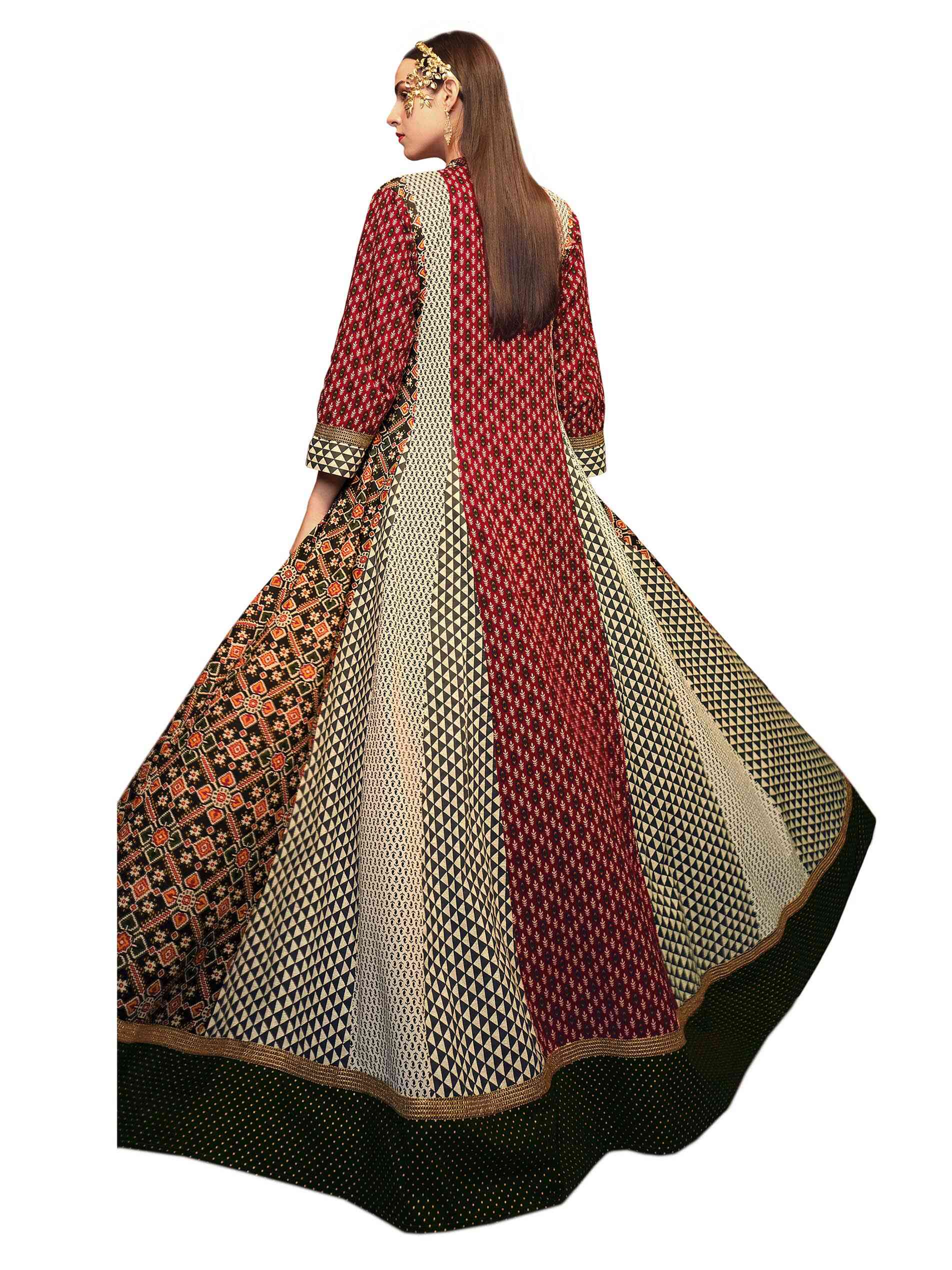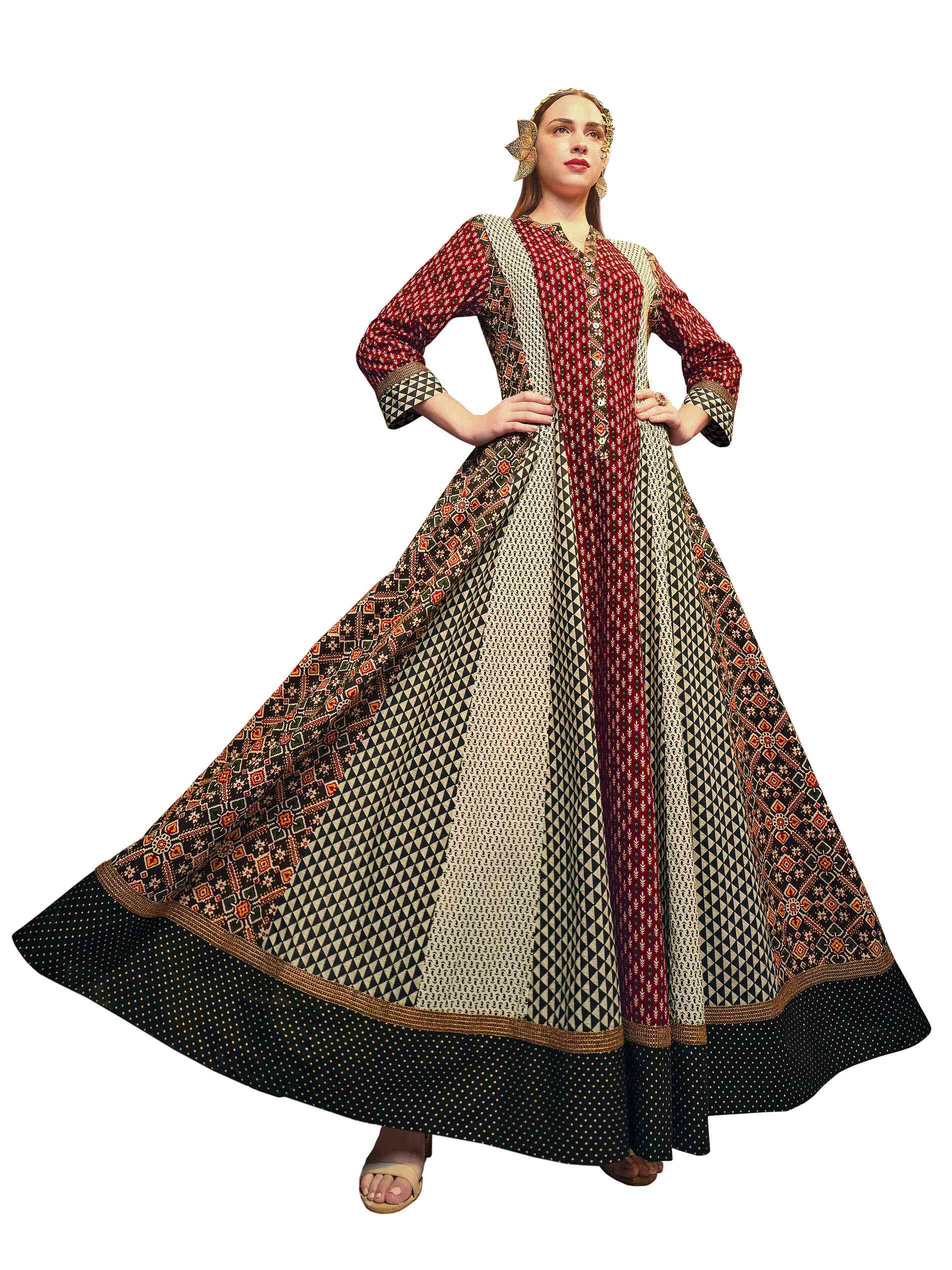 A combination of deep red, black and off white to create a full lenth jalabiya with block print on cotton is a fabulous idea. The V neck extends into a thin button panel highlighted with black printed fabric that is used at the sides to complete the symmetry of the daraat. The full sleeves end in a band of offwhite and black triangles to add a new dimension to the entire printed dress. A flare cut magnifies its elegance. Your wardrobe awaits a unique style statement.