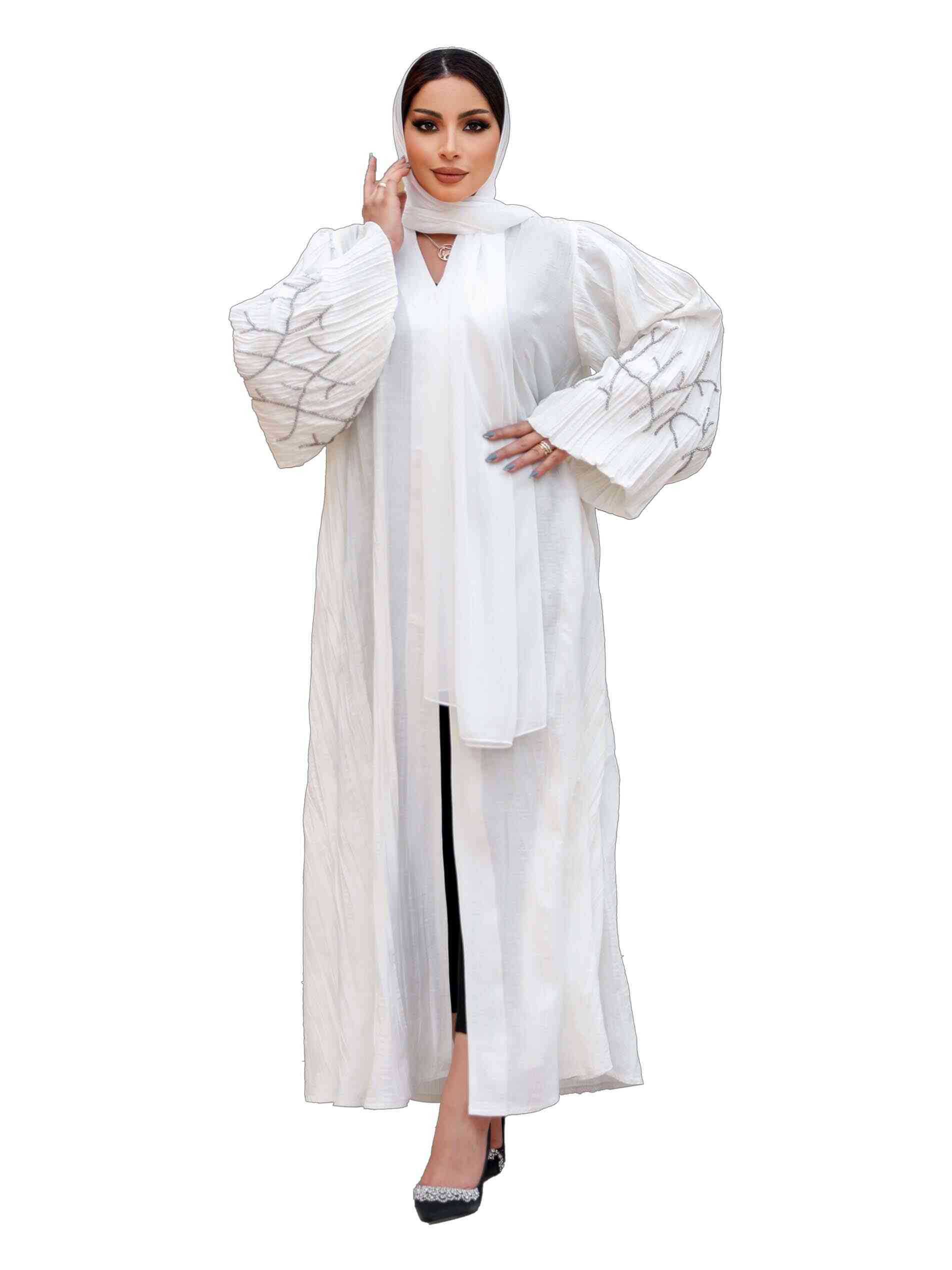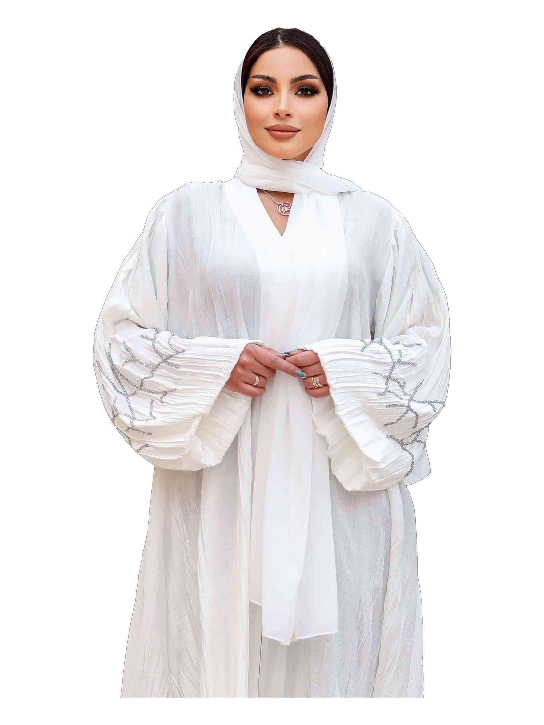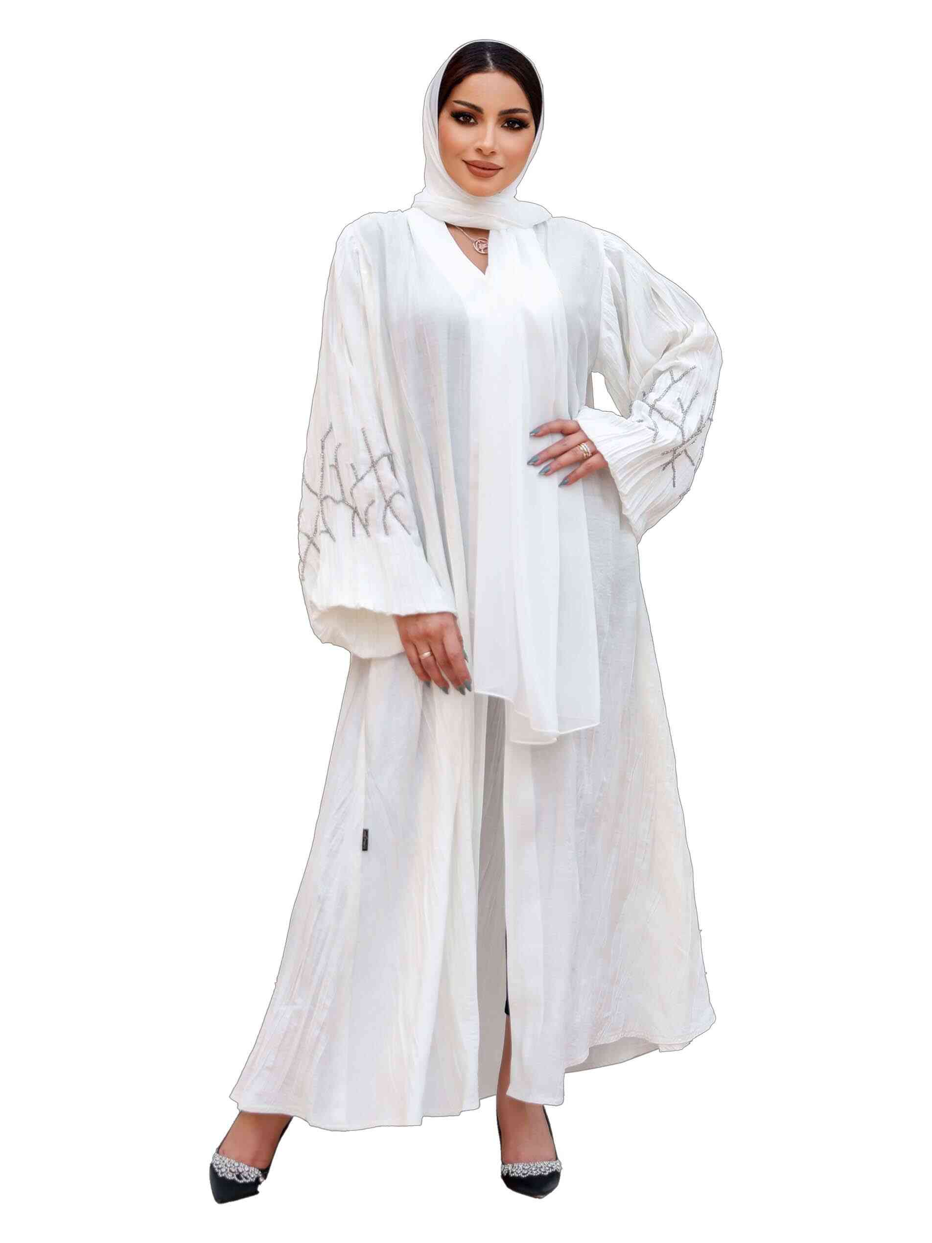 A white linen is ultimate luxury. Flaunt your cosmic charm in a plain linen full length abaya to exude a sense of peace and positivity. The casual abaya is patterned in full sleeves with dainty silver beads to highlight the dress. It has a V neck and jacket styling to lend a very charismatic appearence.