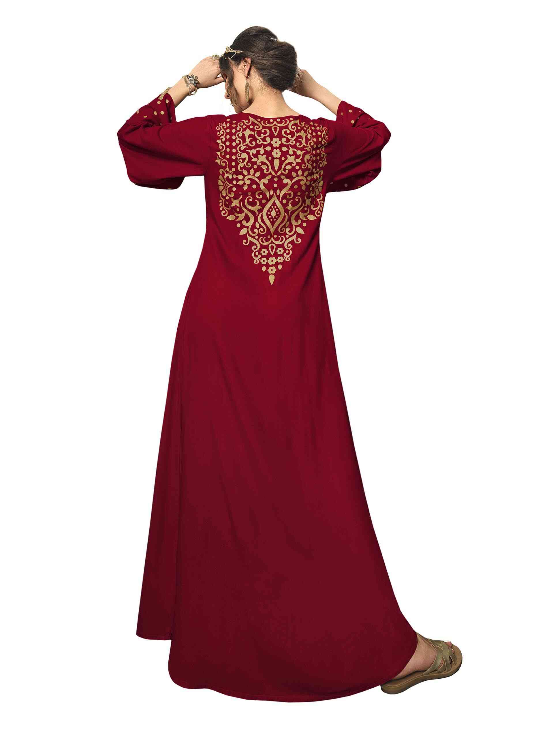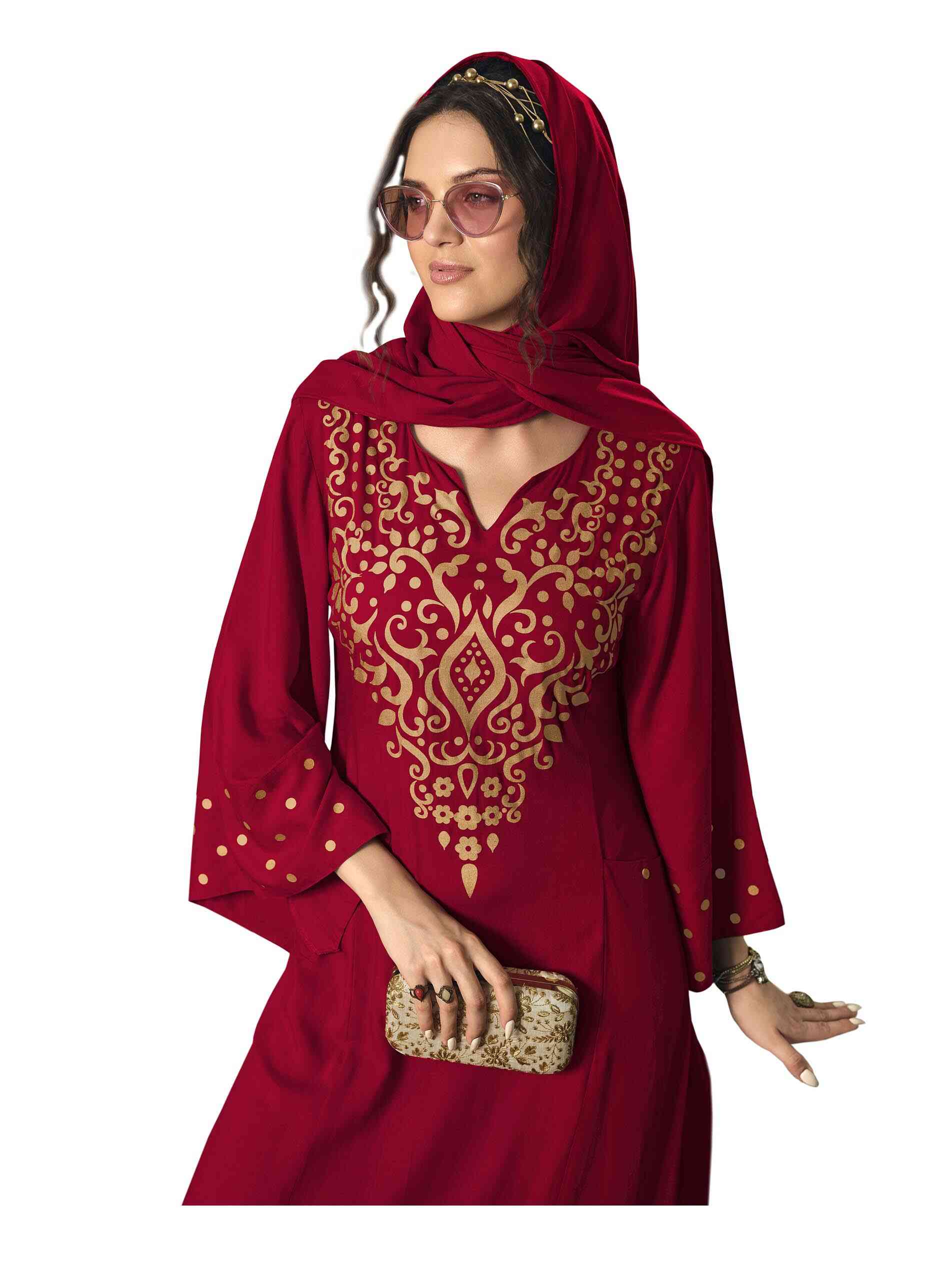 Red is undoubtedly bold and strikingly beautiful. Upgrade your wardrobe to a style that's mystic yet definitive in its charm and confidence. A brilliantly designed red full length jalabiya with subtle and understated gold print on the chest, back and sleeve borders. The daraat is styled in A line, round neck and full sleeves. The fabric is a flowy rayon foil. Dare to be red and lit up the surroundings.