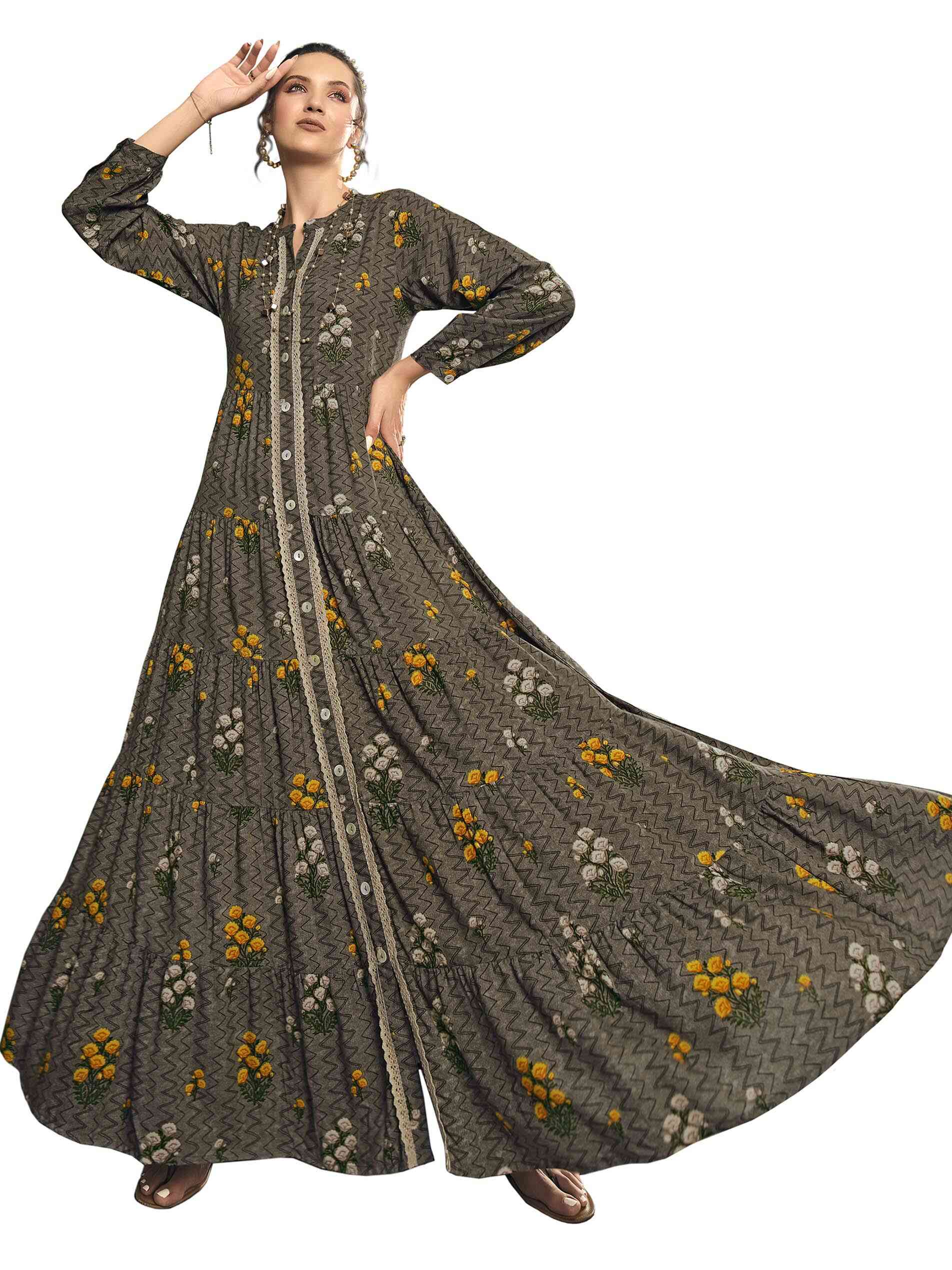 A full length of brown rayon with zigzag prints to create a mystery about you. Pretty white and yellow flowers to emit joyous vibes. This summer daraat in full sleeves is super grace with a flared hemline and V neckline with dainty lacing and buttons to create a chic and smart look.