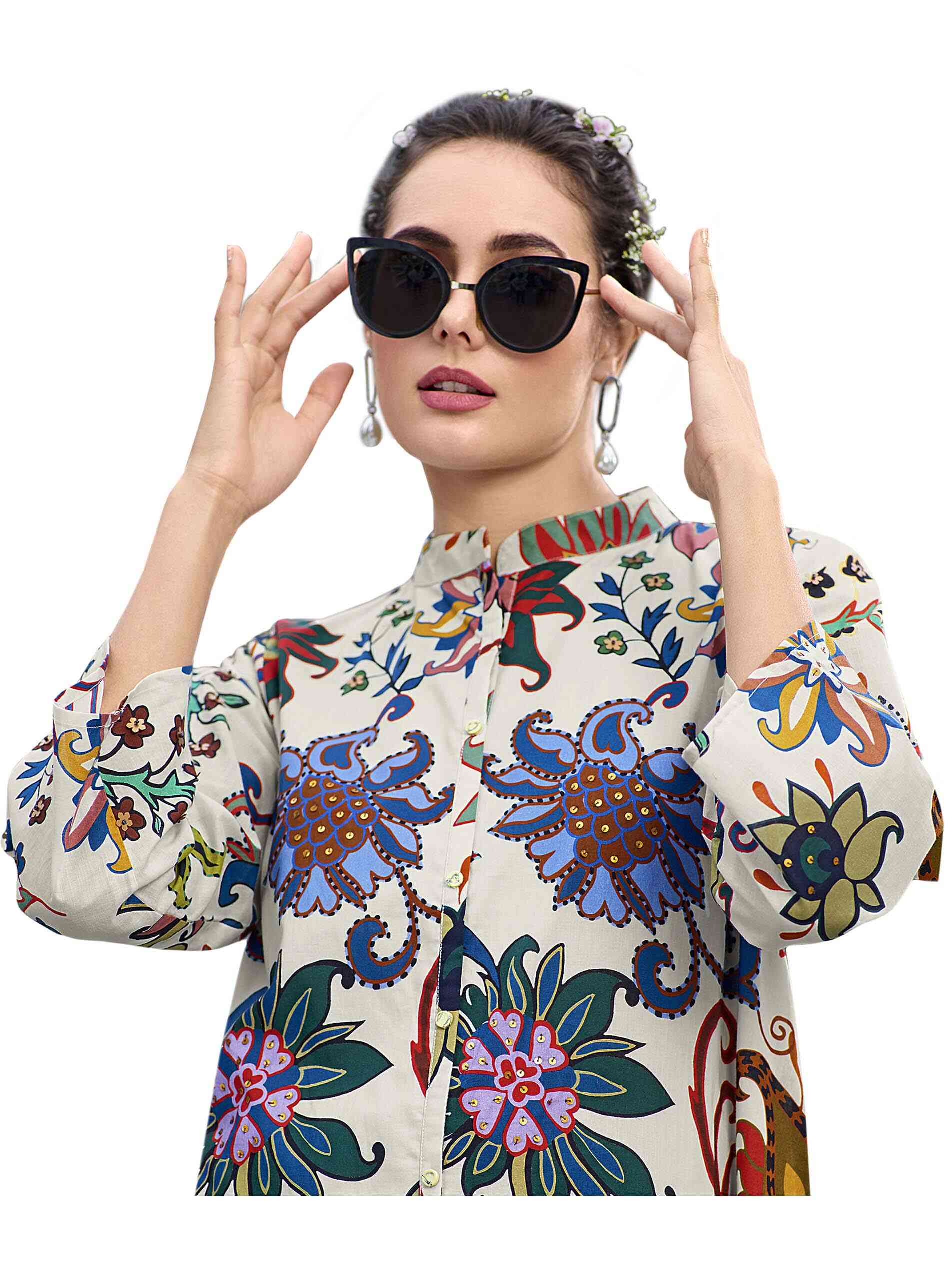 A cream base enhances every colour and gives it a fresh mood. Parade in your different shades as you adorn a cream full length jalabiya bright and colourful in multicoloured floral print. The collared neck gives it a smart touch and the 3/4th sleeves add to its A-line styling. Bask in colours of joy.