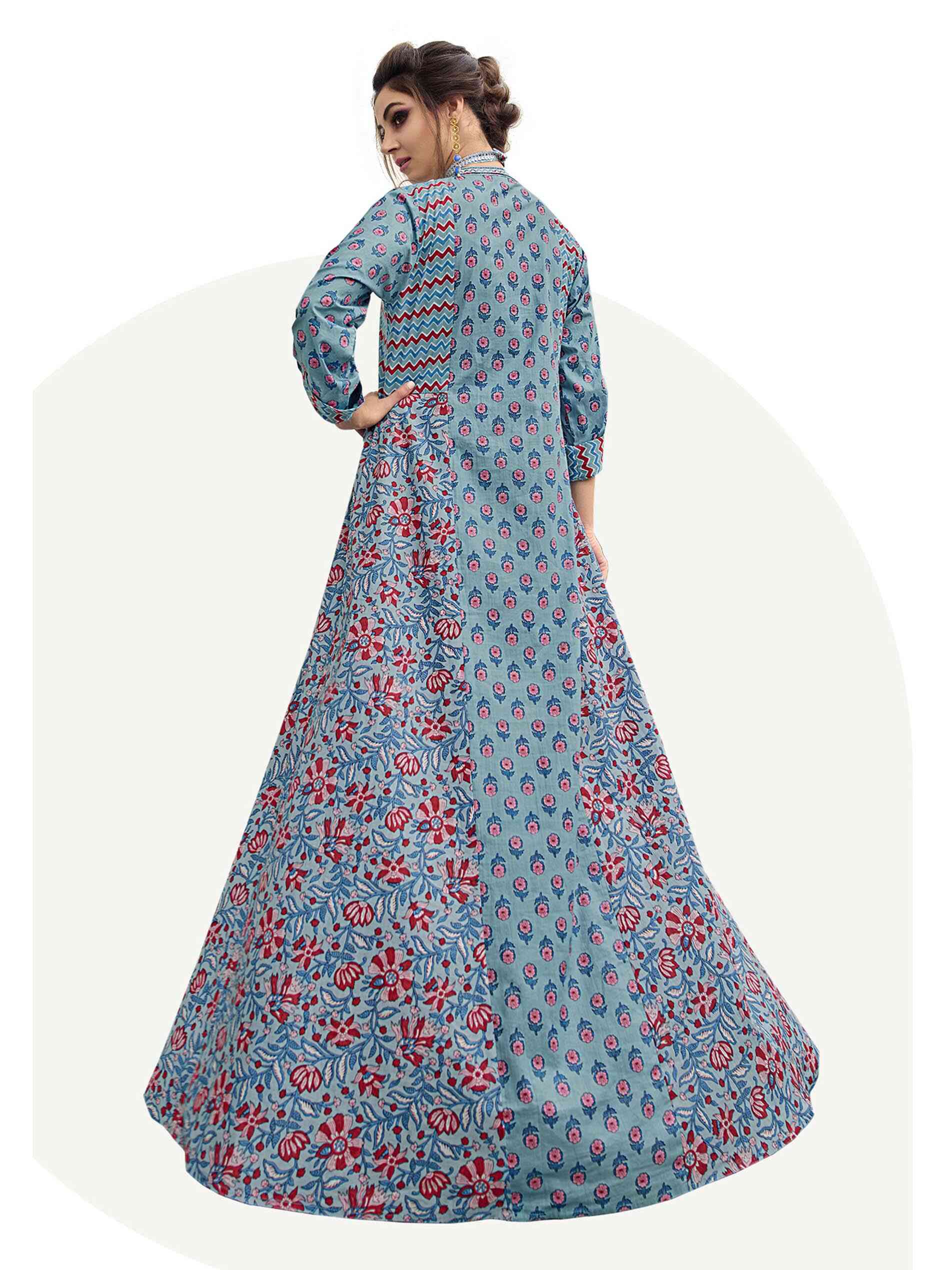 Blue is the colour of the season. Pair it with red and it makes the conventional yet most enchanting combination. So party to your beat in this full length cotton cambric jalabiya made to appeal to those with great taste. The print is floral and geometric to create a symphony of moods that alternate from dawn to dusk, creating a mesmerising hue of eternal and untouched beauty. The V neck sports rich red potli buttons and embroidery in floral and geometric styles complimenting the dual print. The A-line is set just right for the full sleeves and full length.