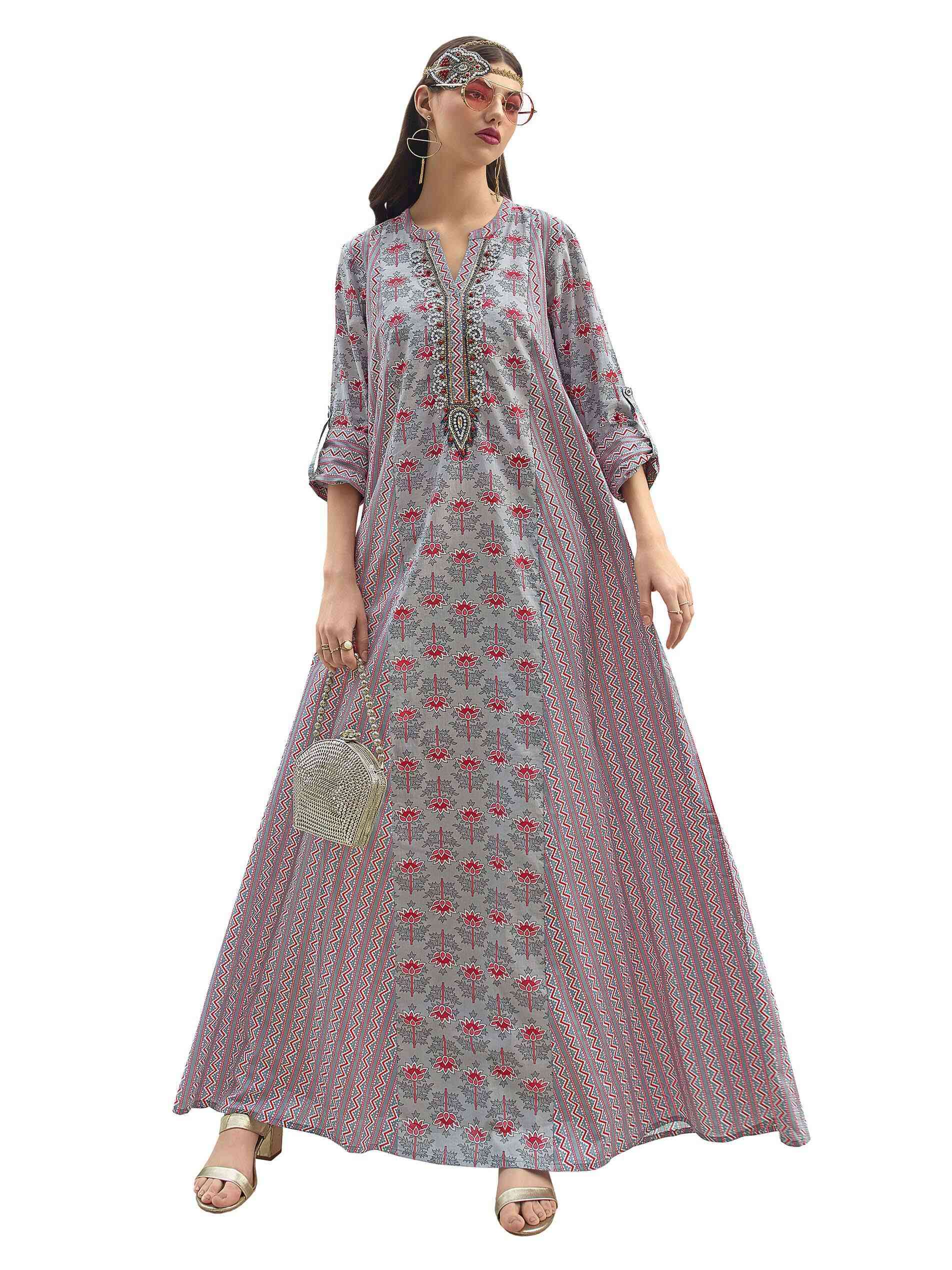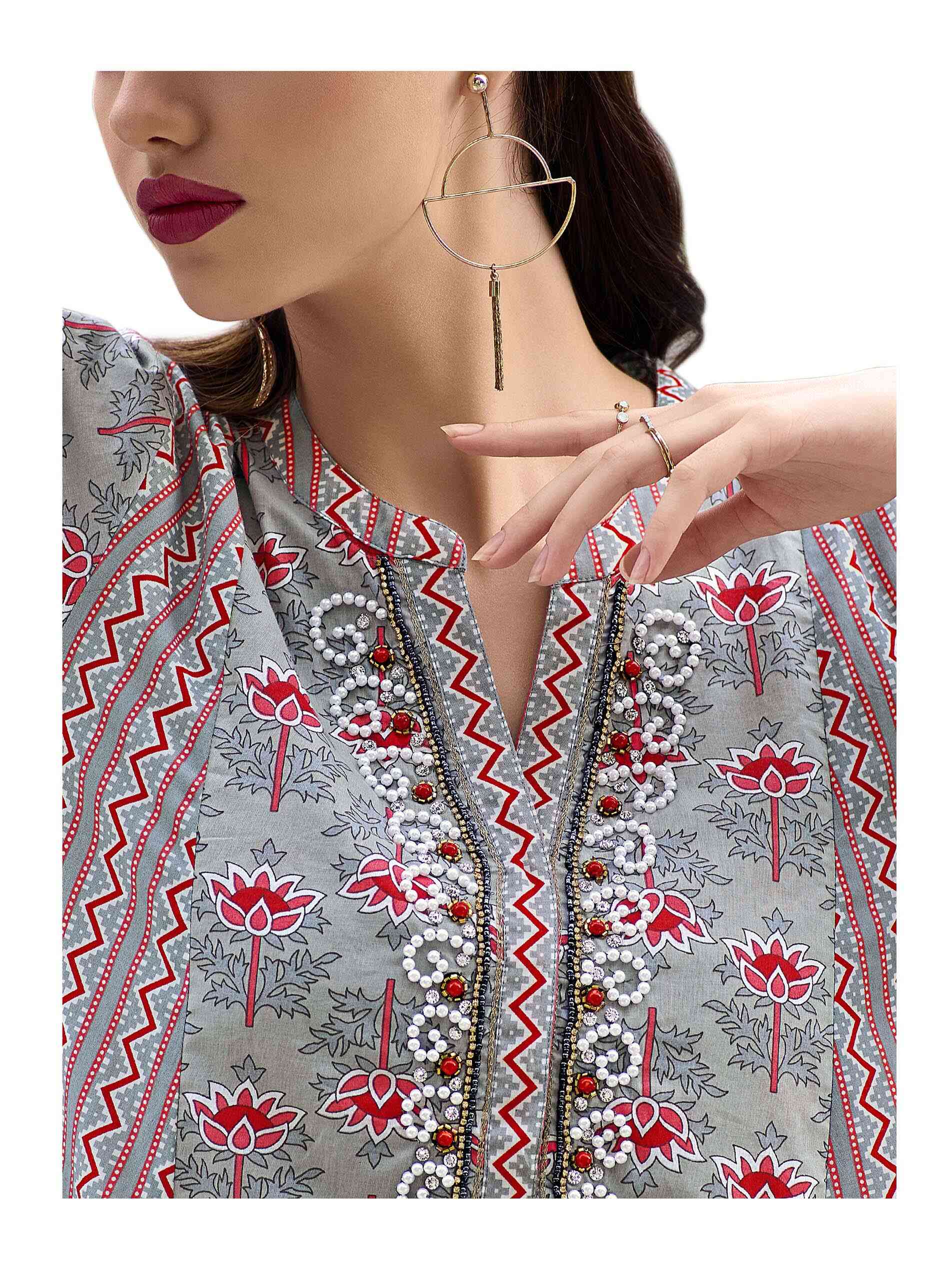 A zig-zag print inspires adventure and the floral blossom a romantic tale. Immerse in sensational feeling as you wear a grey full length jalabiya to spark the party with its dash of red. The V neck is beautified with excellent bead work and the 3/4th sleeves add panache to the daraat. The A-line is just right for a dress so finely made in cotton cambric.