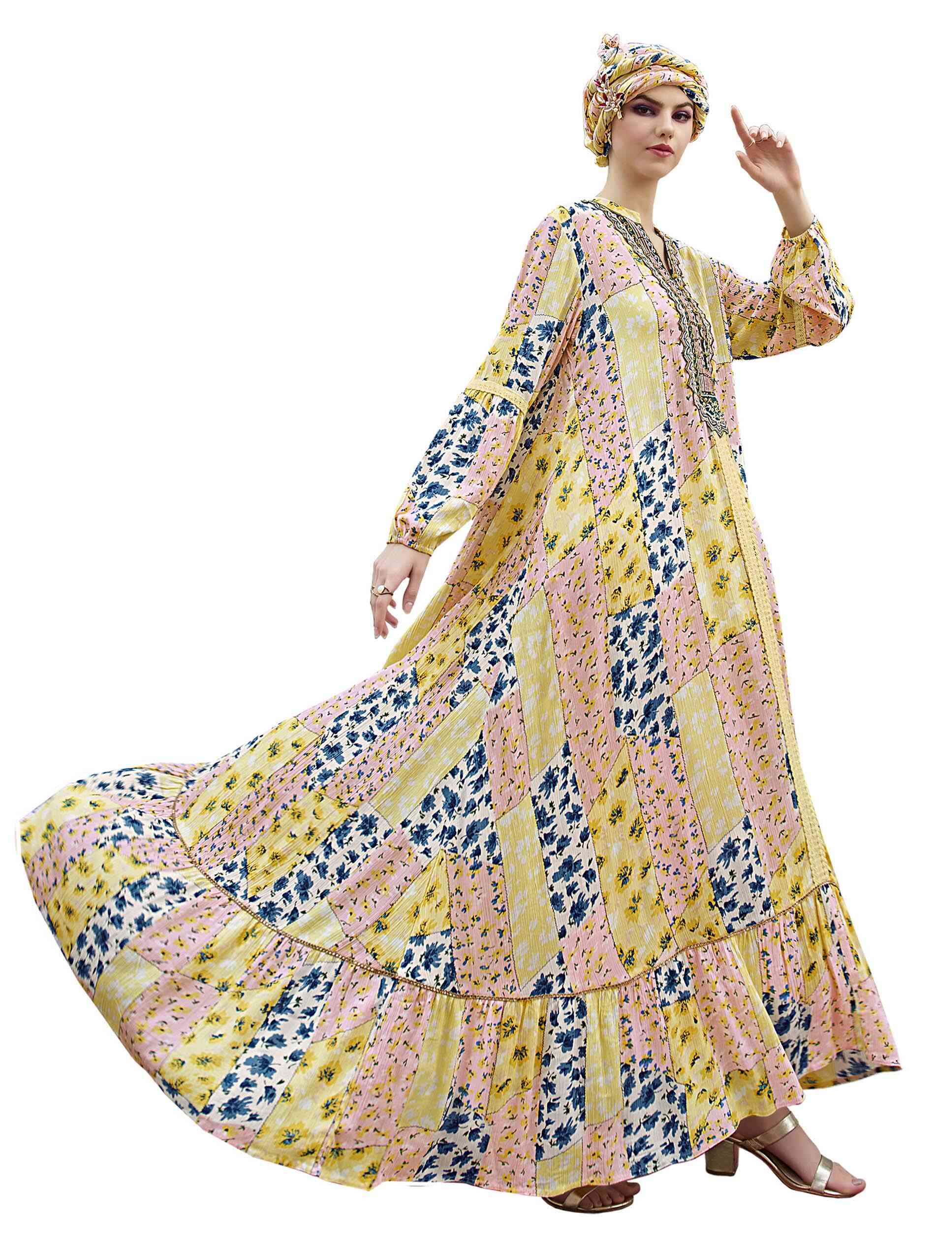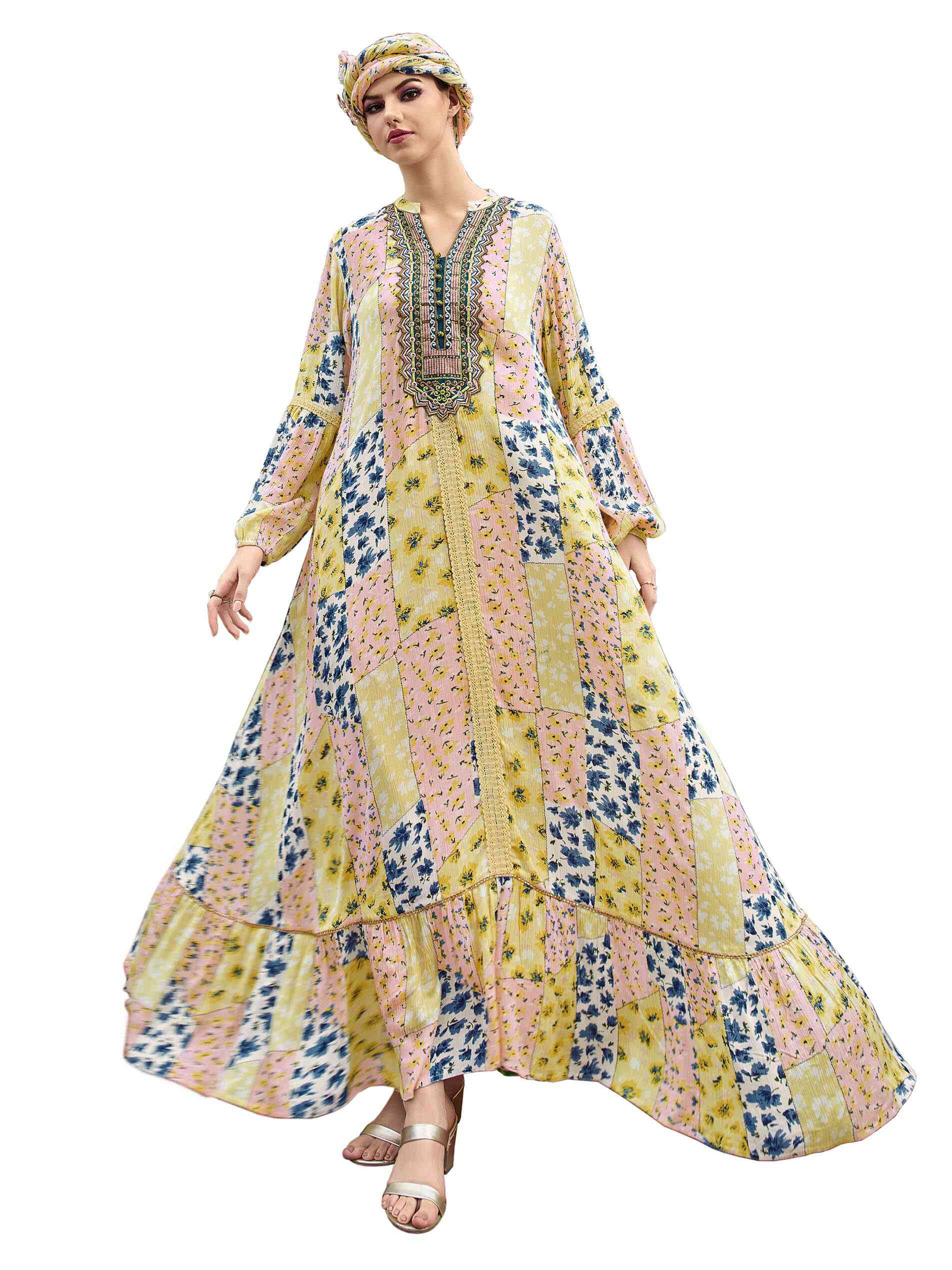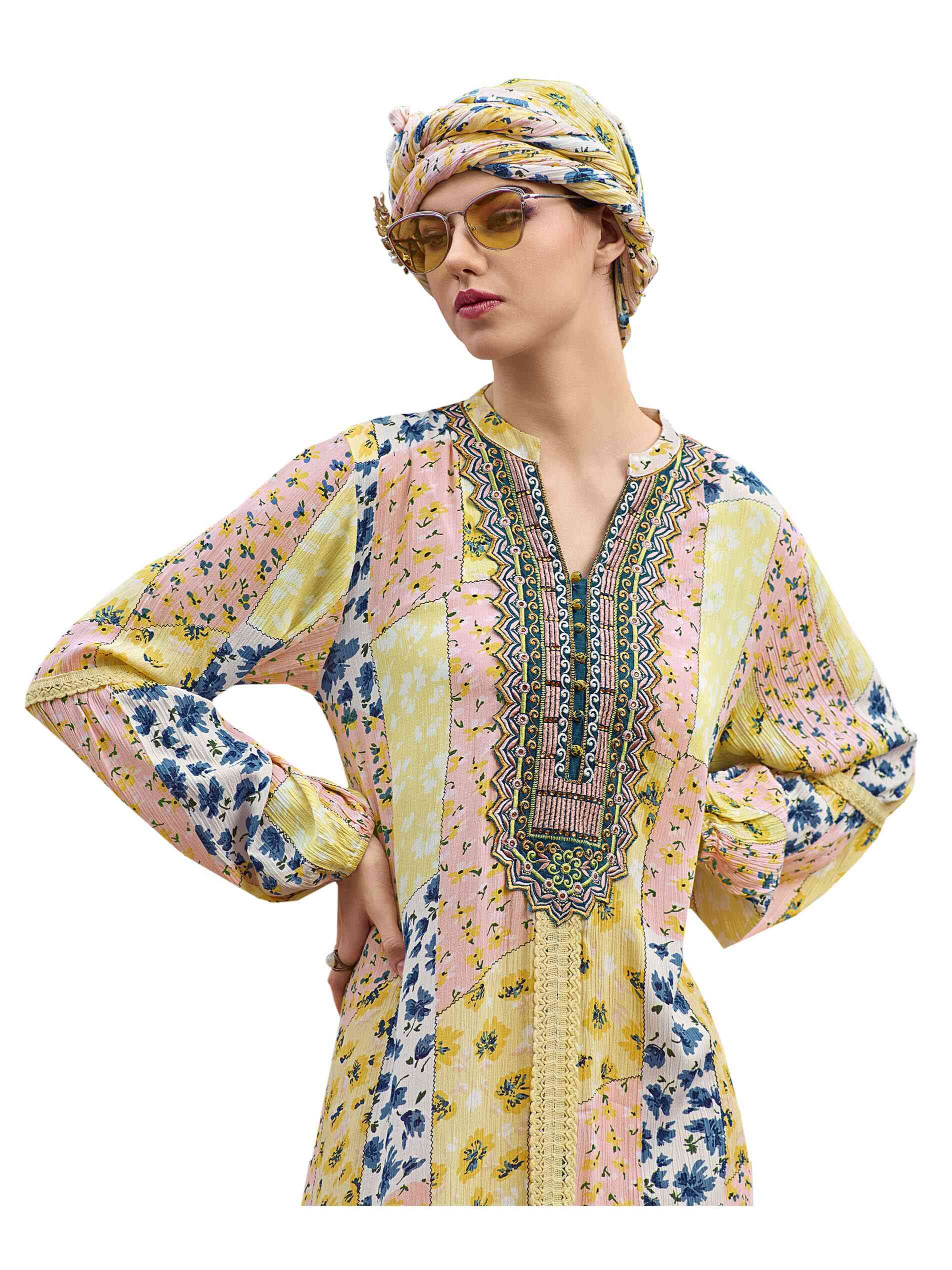 Wrap yourself in a rayon crepe for this summer party. The yellow block pattern full length jalabiya is a collage of blue, yellow and pink creating a soothing effect. The flare hemline ends in a frill highlighted with dainty lacing. The V neck is front open with potli buttons and pretty embroidery along with a lace that goes all the way down the centre. The lovely full sleeves have lacing at the elbow and gather up at the wrist in a soft elastic to spur up the elegance. Wear sheer grace!