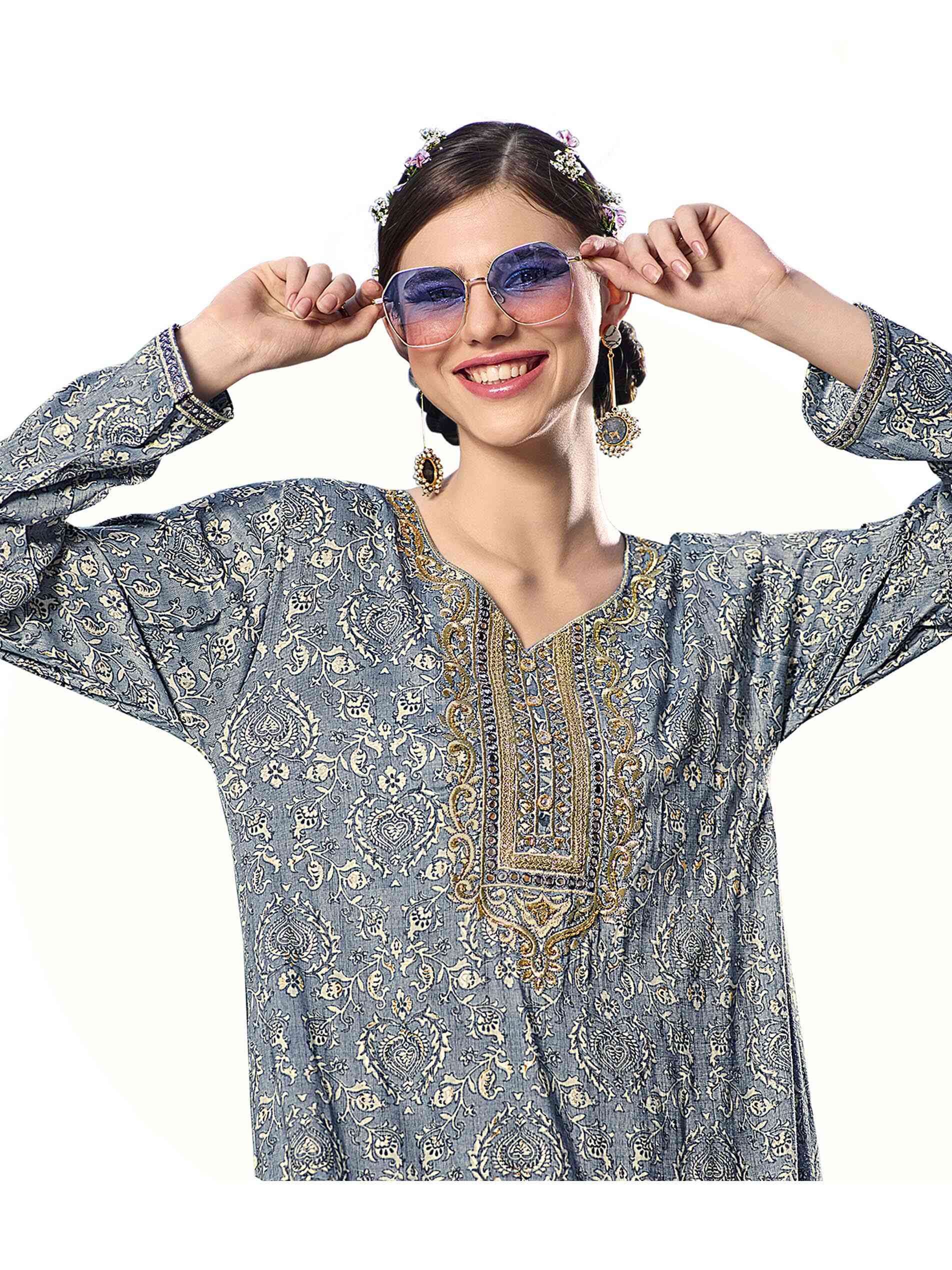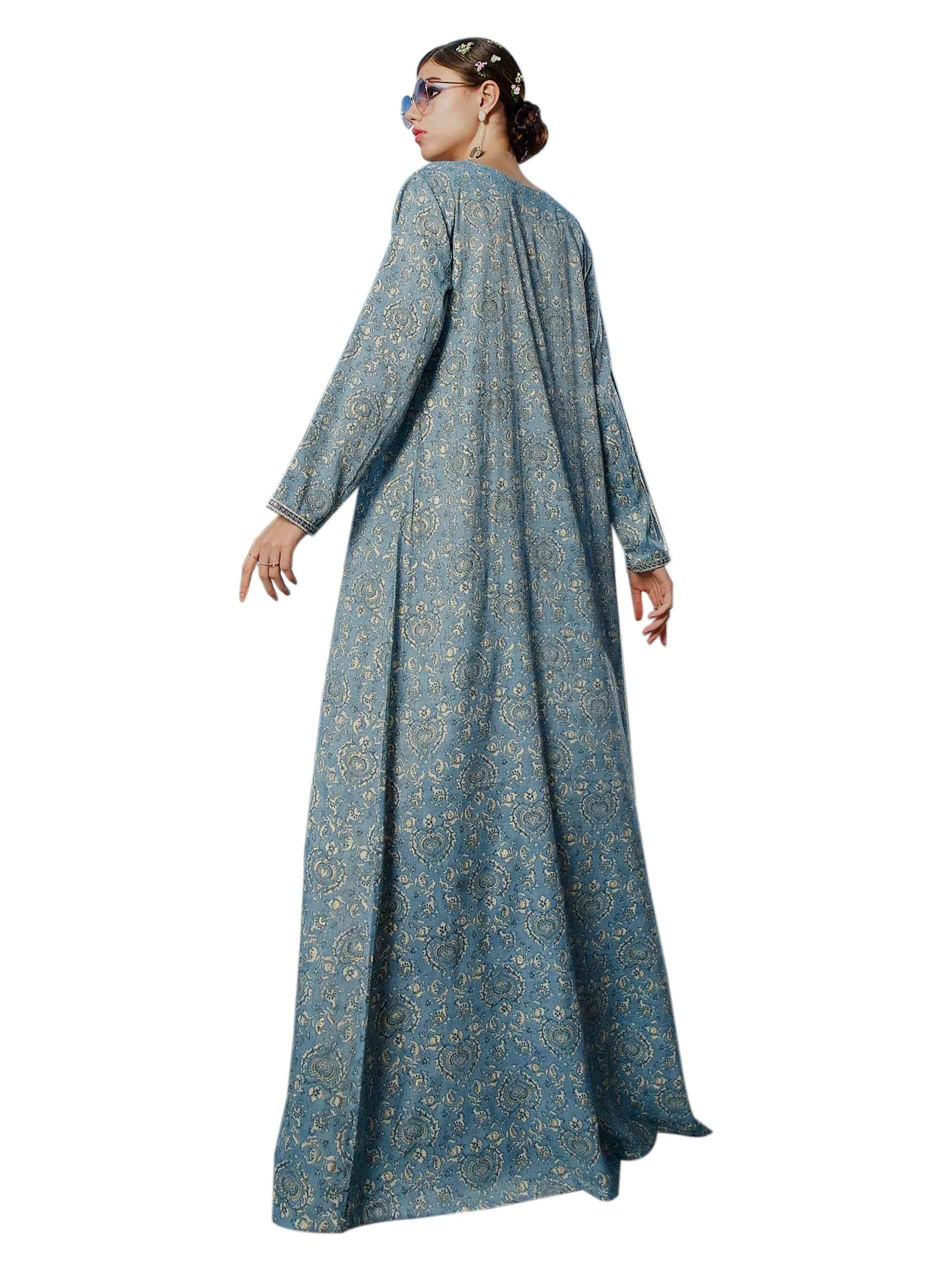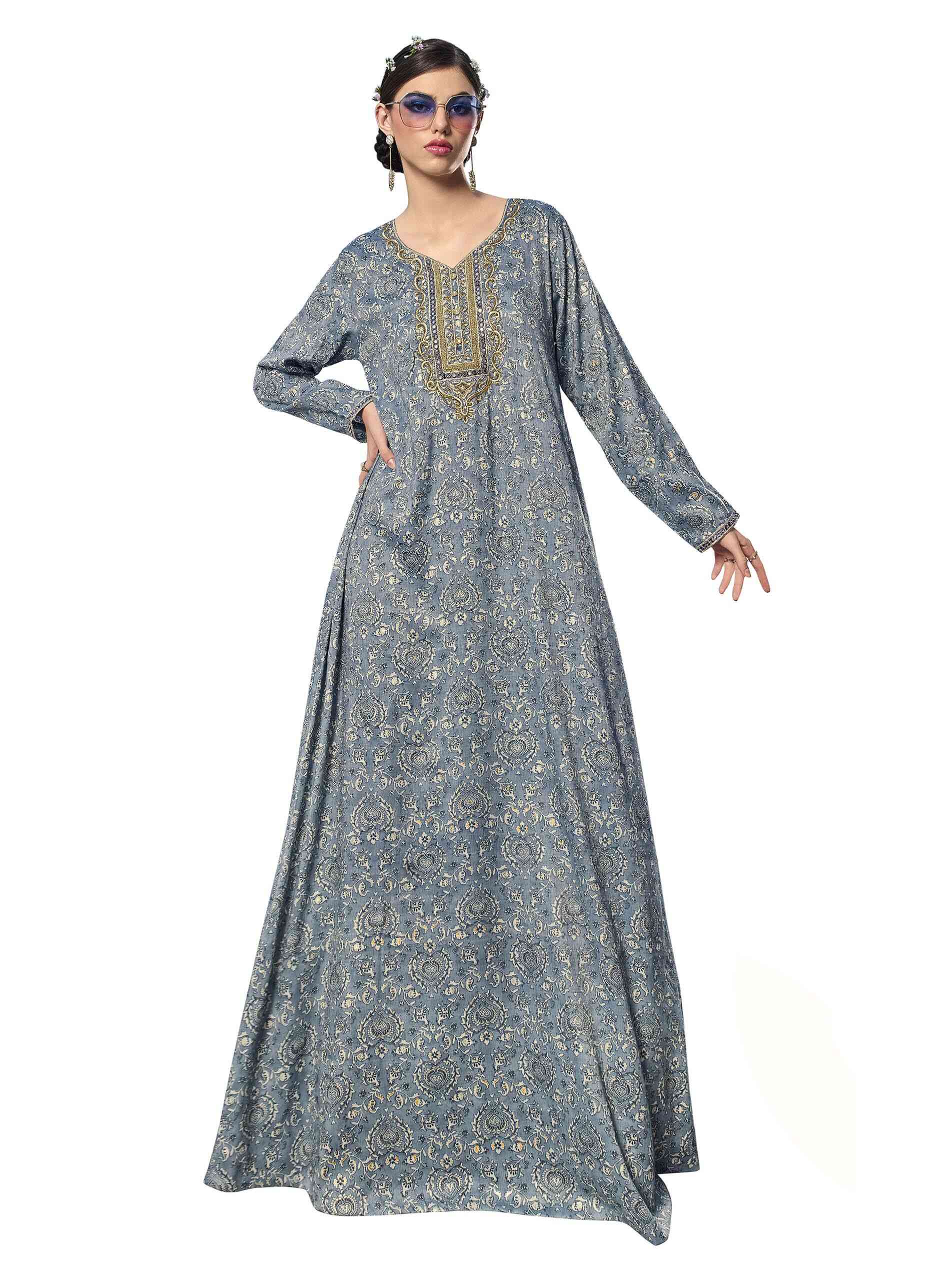 Grey represents strength, sophistication and tactfulness. Let them guess your inner beauty as you flaunt your flawless persona in a grey floral full length jalabiya. The V neck is highlighted in dull gold embroidery to symbolise your hidden spark and the full sleeves add to its feminine styling completed with an A-line. Be casual, be bold, be a shade that keeps them guessing.
