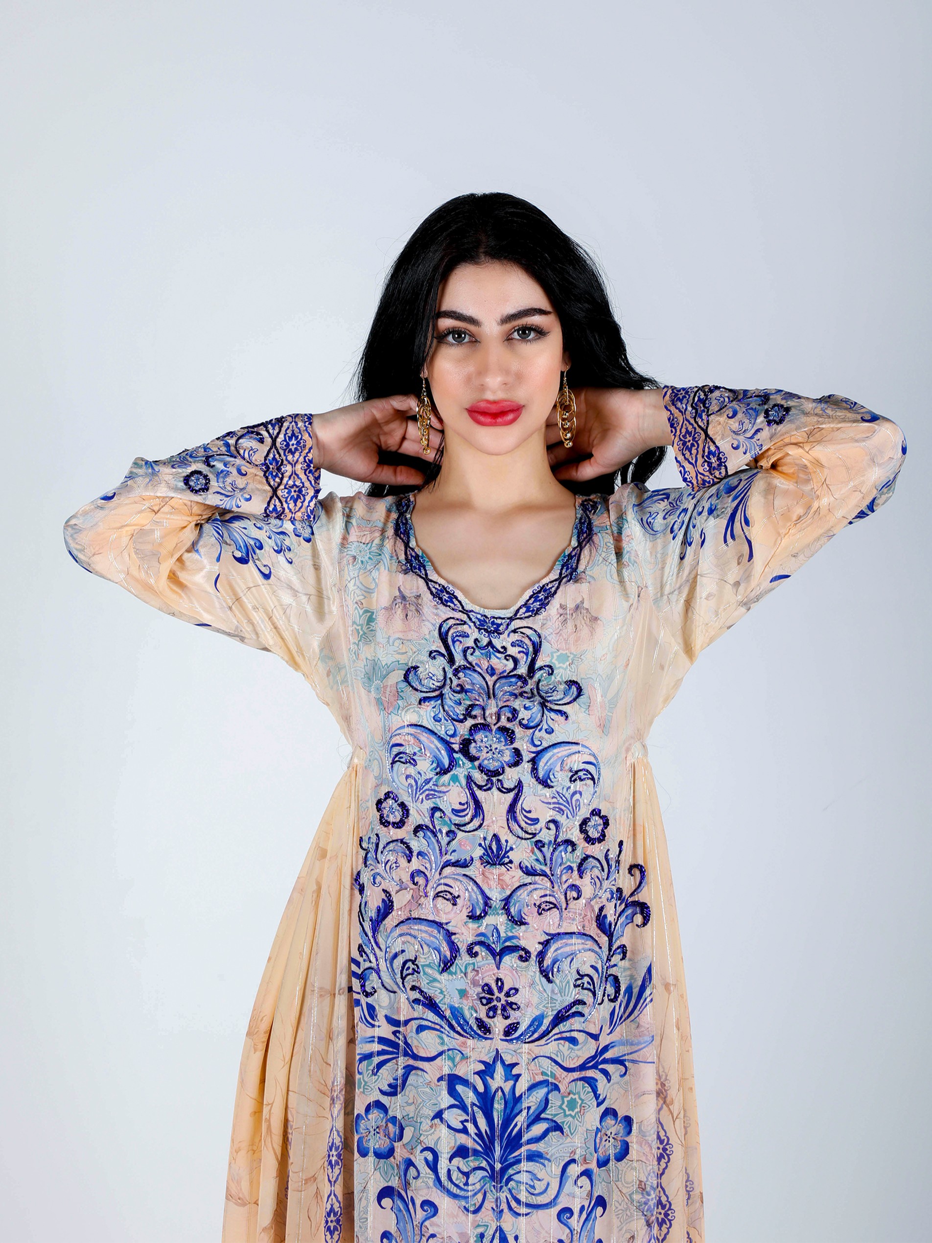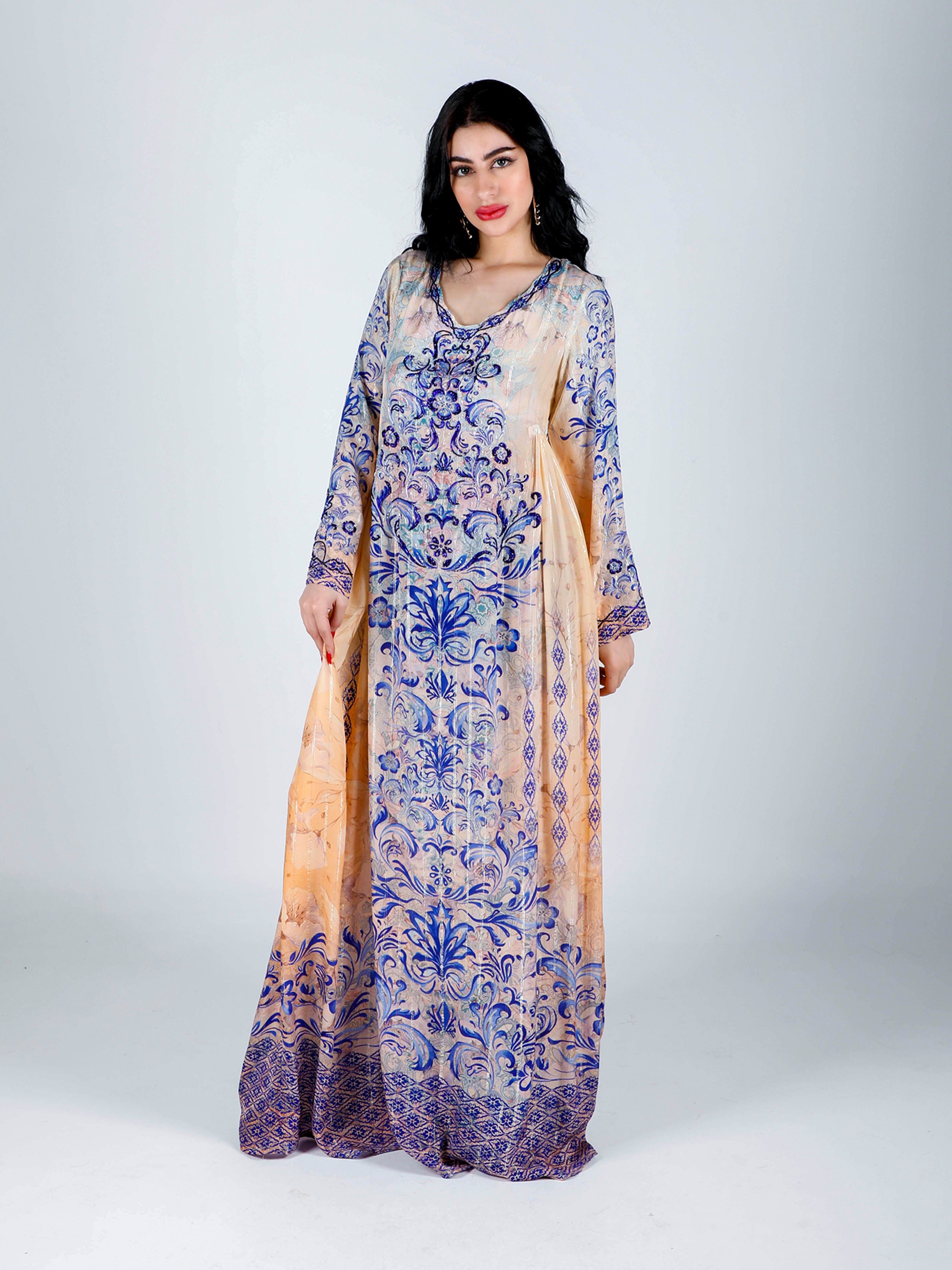 Soft viscose crepe digital printeded jalabiya with lurex and beautiful beads hand work design