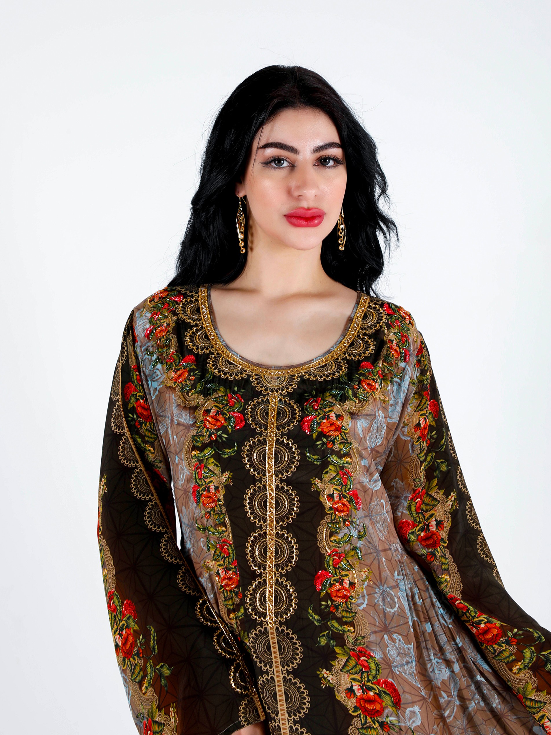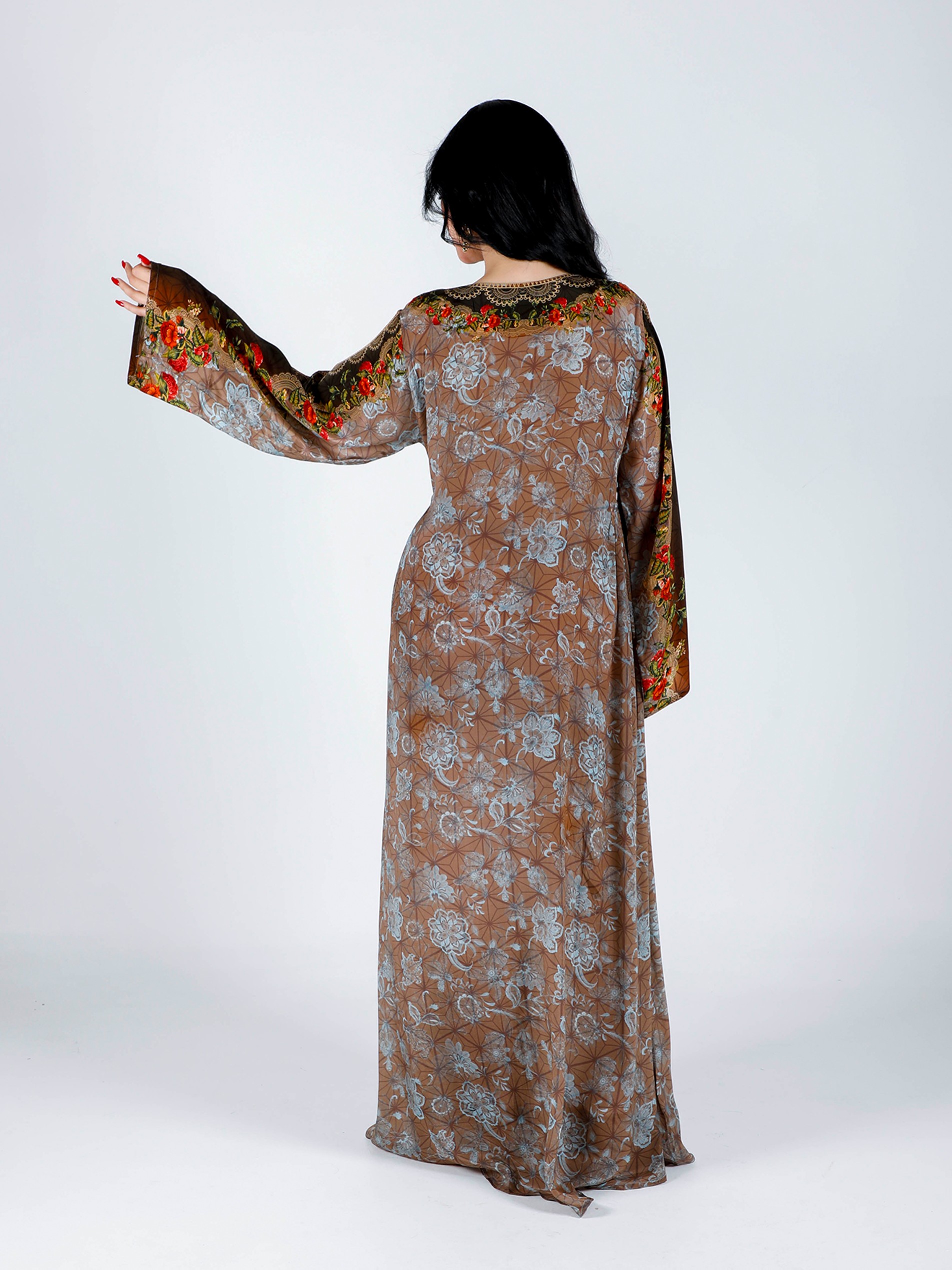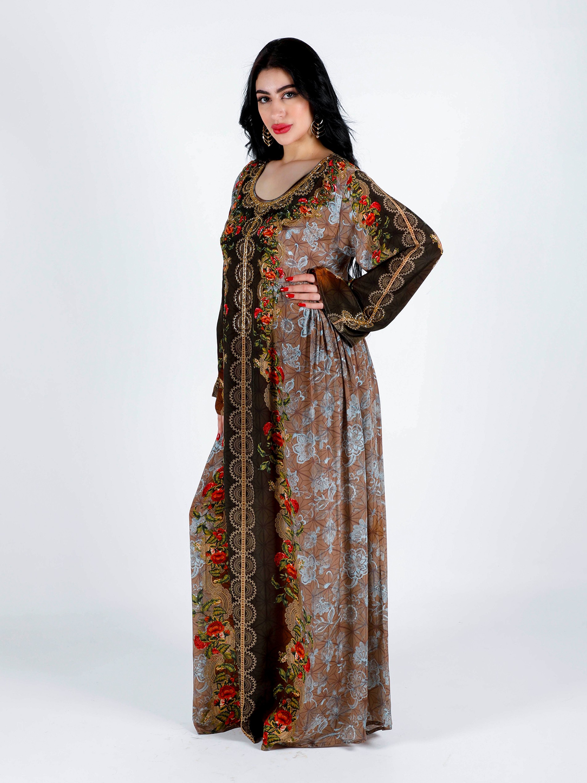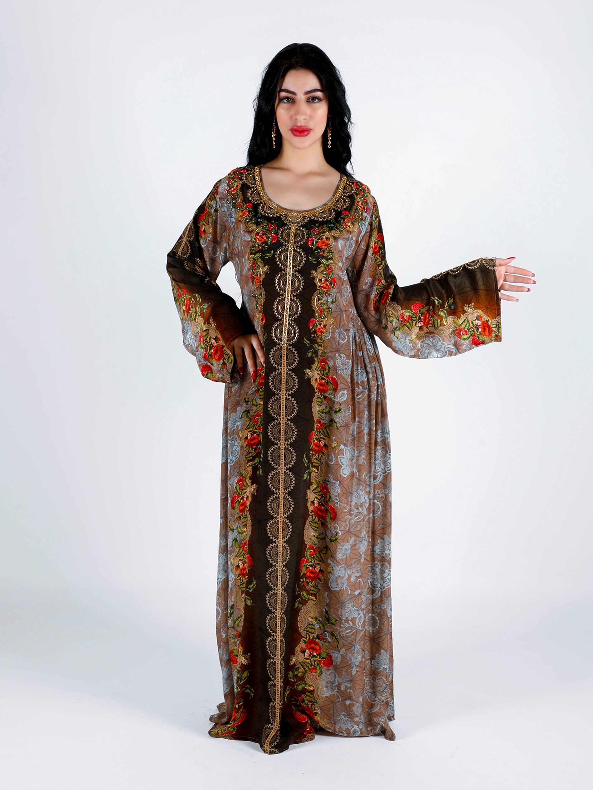 Soft viscose crepe digital printed jalabiya with elegant beads hand work design
