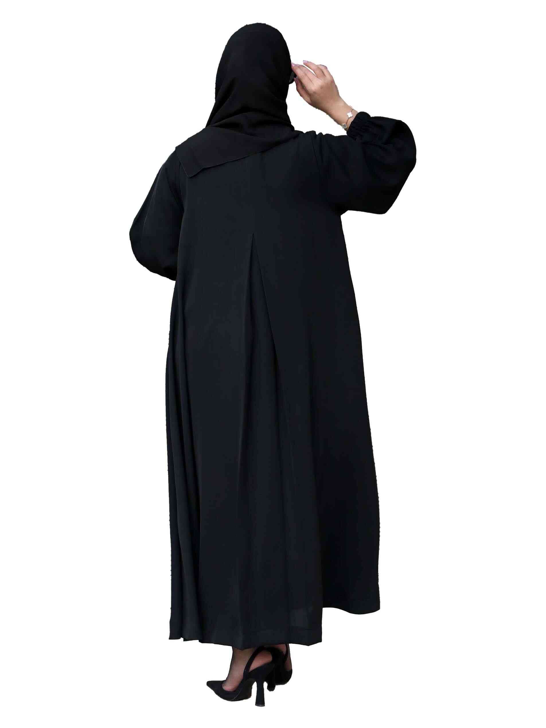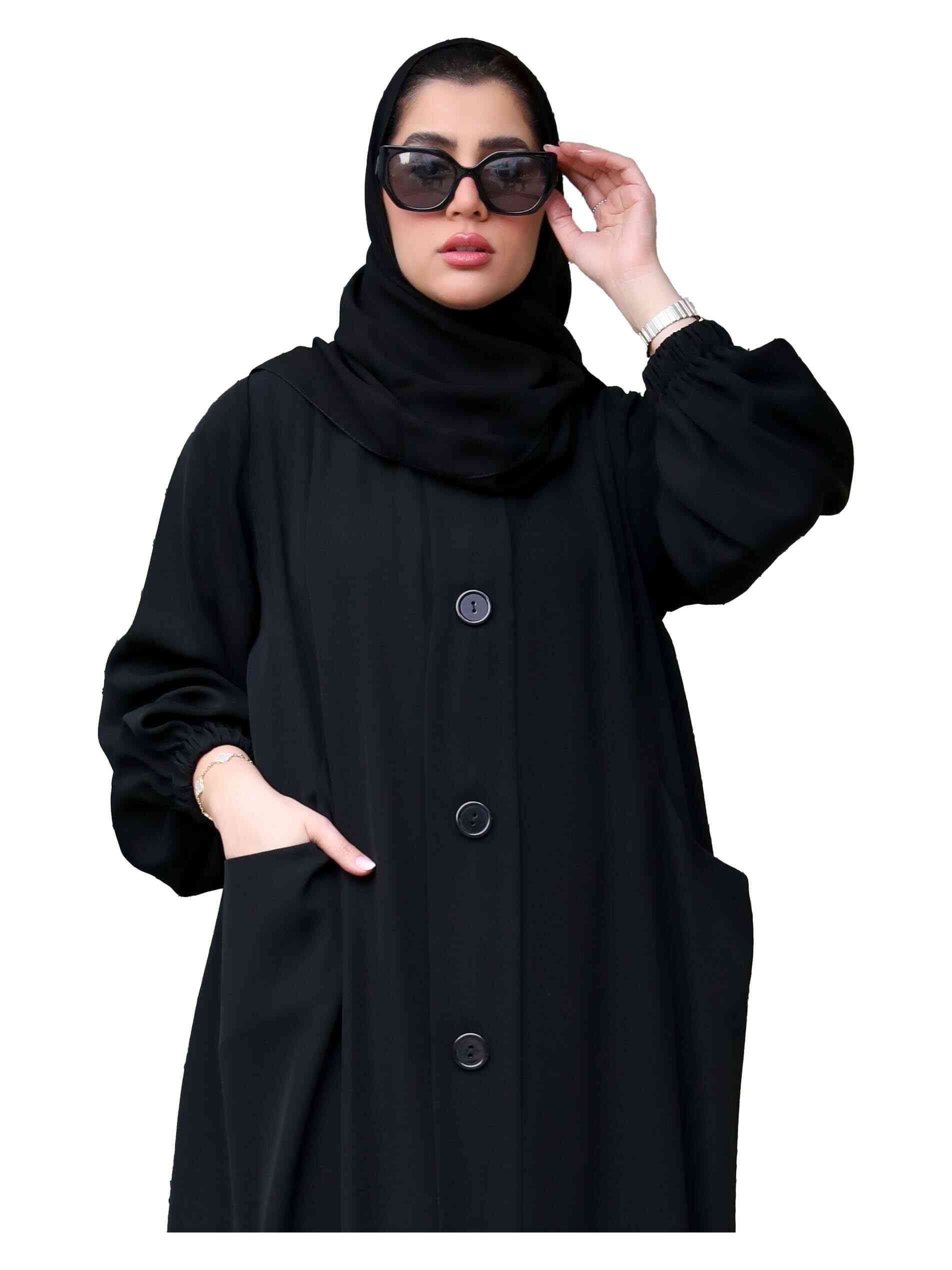 Embrace yourself with this classic black A-line Abaya. Crafted from soft inter-net fabric, it offers a nice comfortable look, suitable for last minute plans as it suits all casual occasions with its plain simple design, unique with its delicate buttons, that elevates the Abaya. This Abaya is a must-have for your basic summer wardrobe.