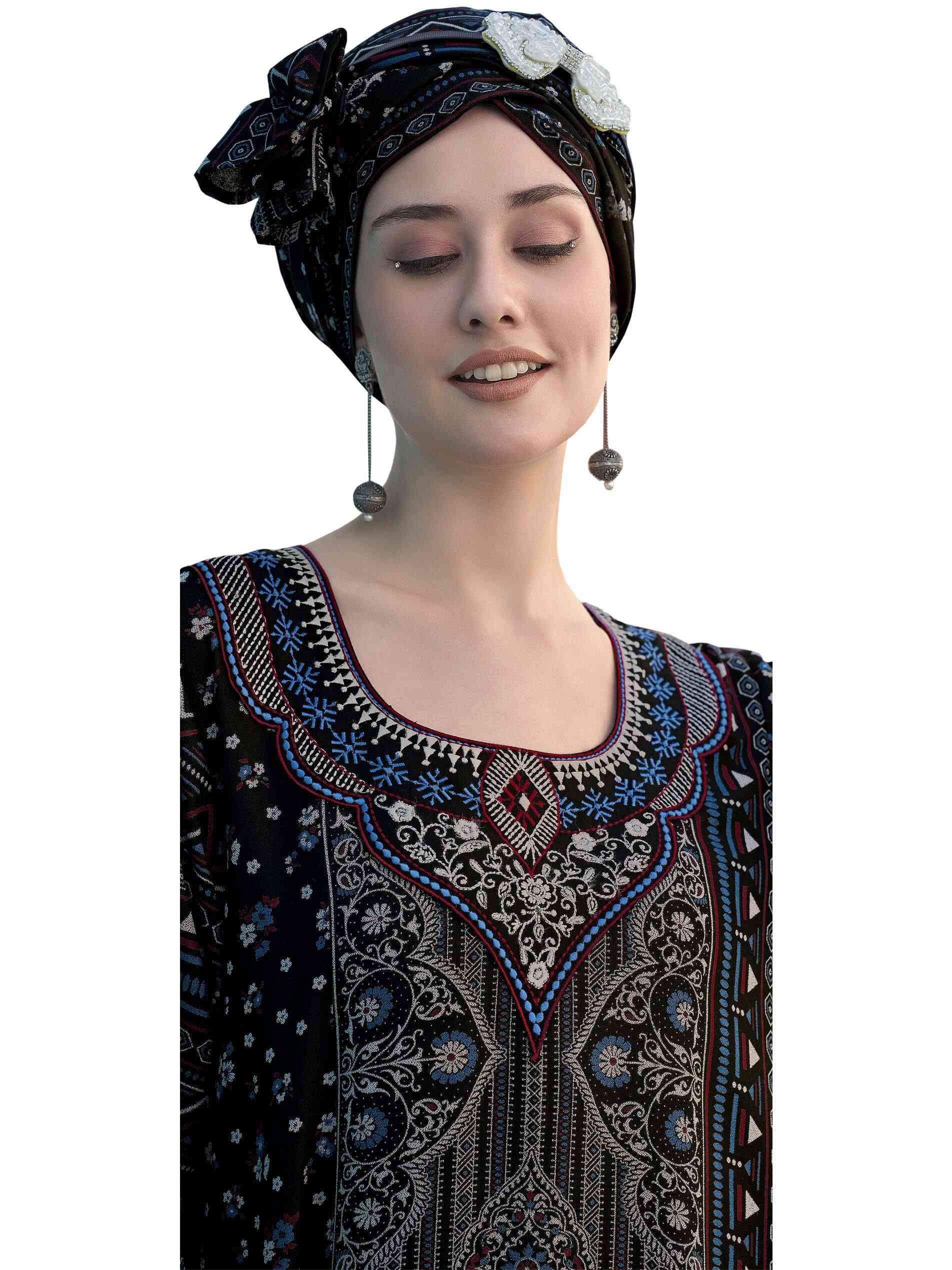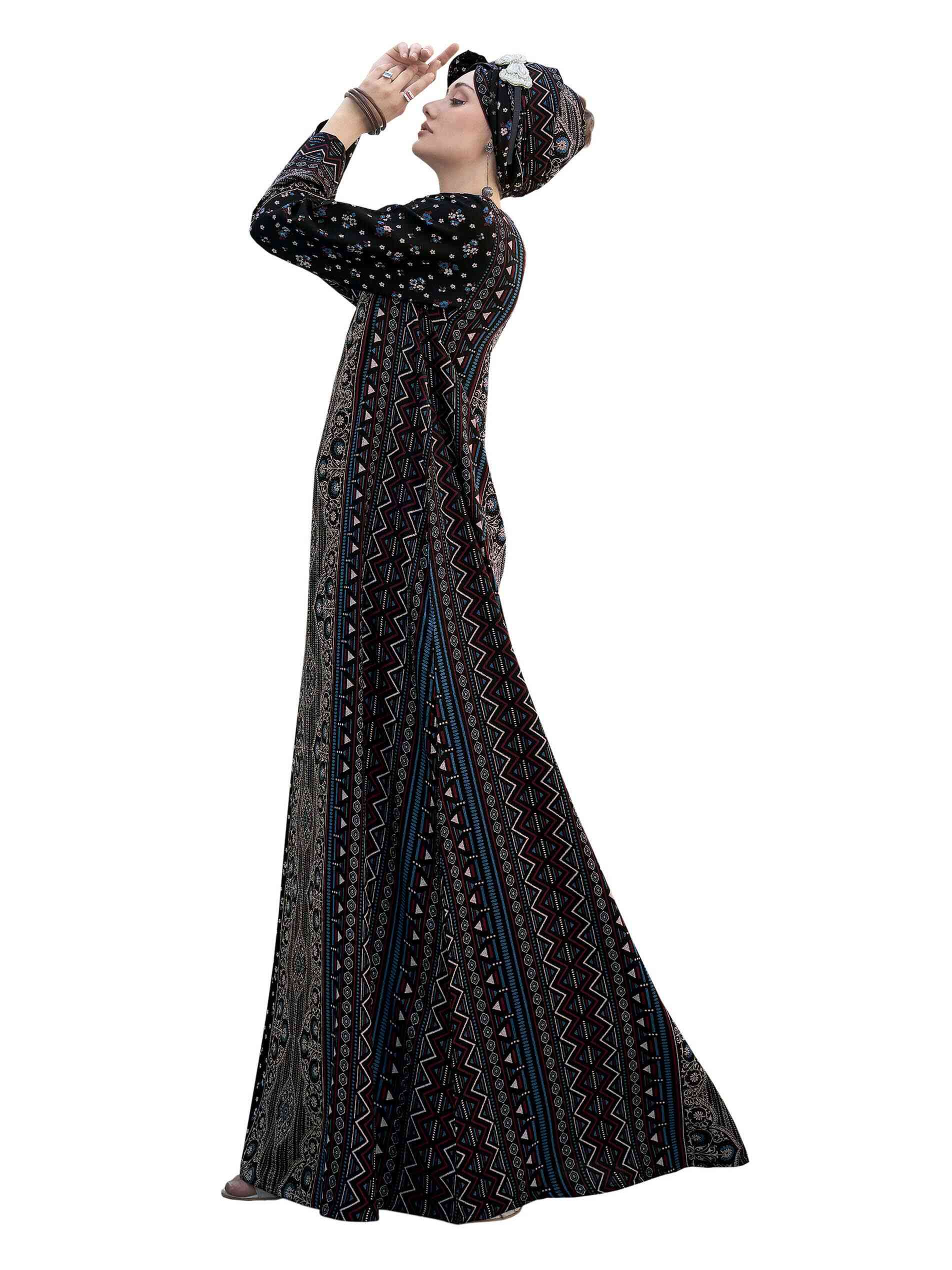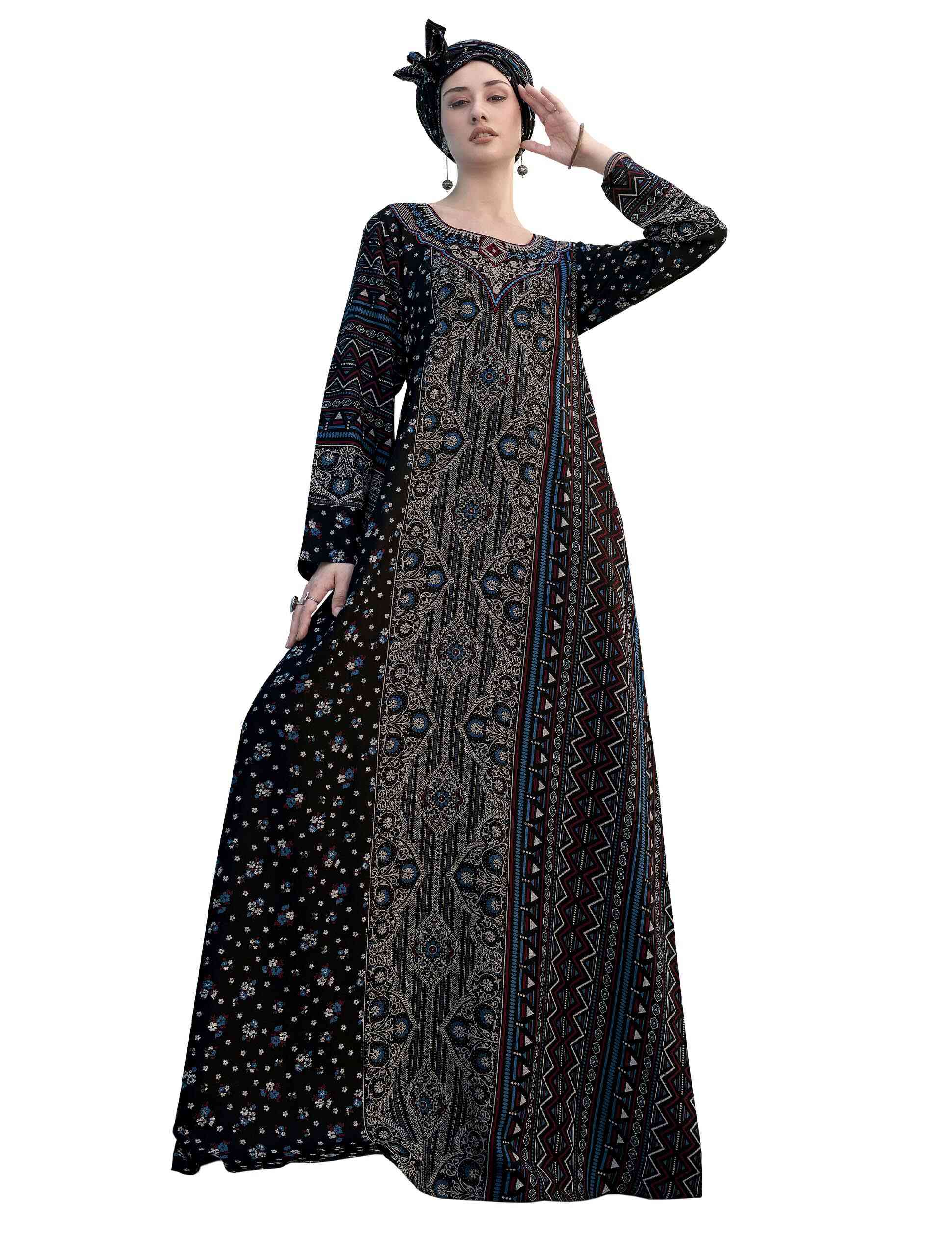 A merger of flowers and geometry, insterspersed with stripes and arabian designs. That's the stunning black jalabiya in full length of red, blue and white on black Alpine. Adress your summer mood swings with this very cheerful daraat that comes in full sleeves, A-line styling and round neck.