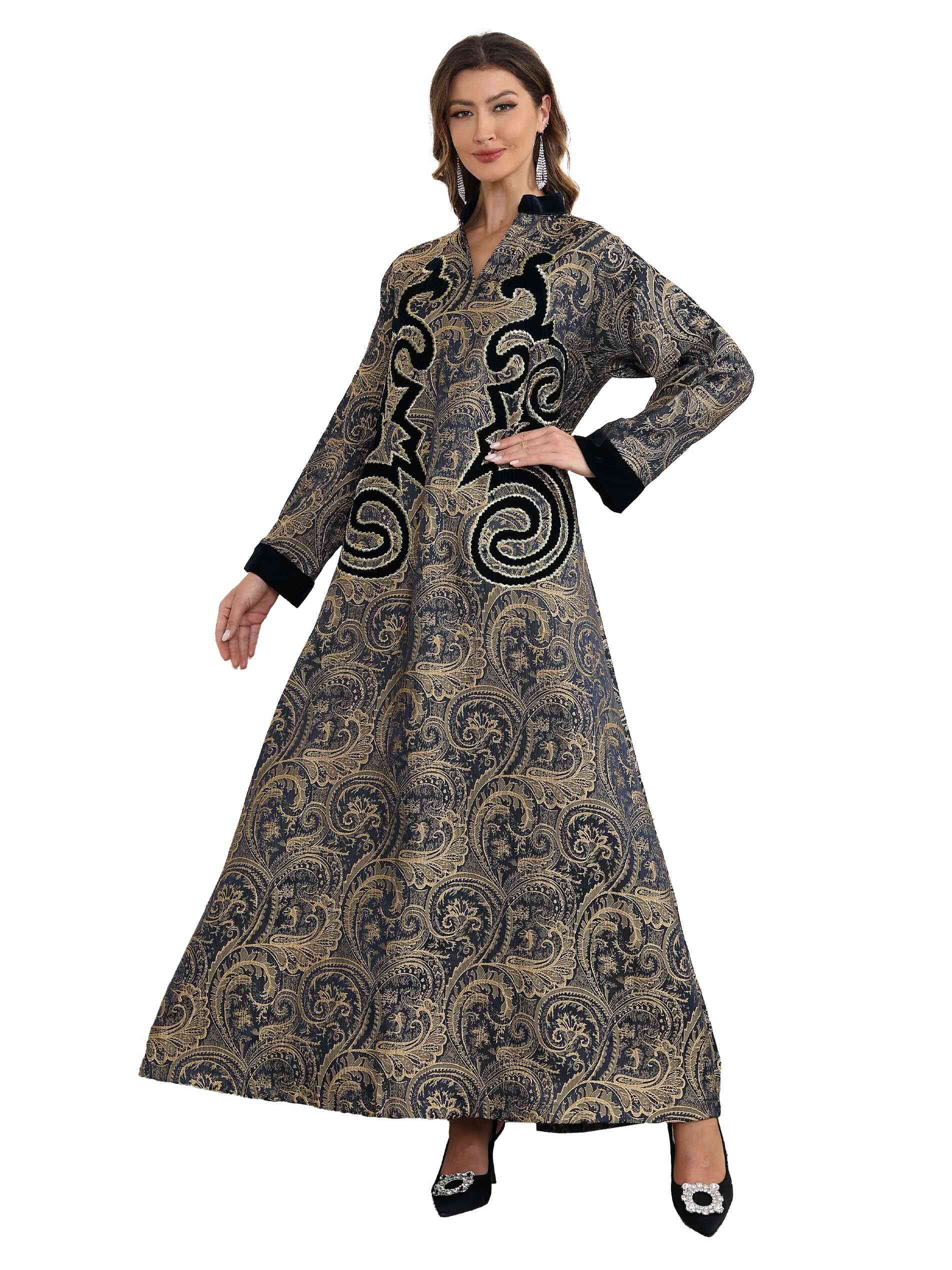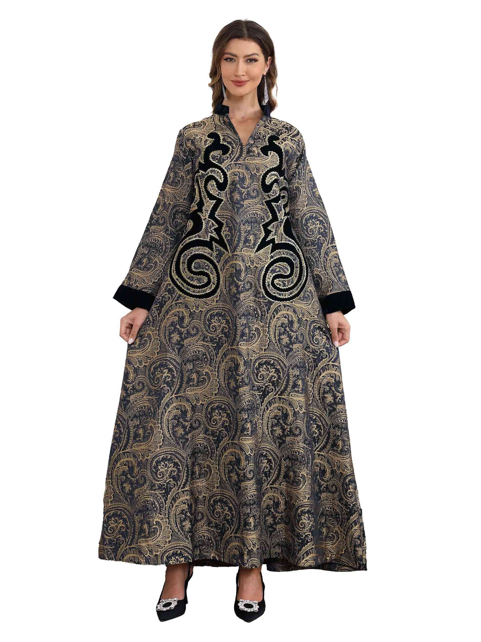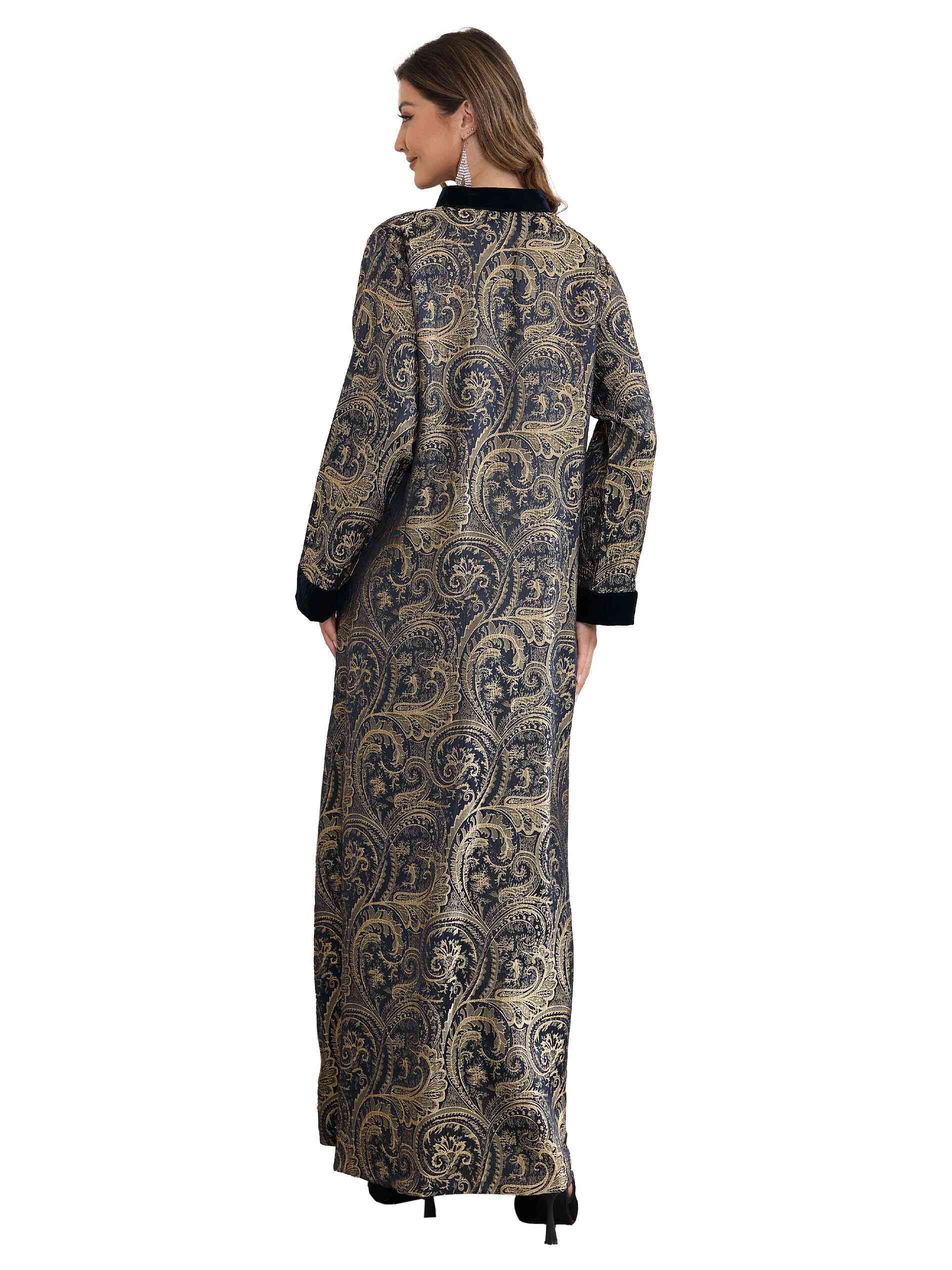 Navy Blue is the colour for those who want to spread an aura of ultimate festivity this winter. The Sara Jalabiya styled in navy blue is a full length of winter wonder with beige floral print and a dash of black to add to the styling. Full sleeves, V neck and A-line pattern make the winter jalabiya from Sara look perfectly snug.