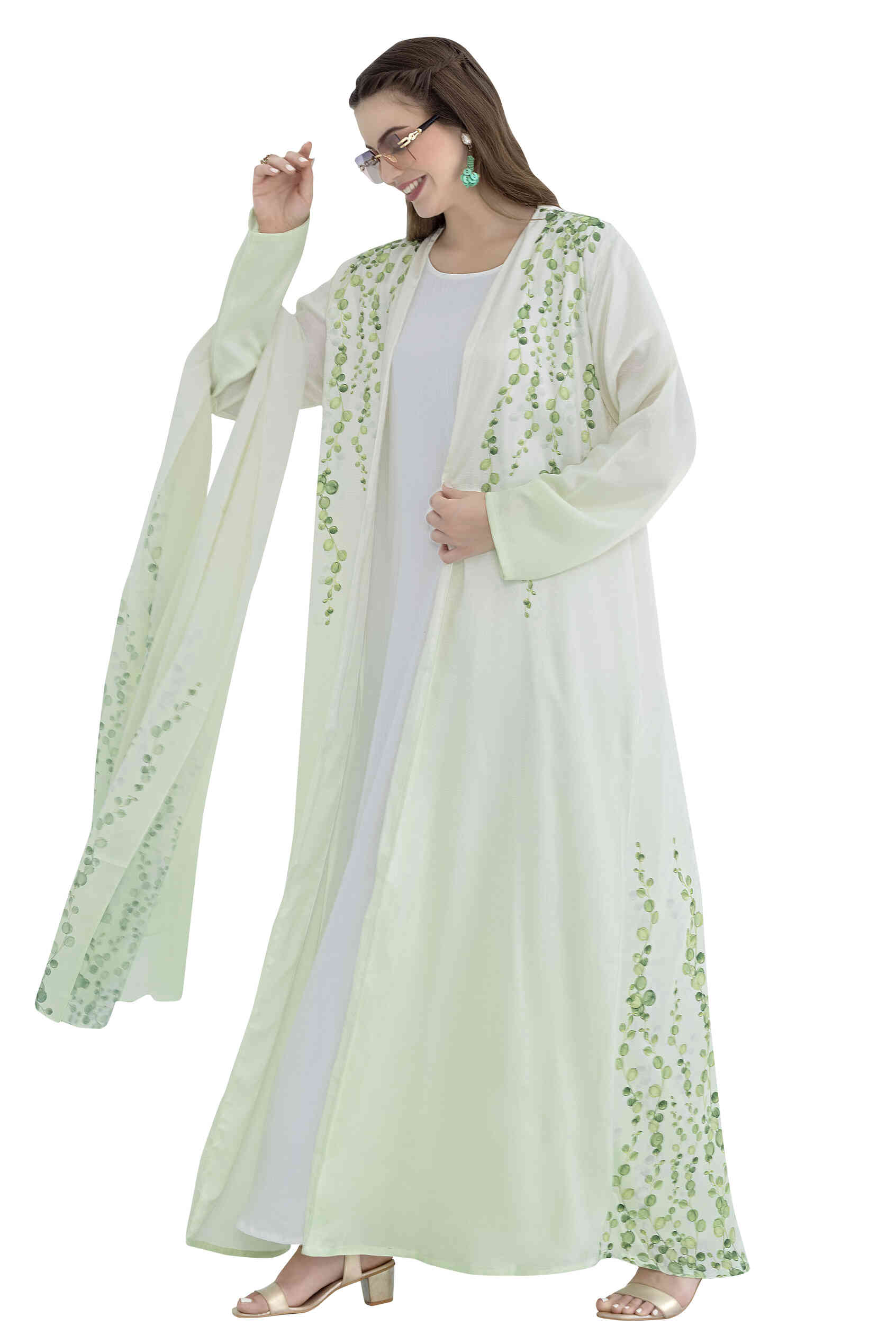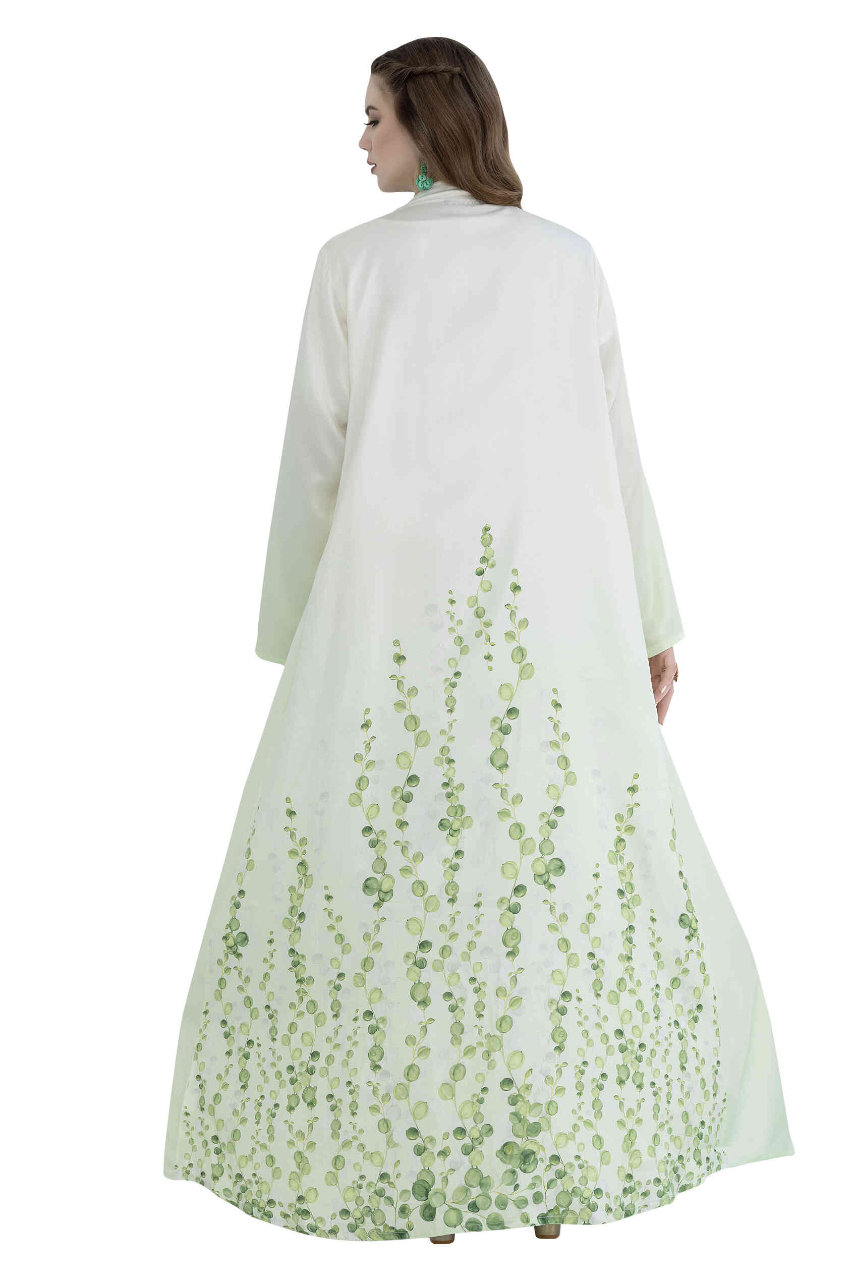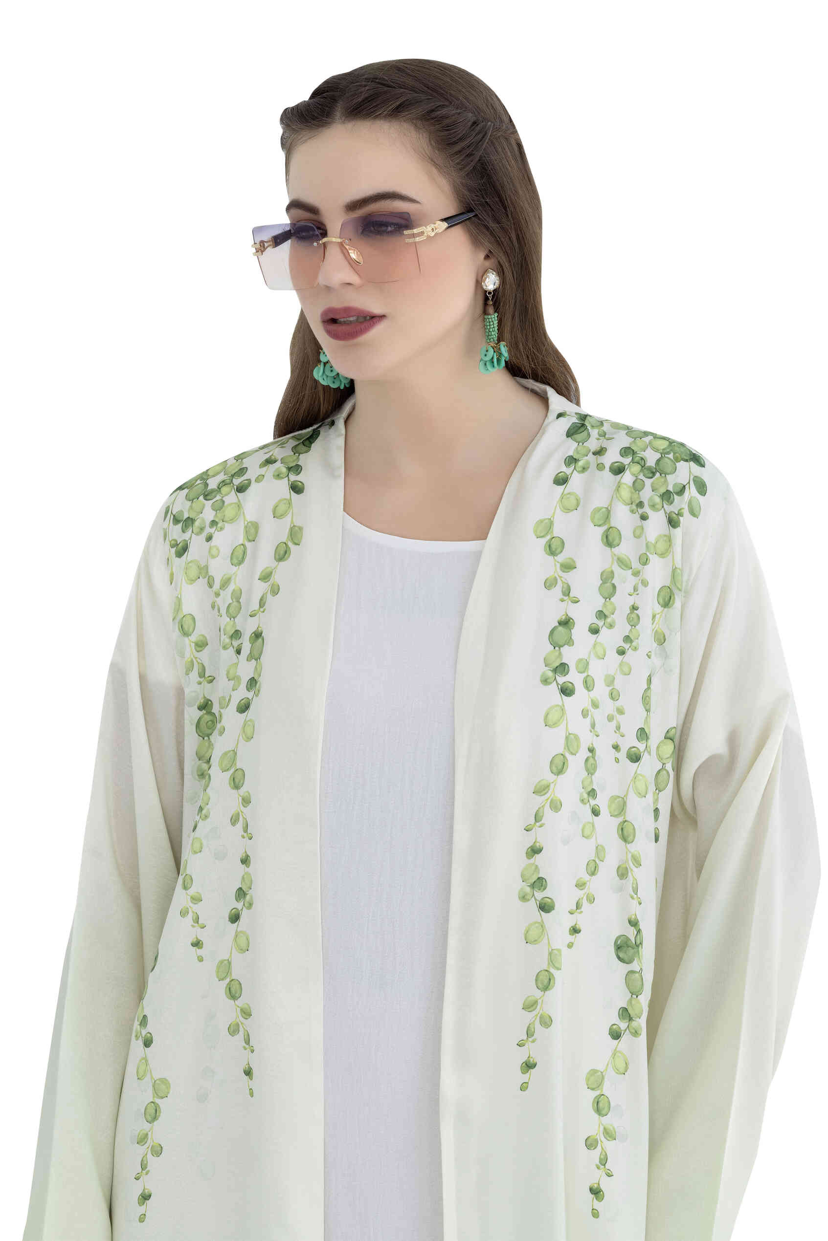 A breathtaking abaya intricately adorned with selectively printed vibrant feathers, adding an extra layer of elegance.